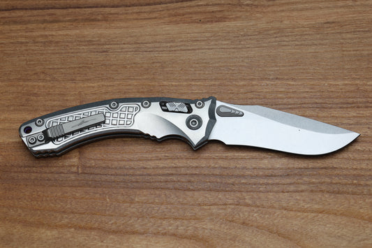 MICROTECH MARFIONE SELECT AMPHIBIAN RAM LOK TITANIUM FRAG HANDLES & STONEWASH M390MK W/ DOUBLE VAPOR BLAST & PURPLE ACCENTS 137RL-10FRMS3