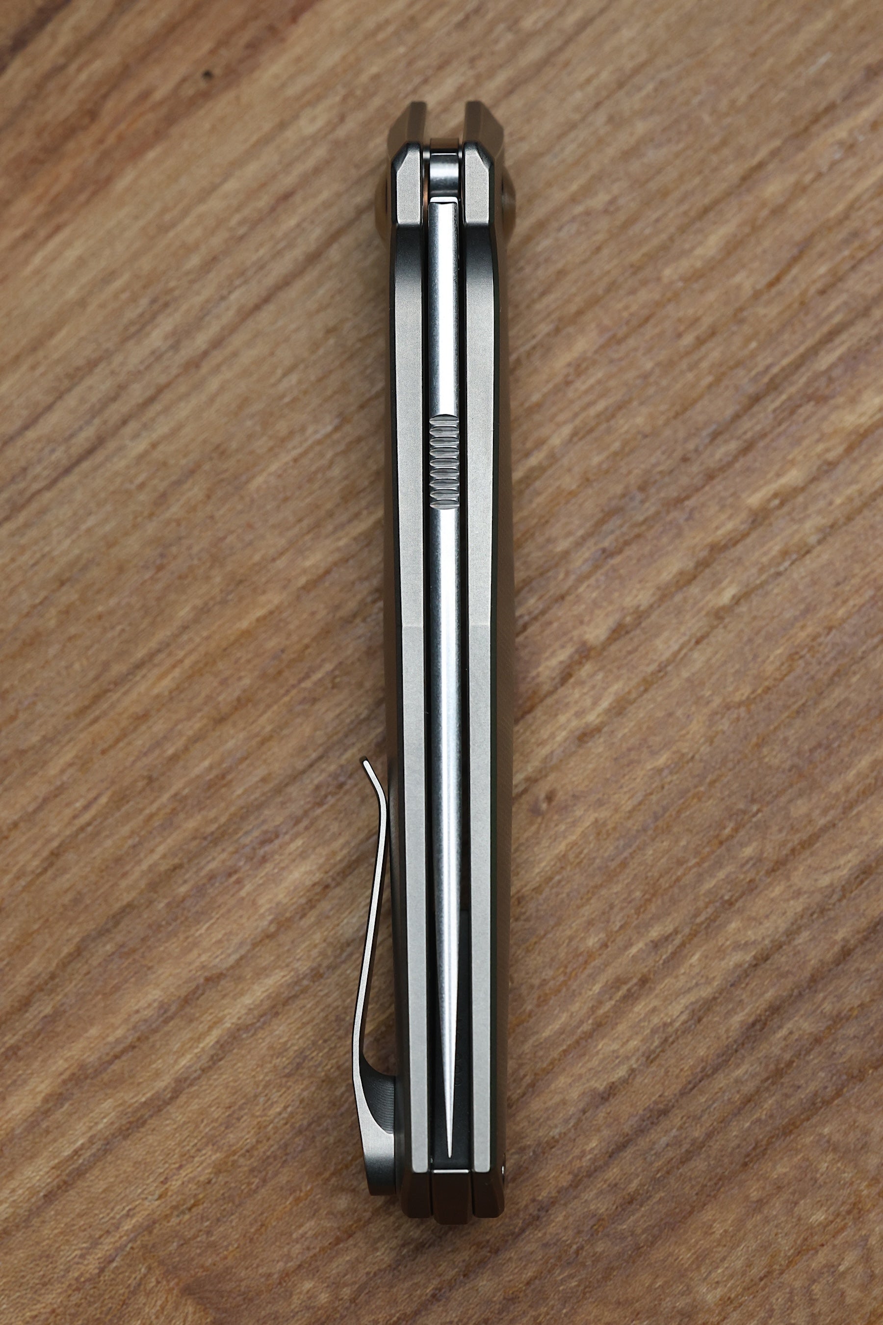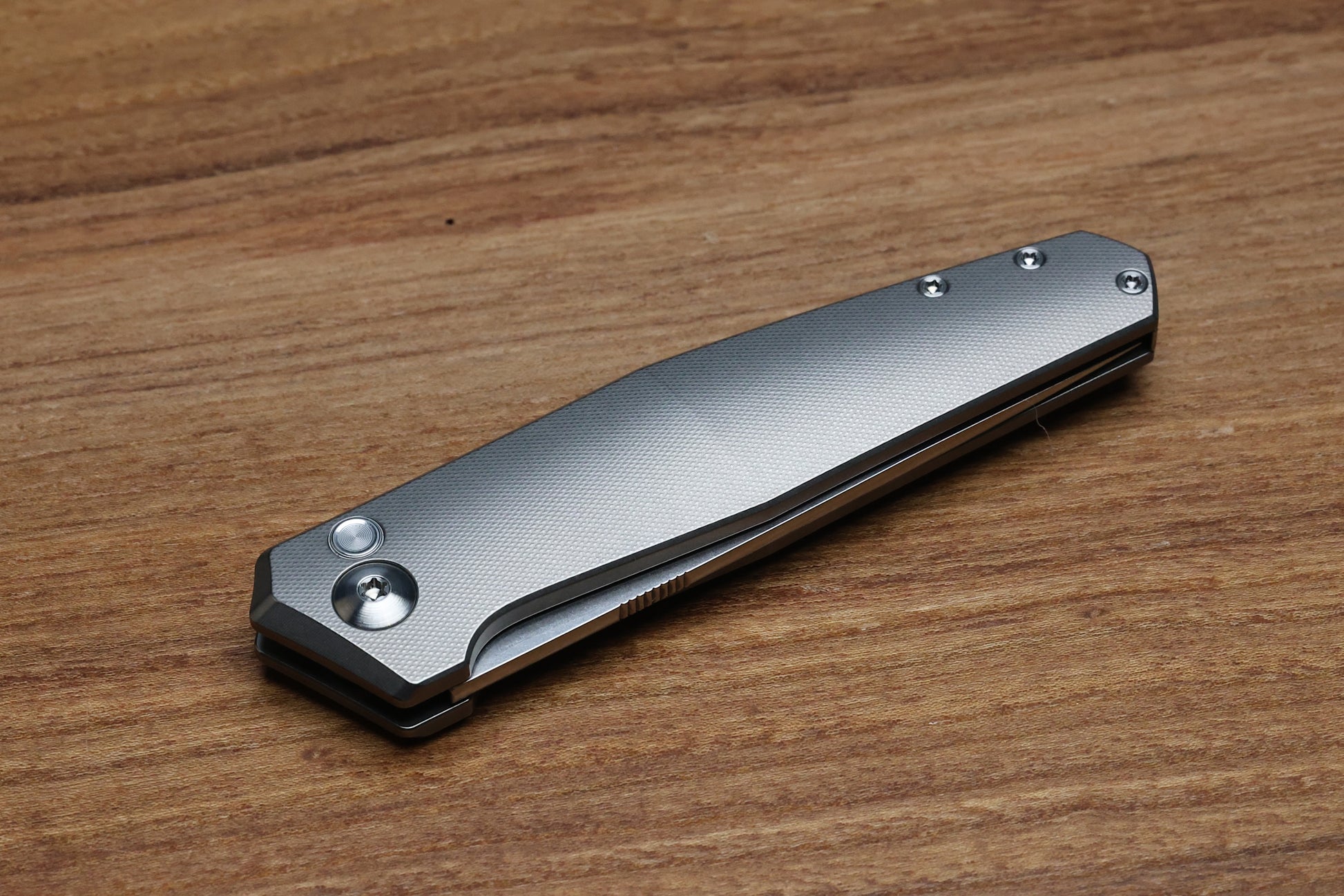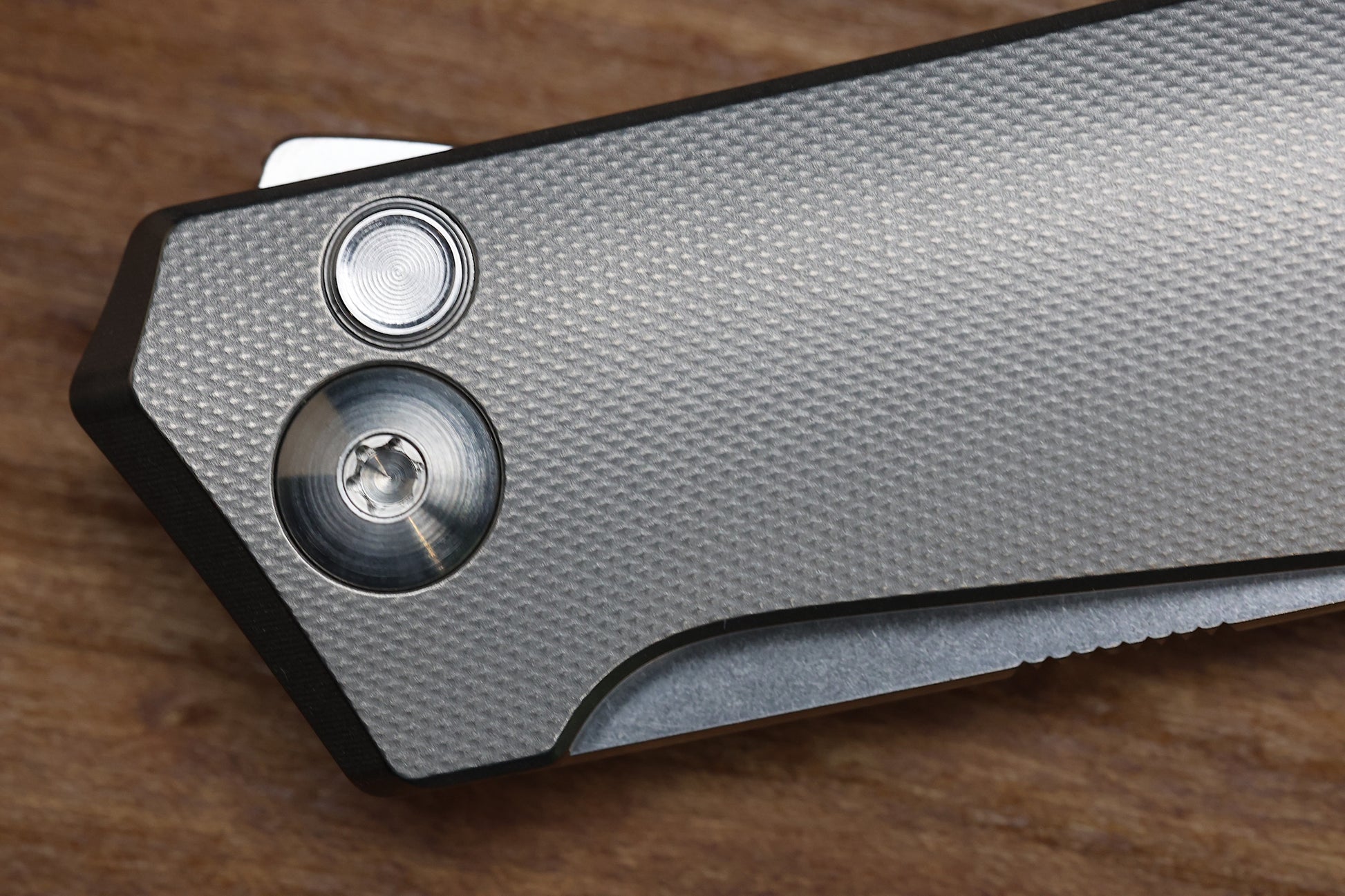 - Grey finish Titanium handle scales with fine textured milling pattern