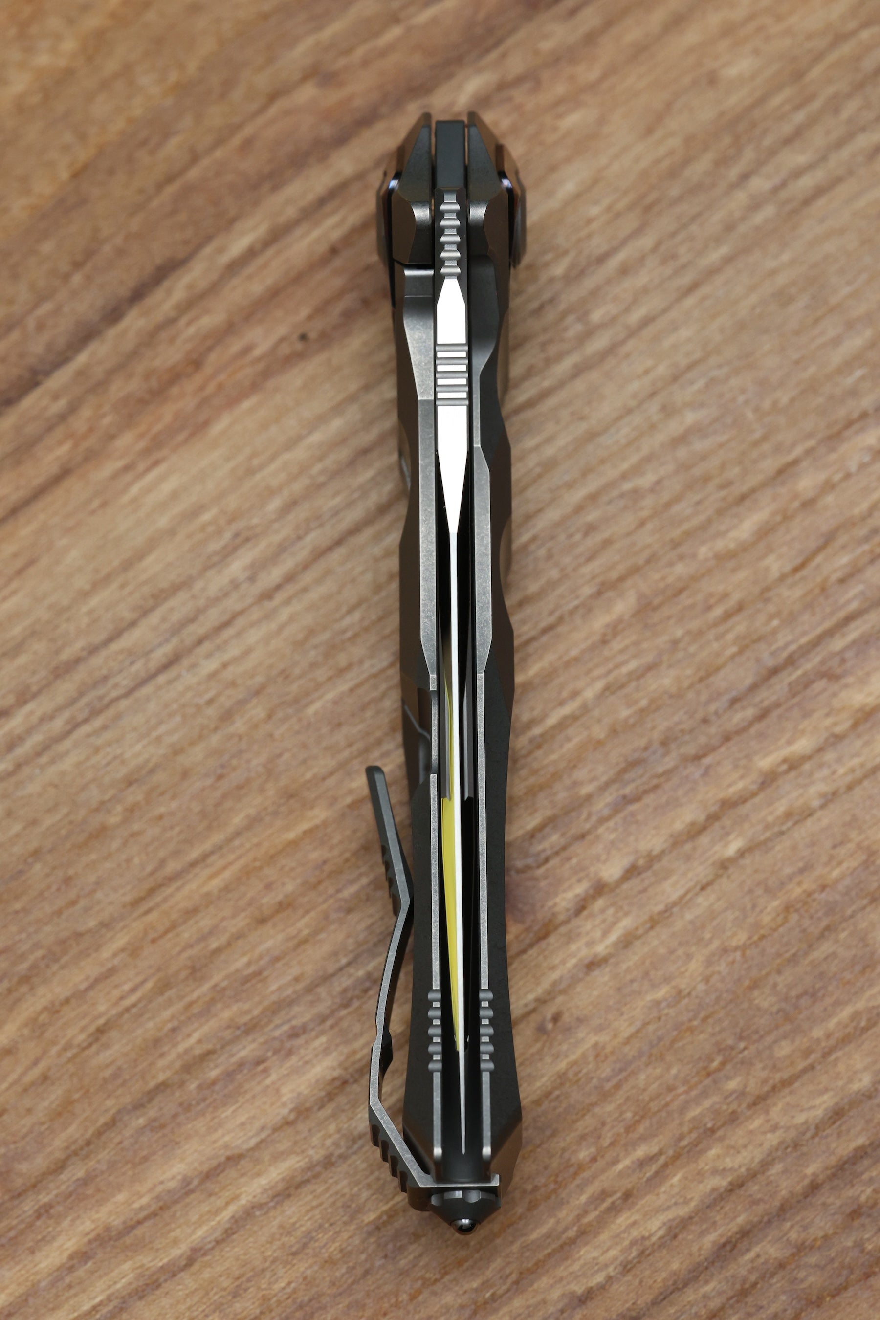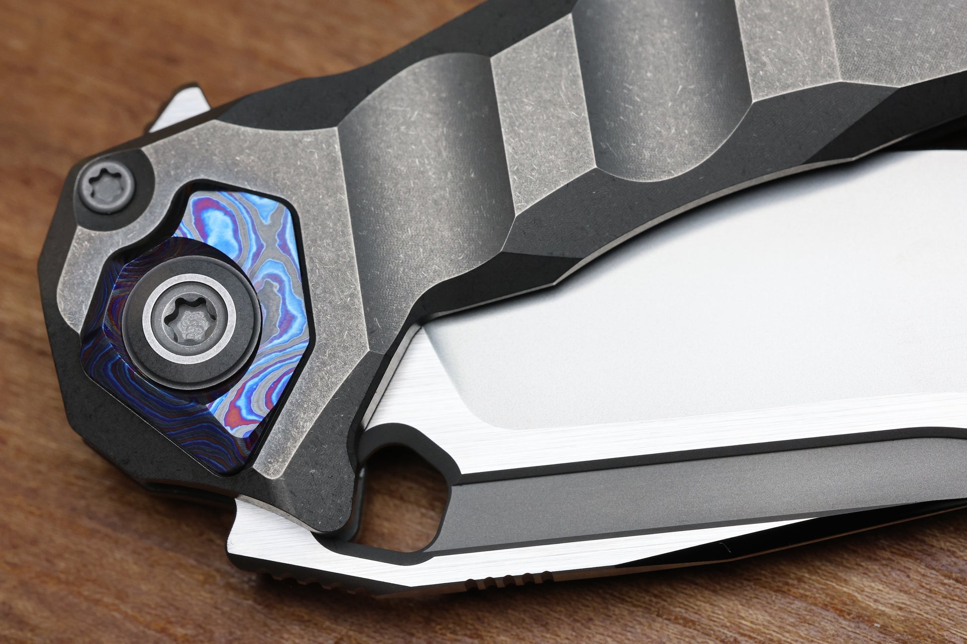 This version will have a CKF wash M398 blade with a mirrored swedge. It will have a one piece integral titanium handle with ZircuTi accents around the pivot, shown in the photos as a brown color. The glass breaker is removable, if you prefer, and it comes with a screw to put in its place if needed.
