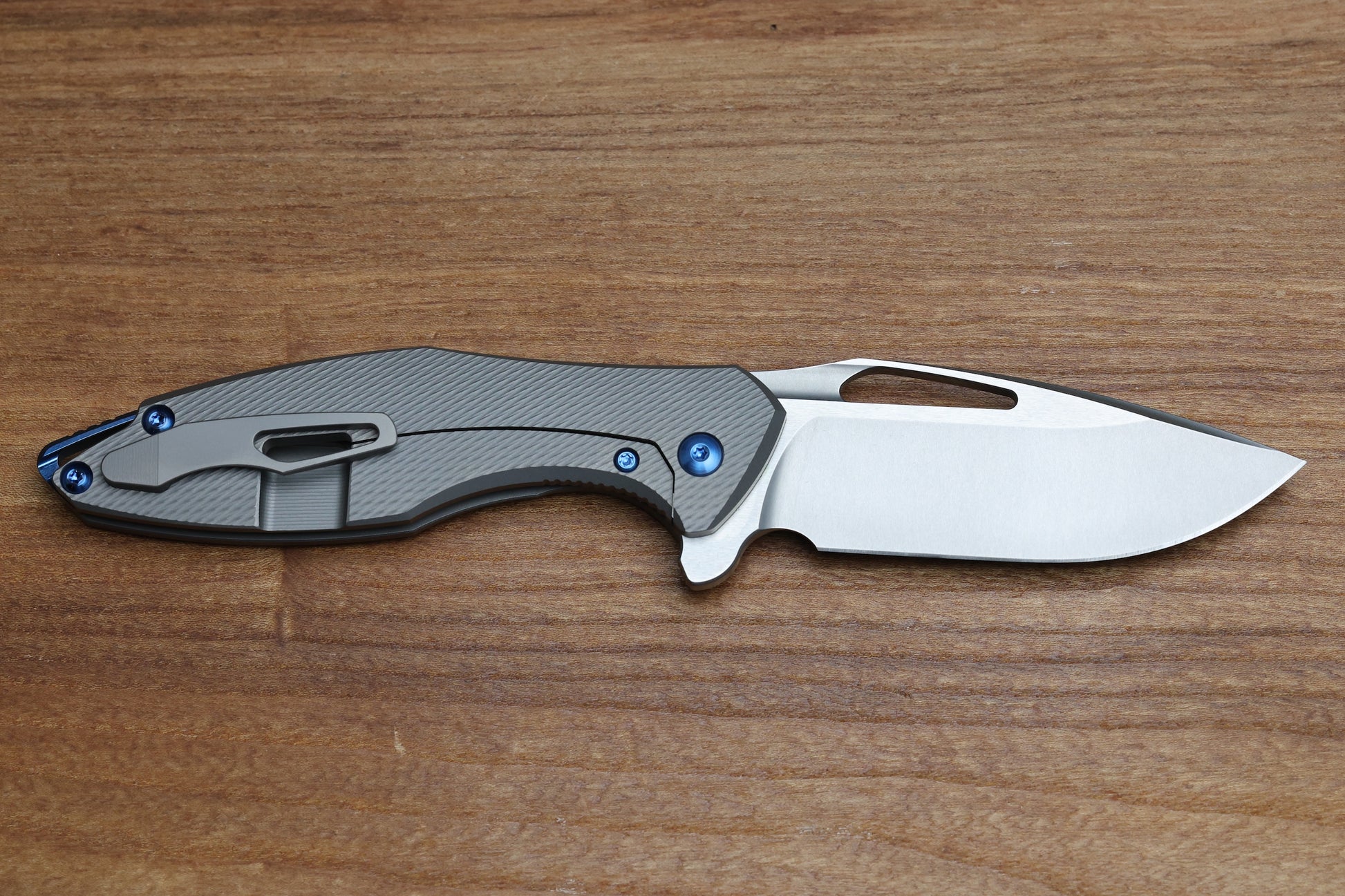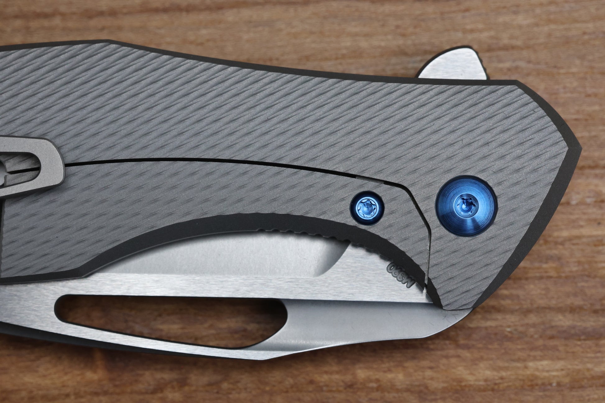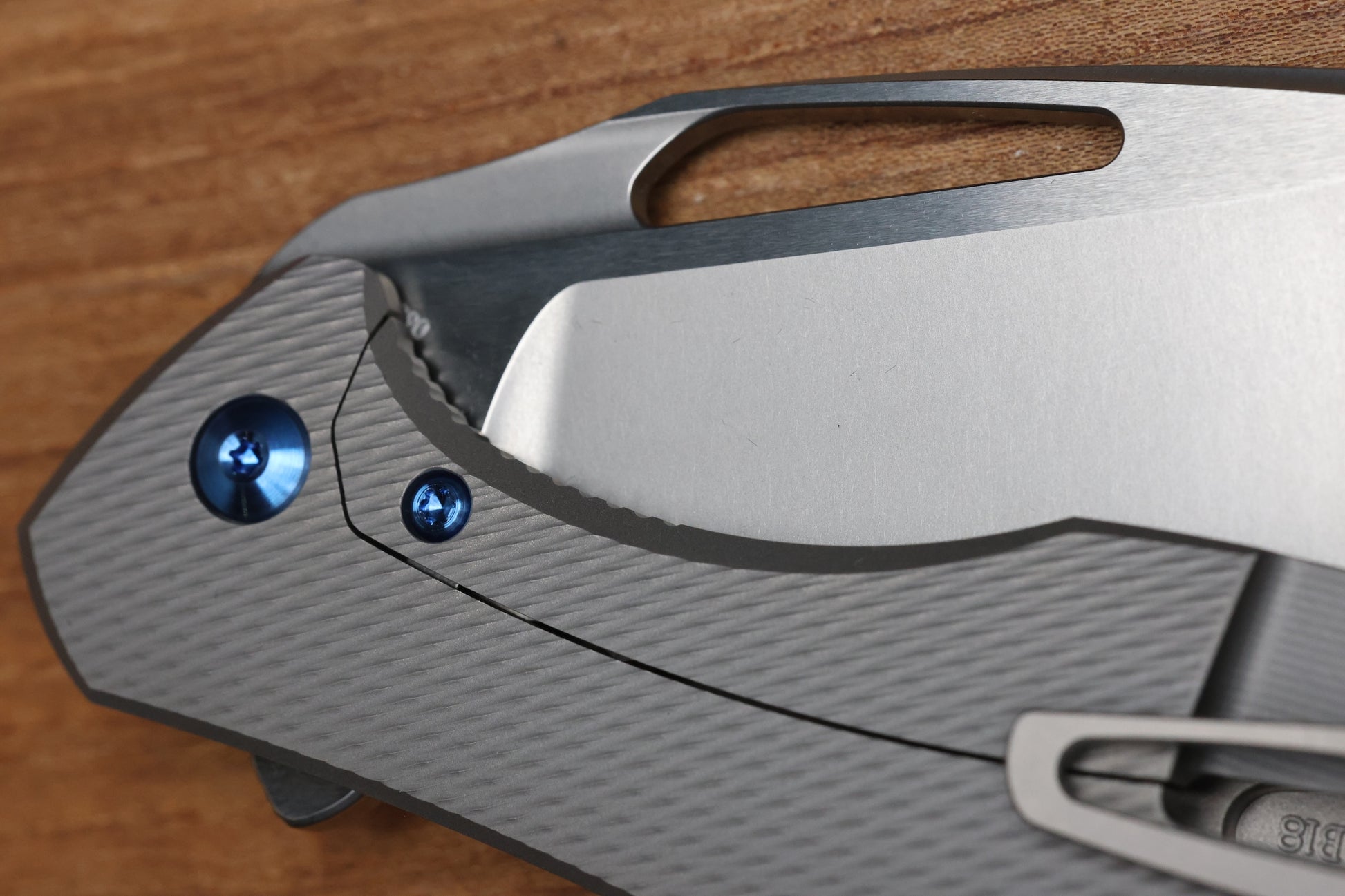 Blasted finish Titanium frame lock handle scales with Corda milling pattern