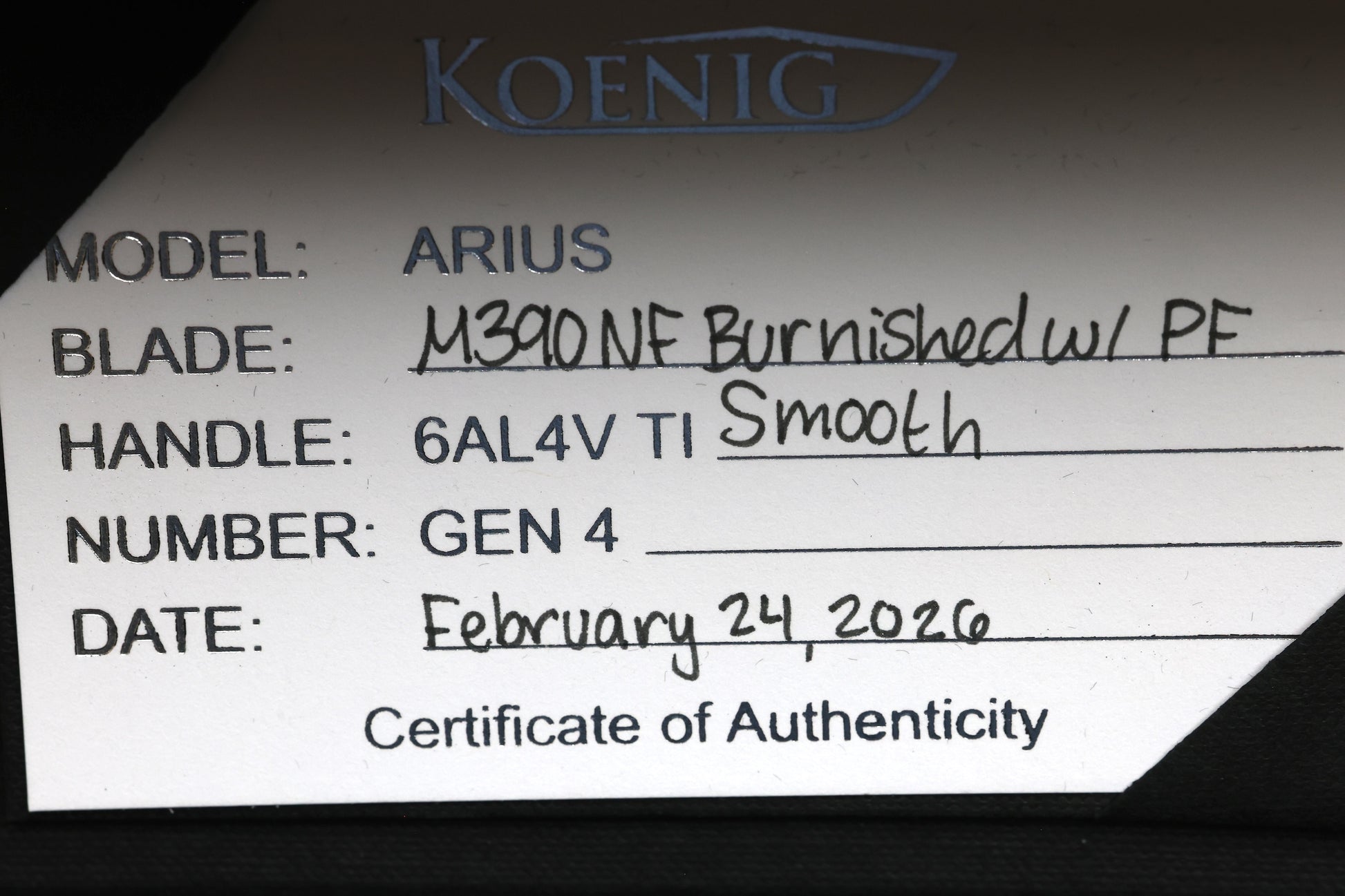 KOENIG KNIVES ARIUS - NON FLIPPER - SMOOTH TITANIUM HANDLE - SILVER HARDWARE - BURNISHED W/ POLISHED FLATS M390 BLADE