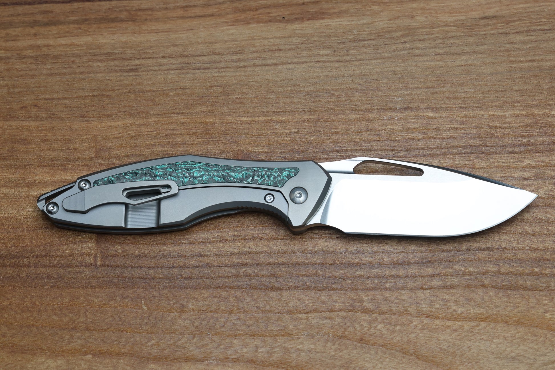 - Blasted finish Titanium frame lock handle scales with Teal Magnetic CarboTi inlays