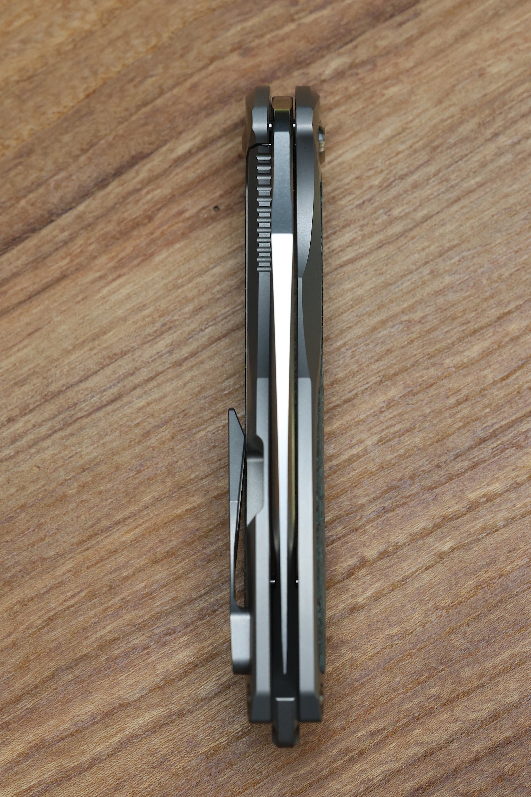 - Tip up stonewashed Titanium pocket clip with hidden screw