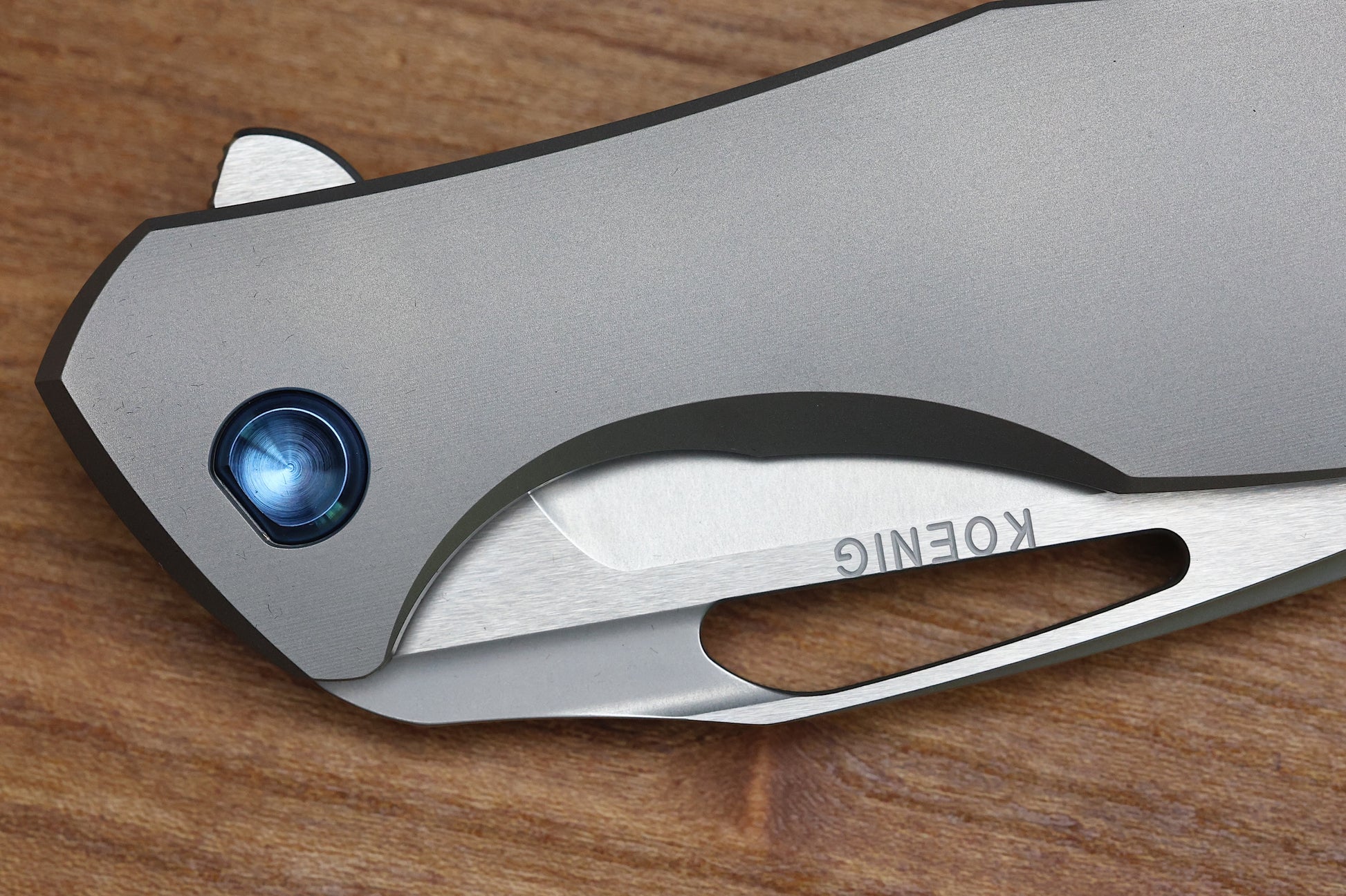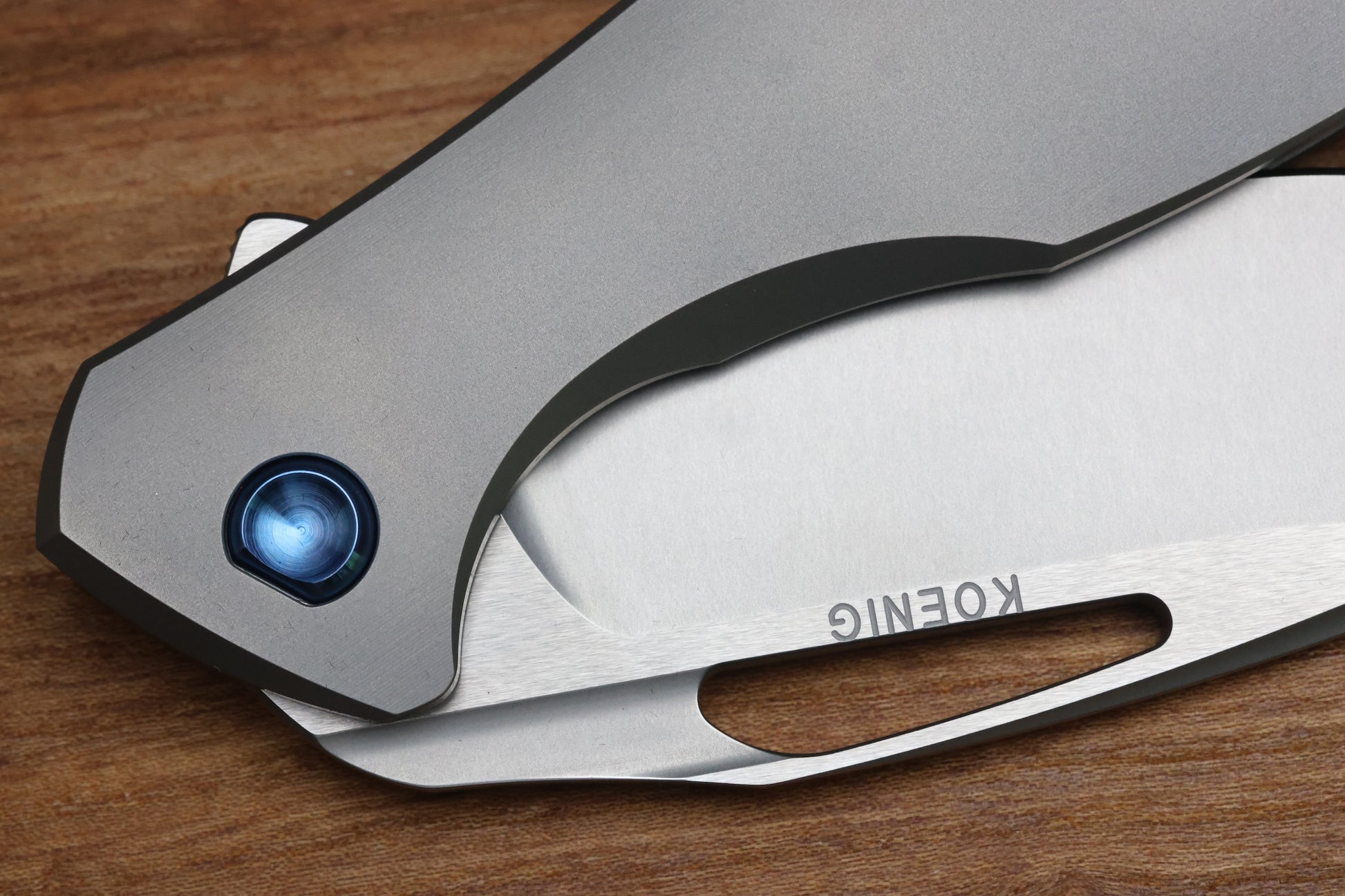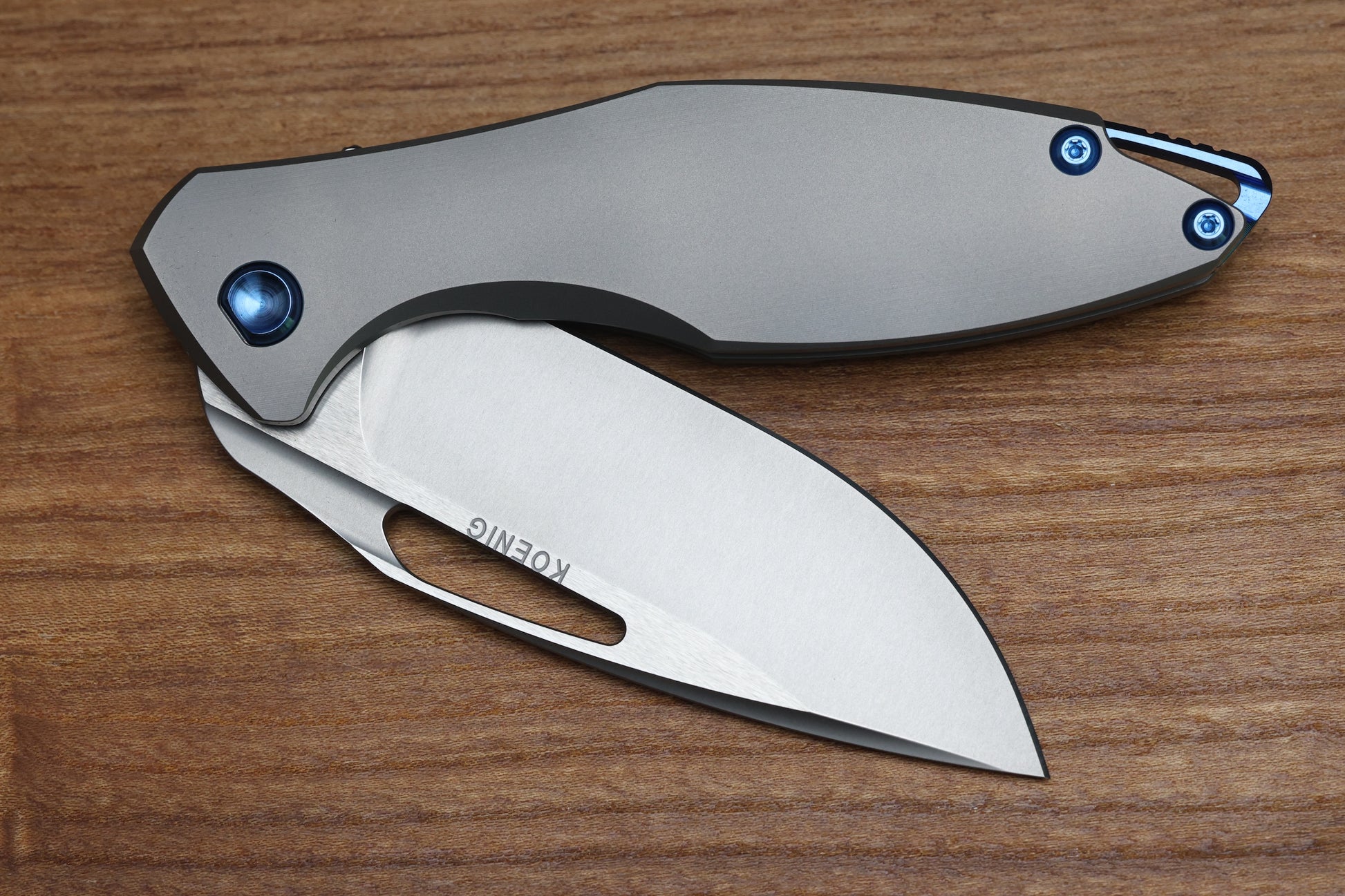 KOENIG KNIVES ARIUS – SMOOTH TITANIUM HANDLE – BLUE HARDWARE – BURNISHED W/ POLISHED FLATS M390 BLADE