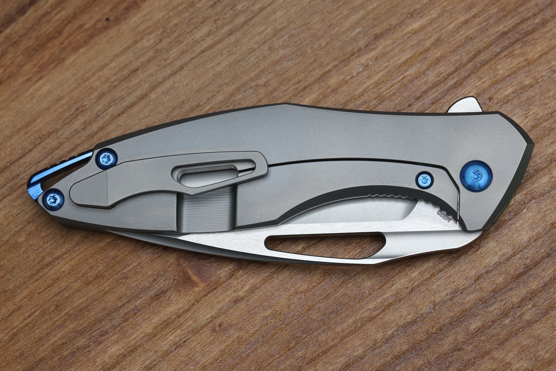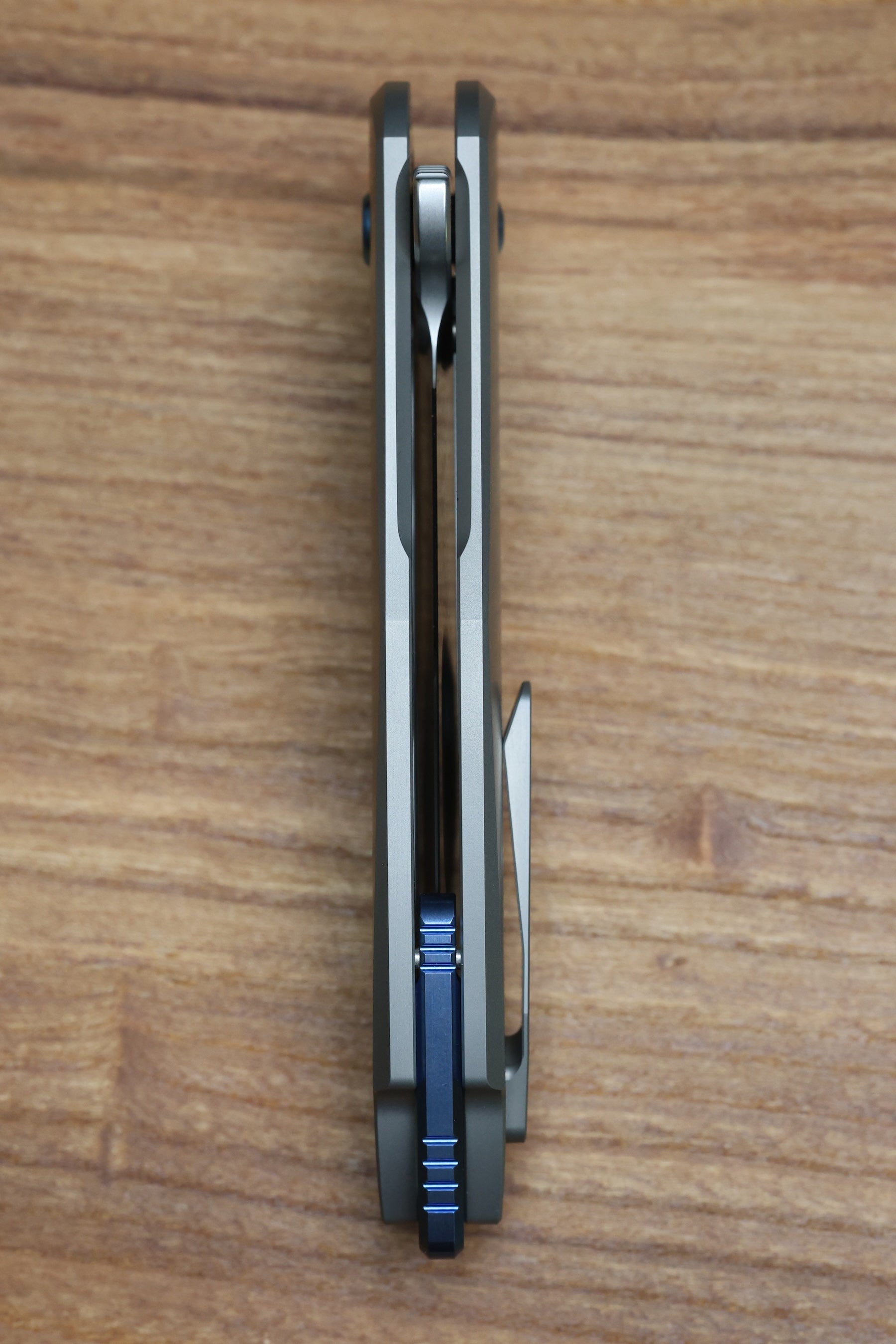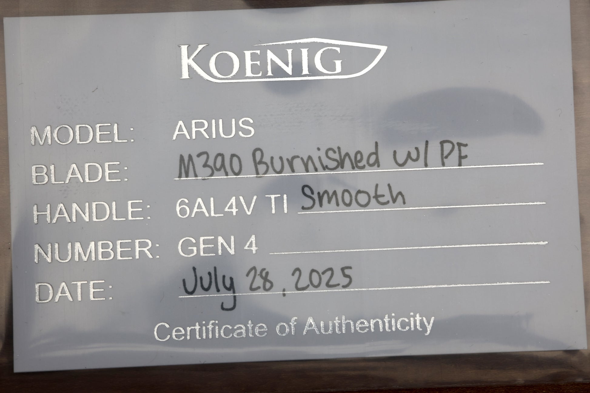 KOENIG KNIVES ARIUS – SMOOTH TITANIUM HANDLE – BLUE HARDWARE – BURNISHED W/ POLISHED FLATS M390 BLADE