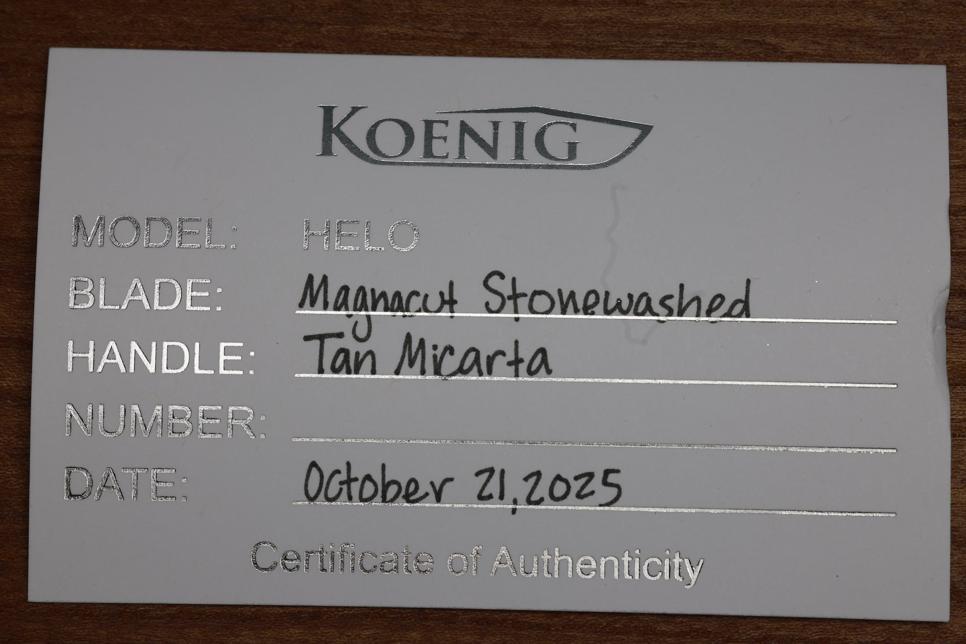 KOENIG KNIVES HELO - TAN MICARTA HANDLE - STONEWASHED MAGNACUT BLADE