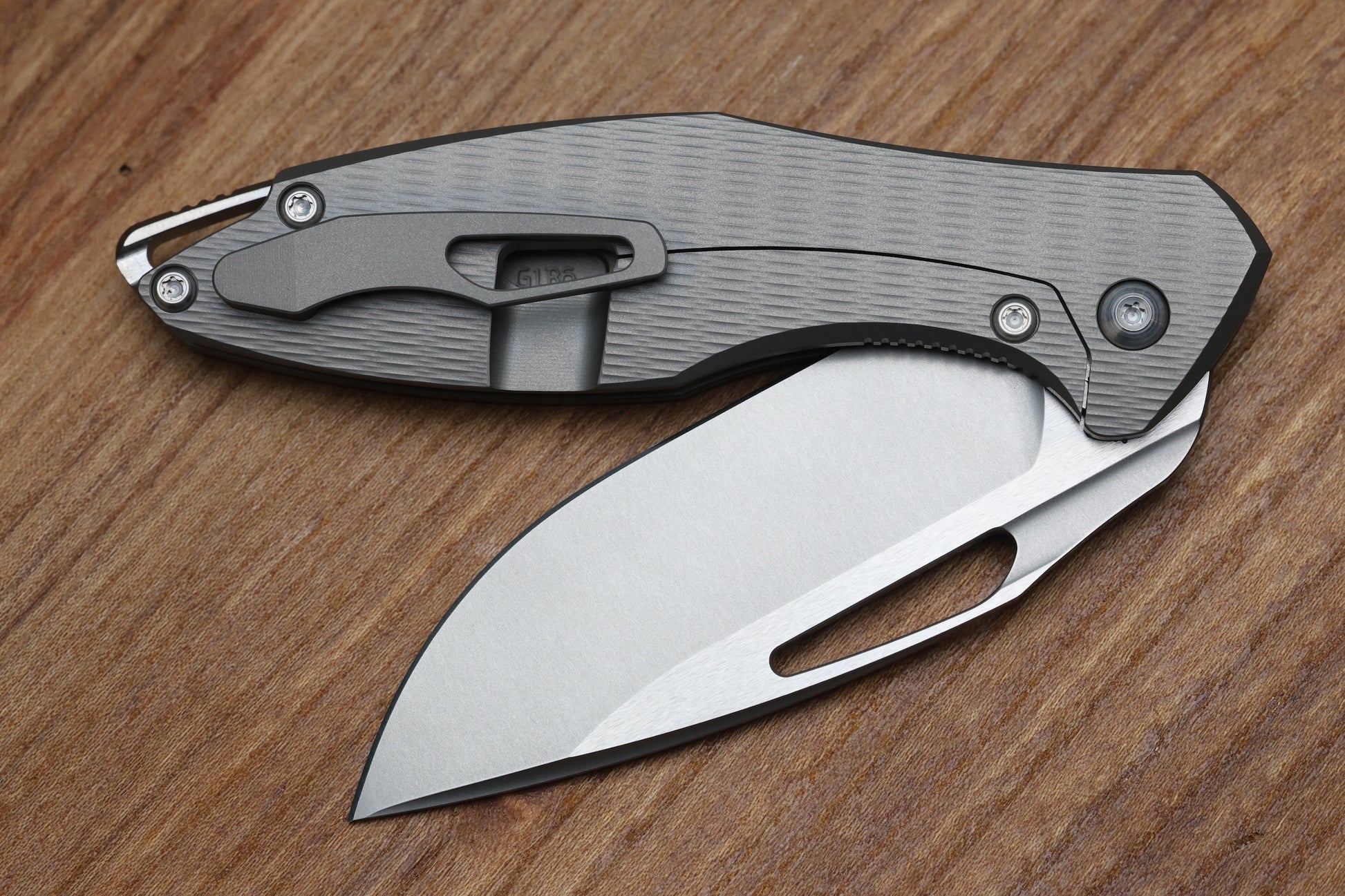 - Blasted finish Titanium frame lock handle scales with Plexa milling pattern