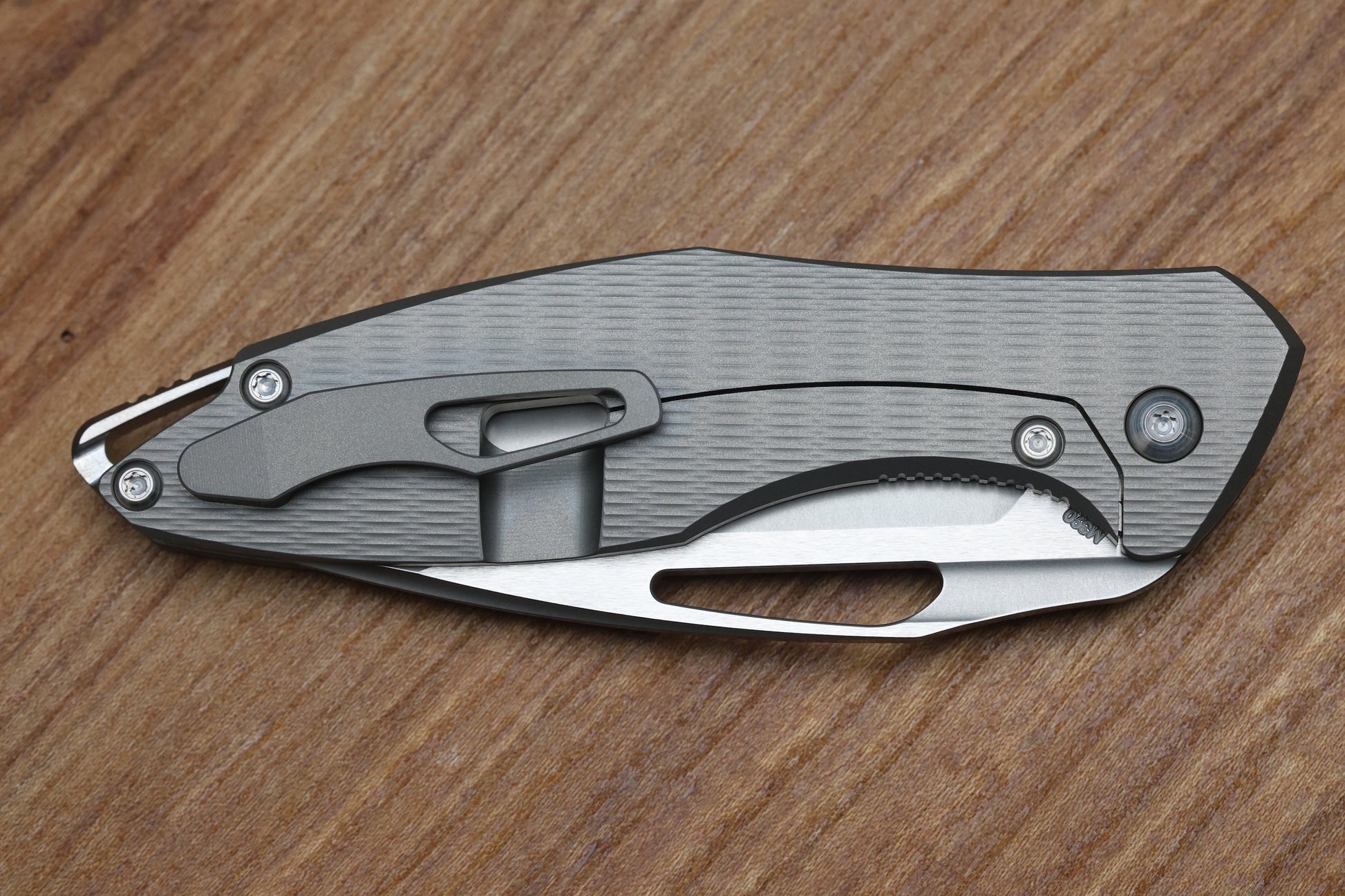 - Tip up blasted finish Titanium pocket clip with hidden screw