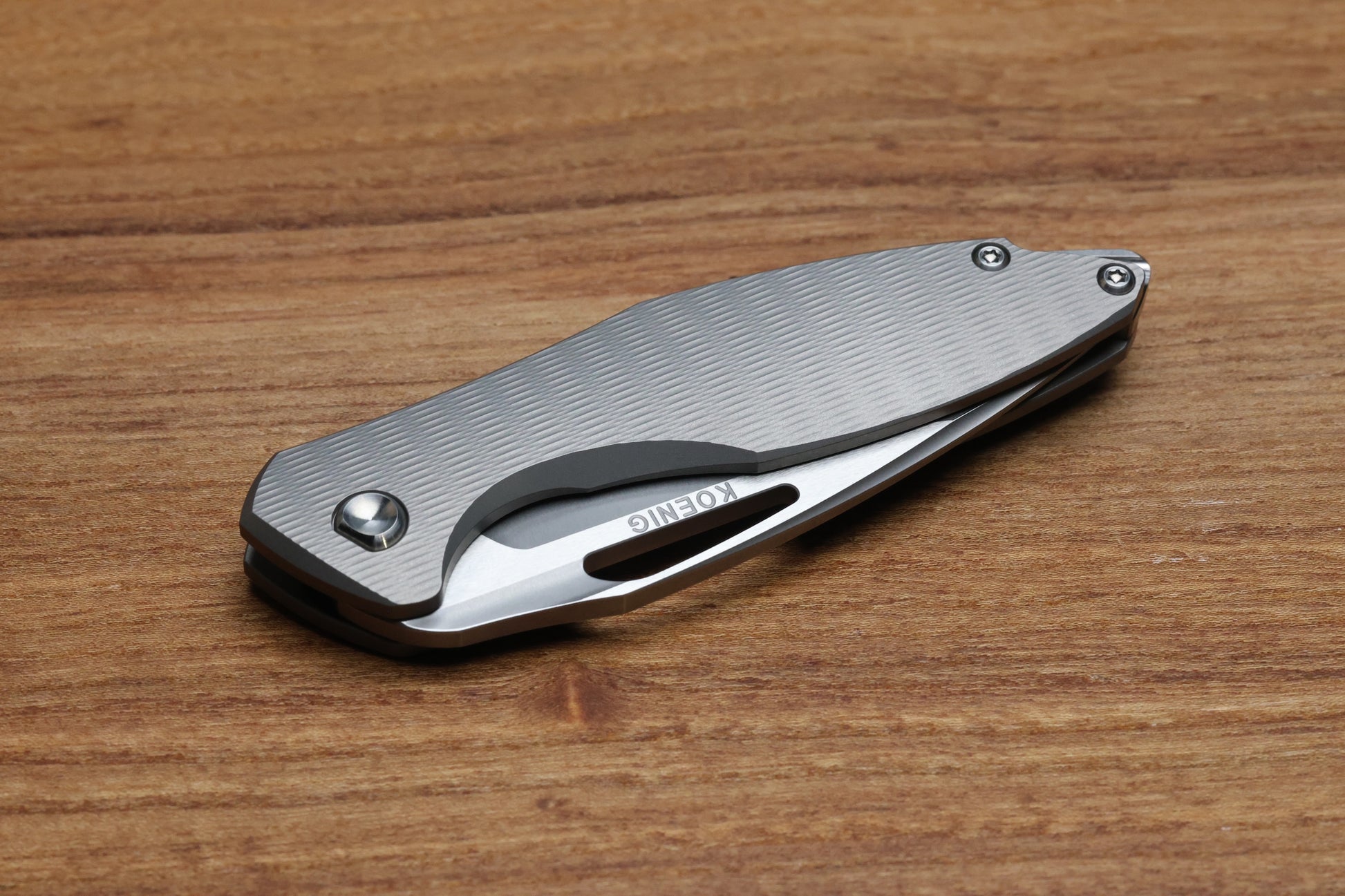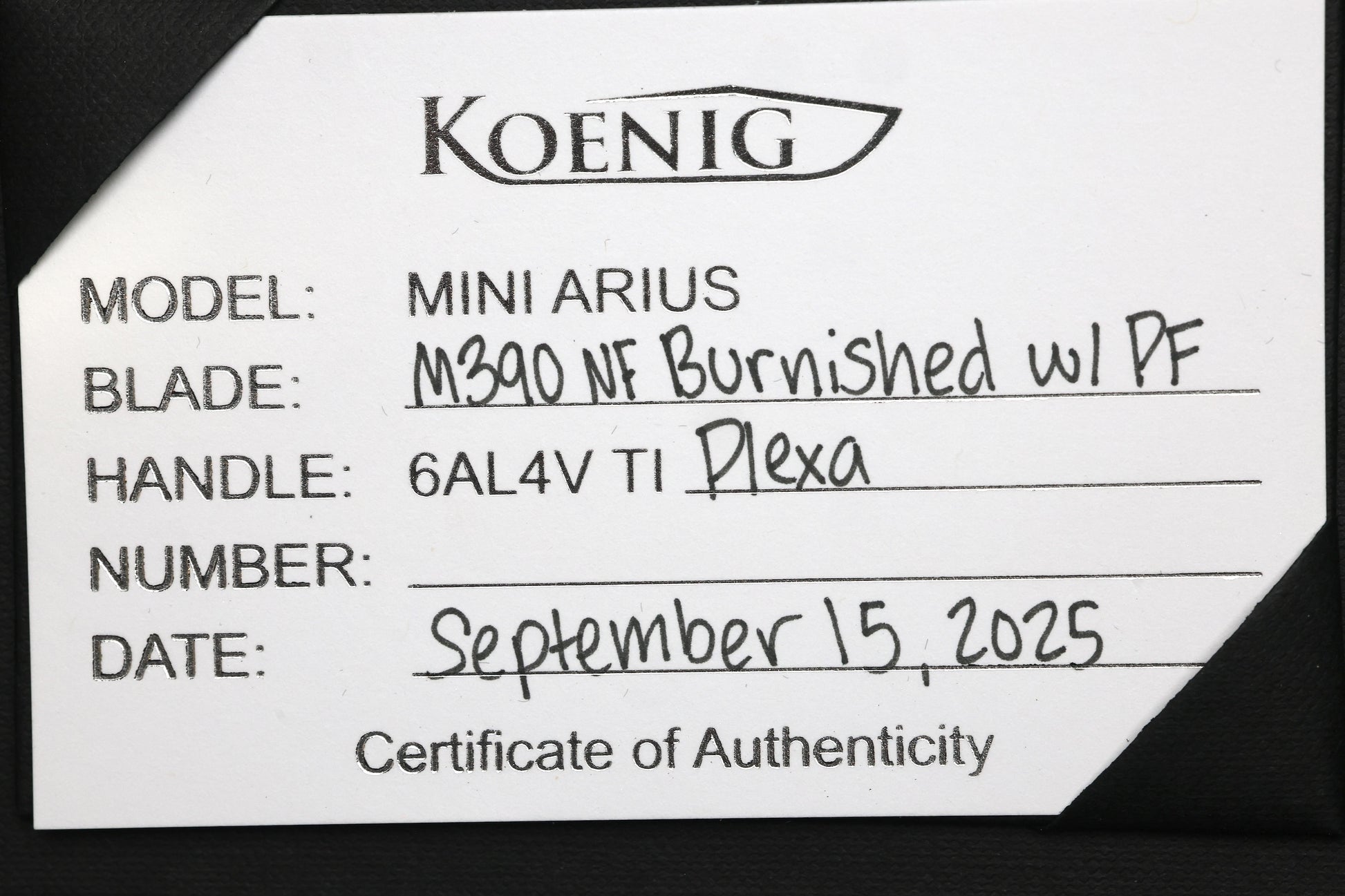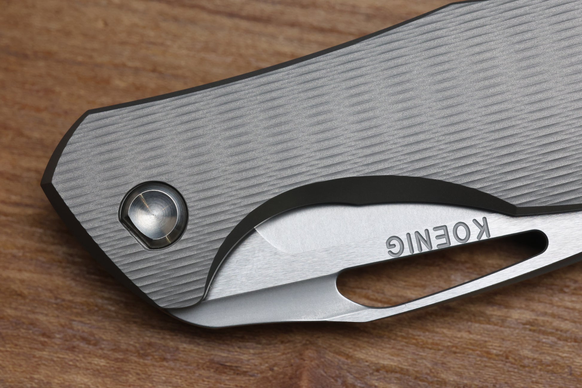 KOENIG KNIVES MINI ARIUS - NON FLIPPER - PLEXA TITANIUM HANDLE - SILVER HARDWARE - BURNISHED W/ POLISHED FLATS M390 BLADE