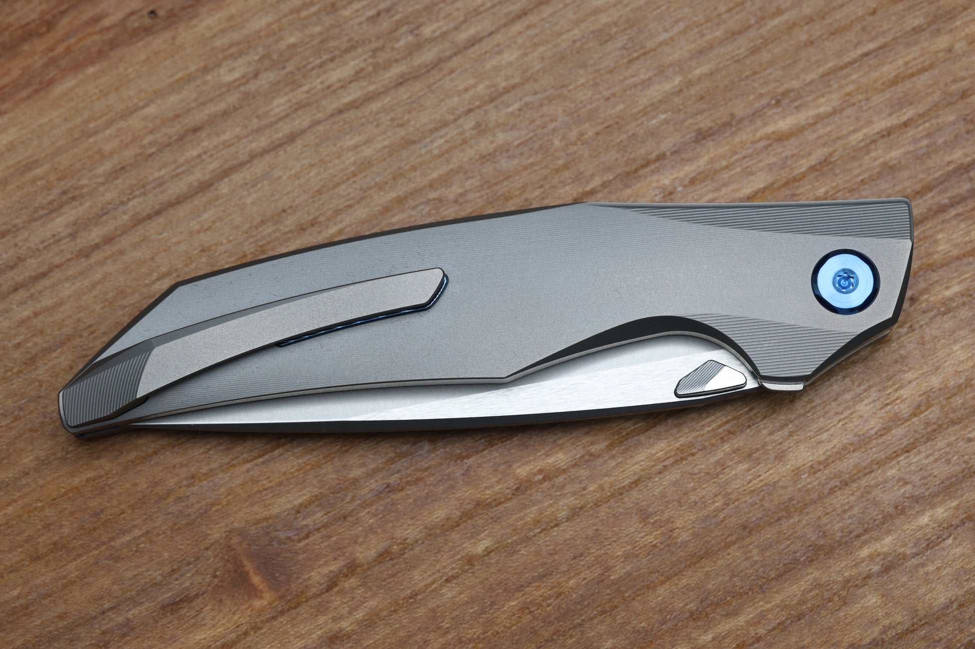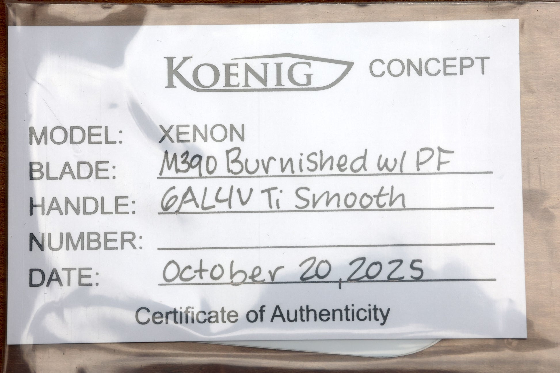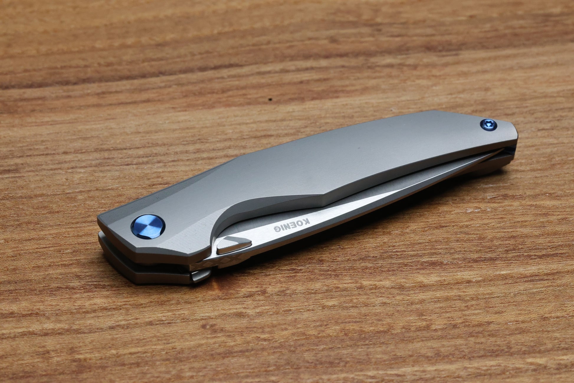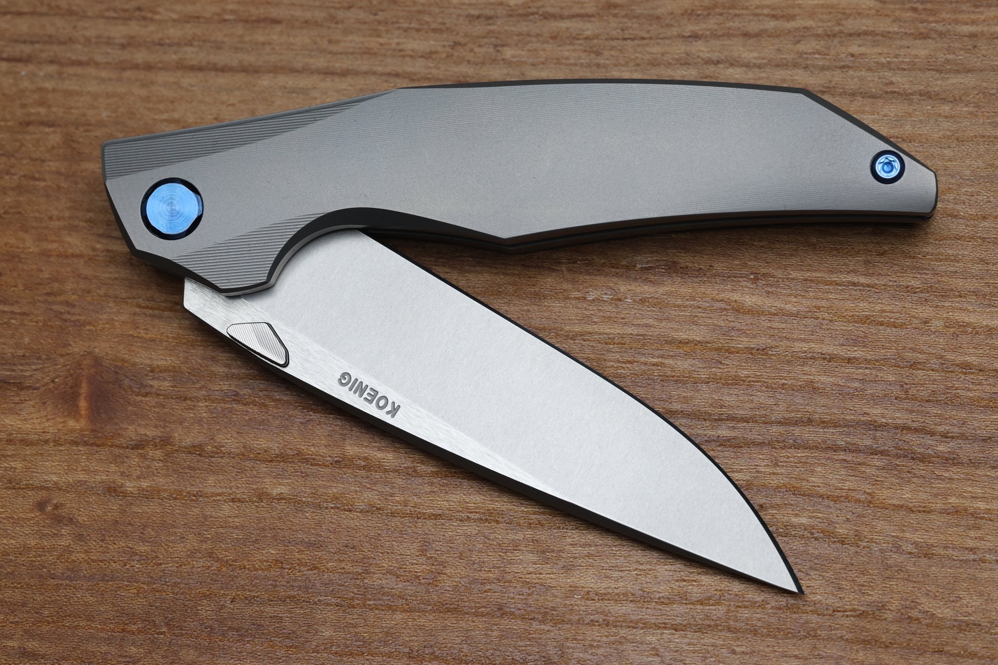 KOENIG KNIVES XENON - SMOOTH TITANIUM HANDLE - BLUE HARDWARE - BURNISHED W/ POLISHED FLATS M390 BLADE