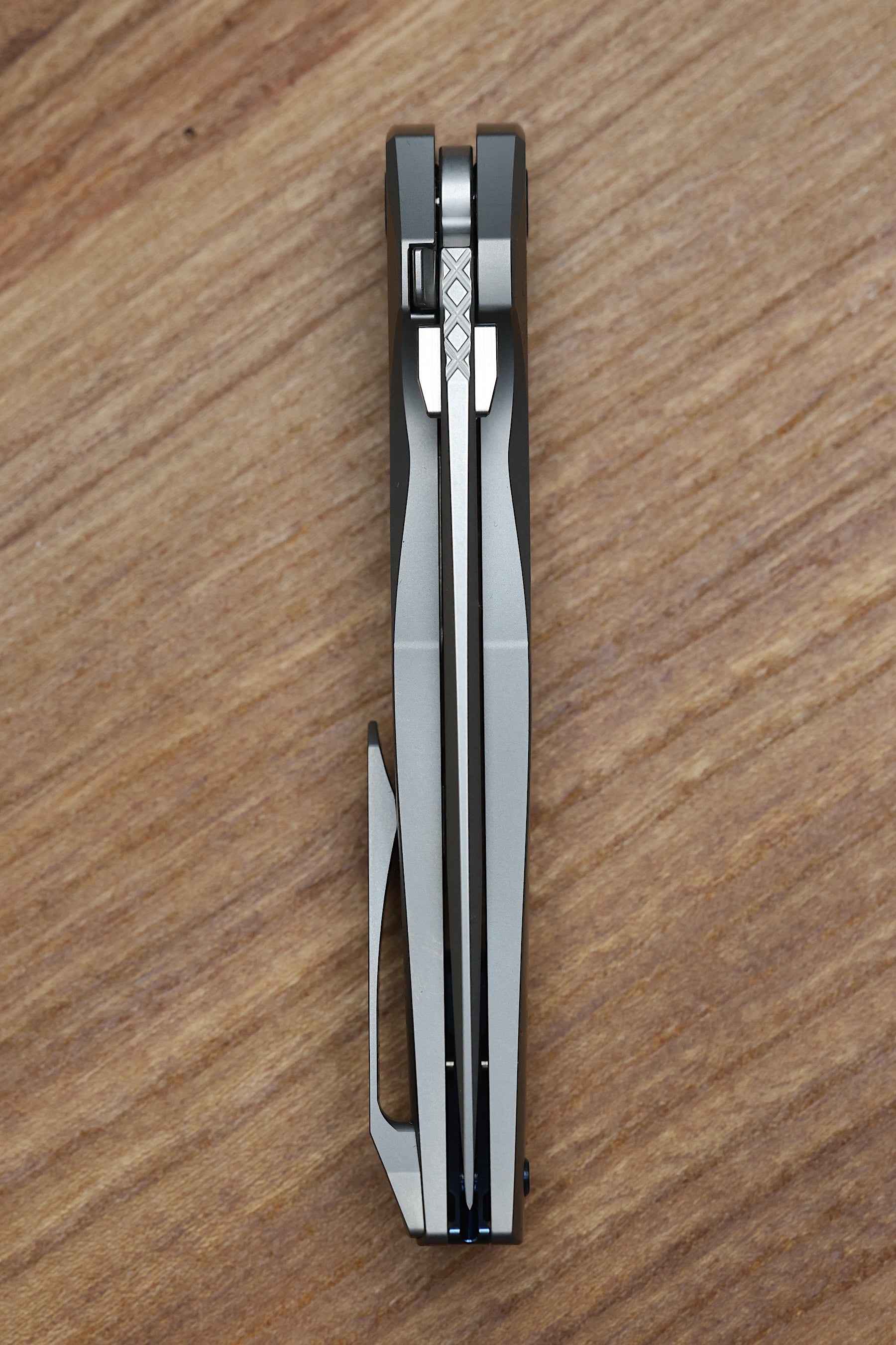 - Tip up blasted finish Titanium pocket clip with hidden screw