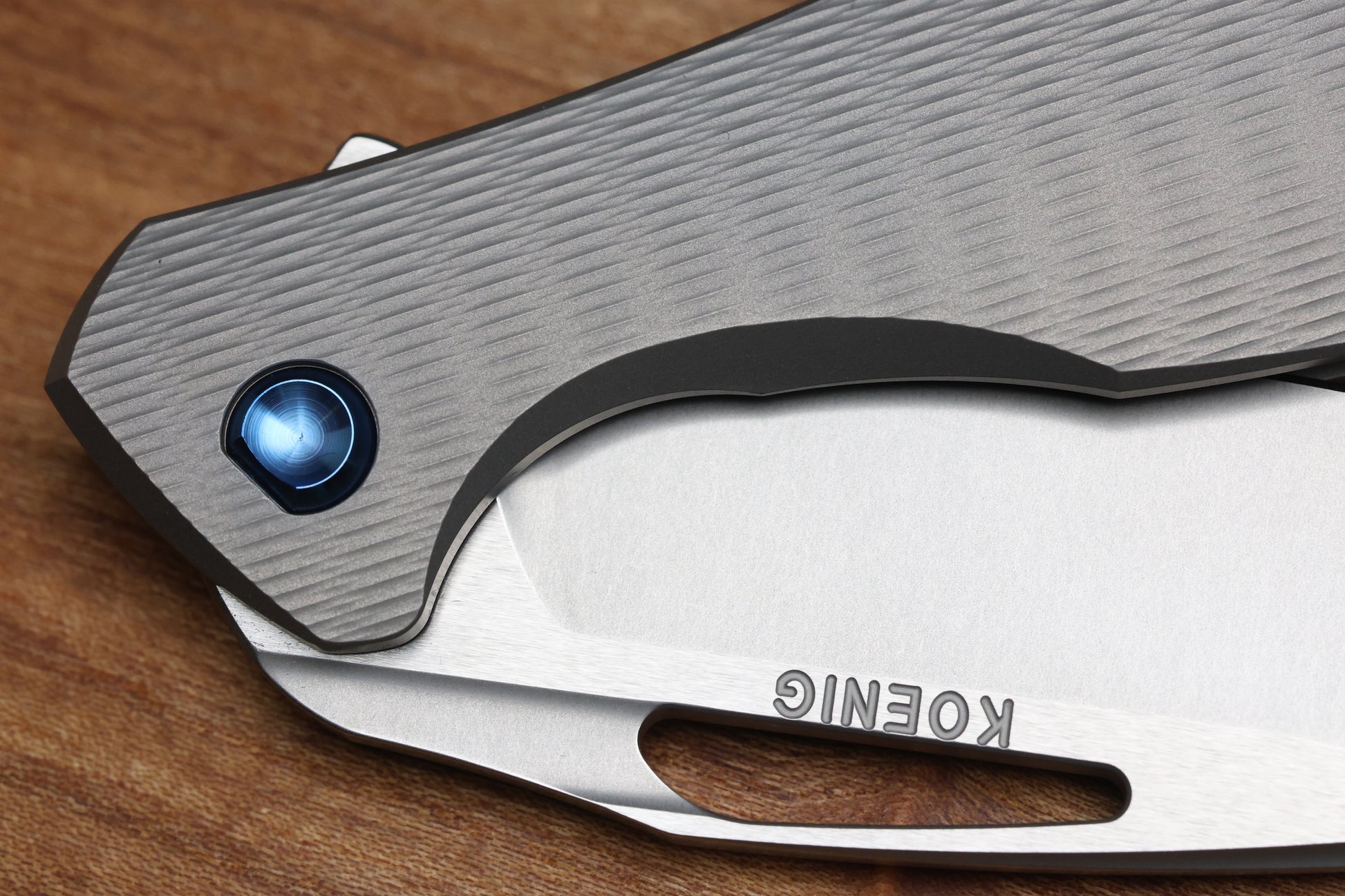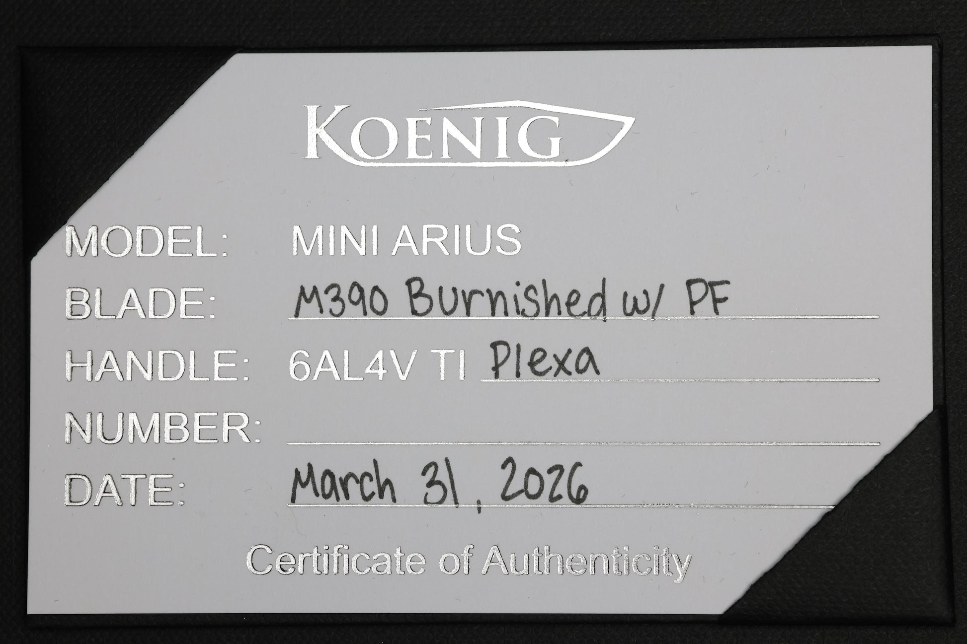 KOENIG MINI ARIUS - PLEXA TITANIUM HANDLE - BLUE HARDWARE - BURNISHED W/ POLISHED FLATS M390 BLADE