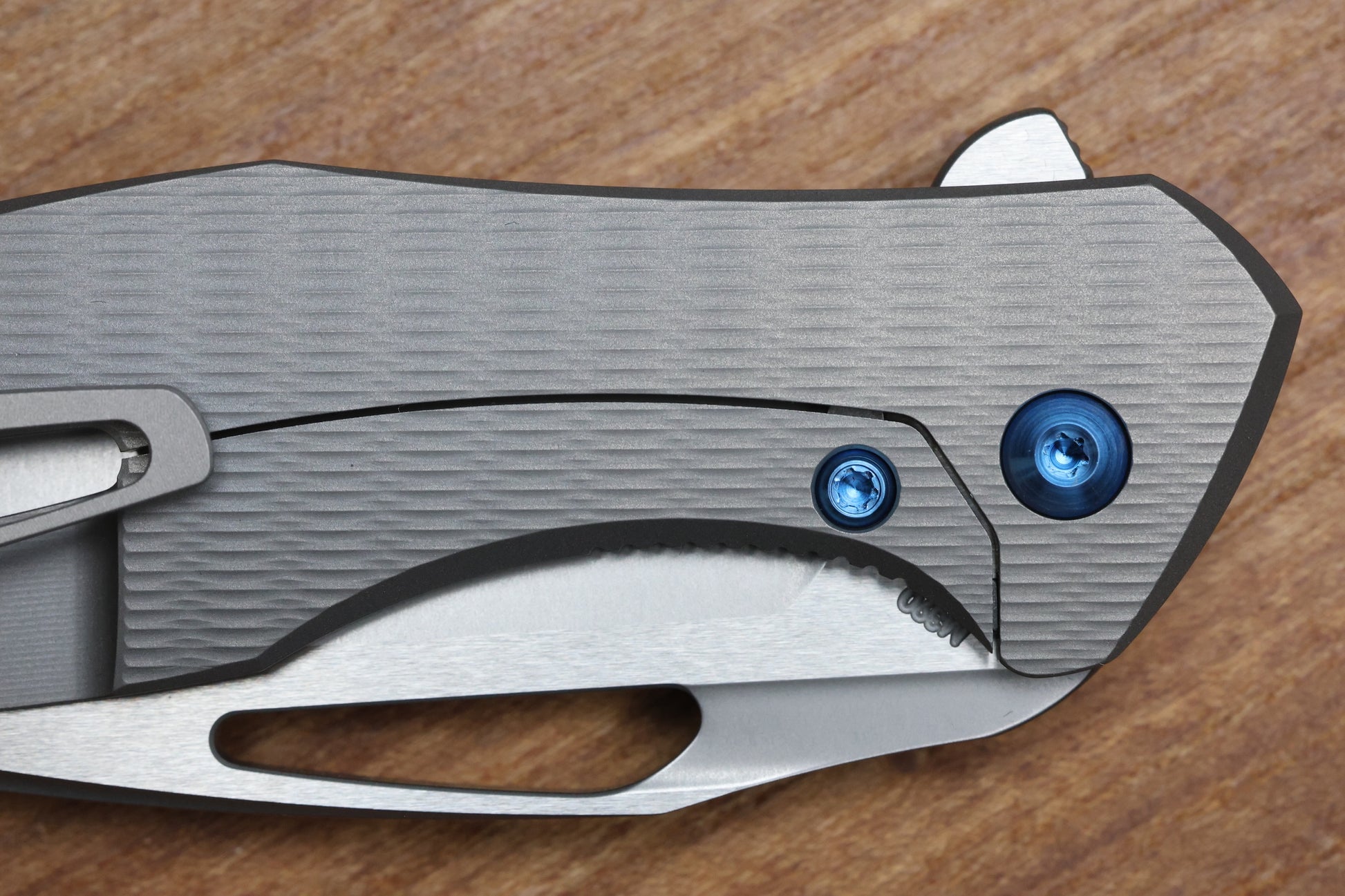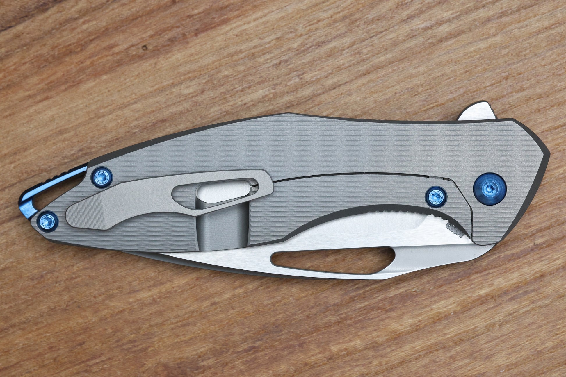 - Tip up bead blasted Titanium pocket clip with hidden screw