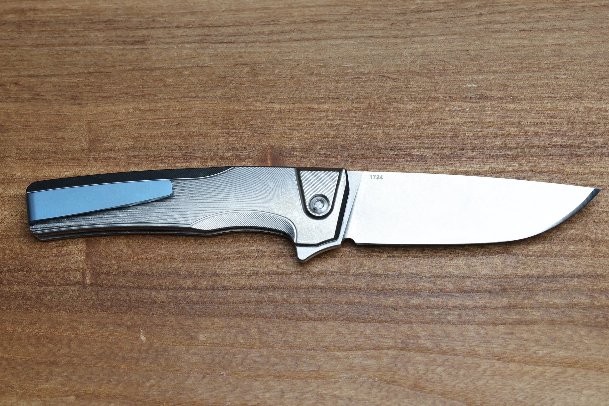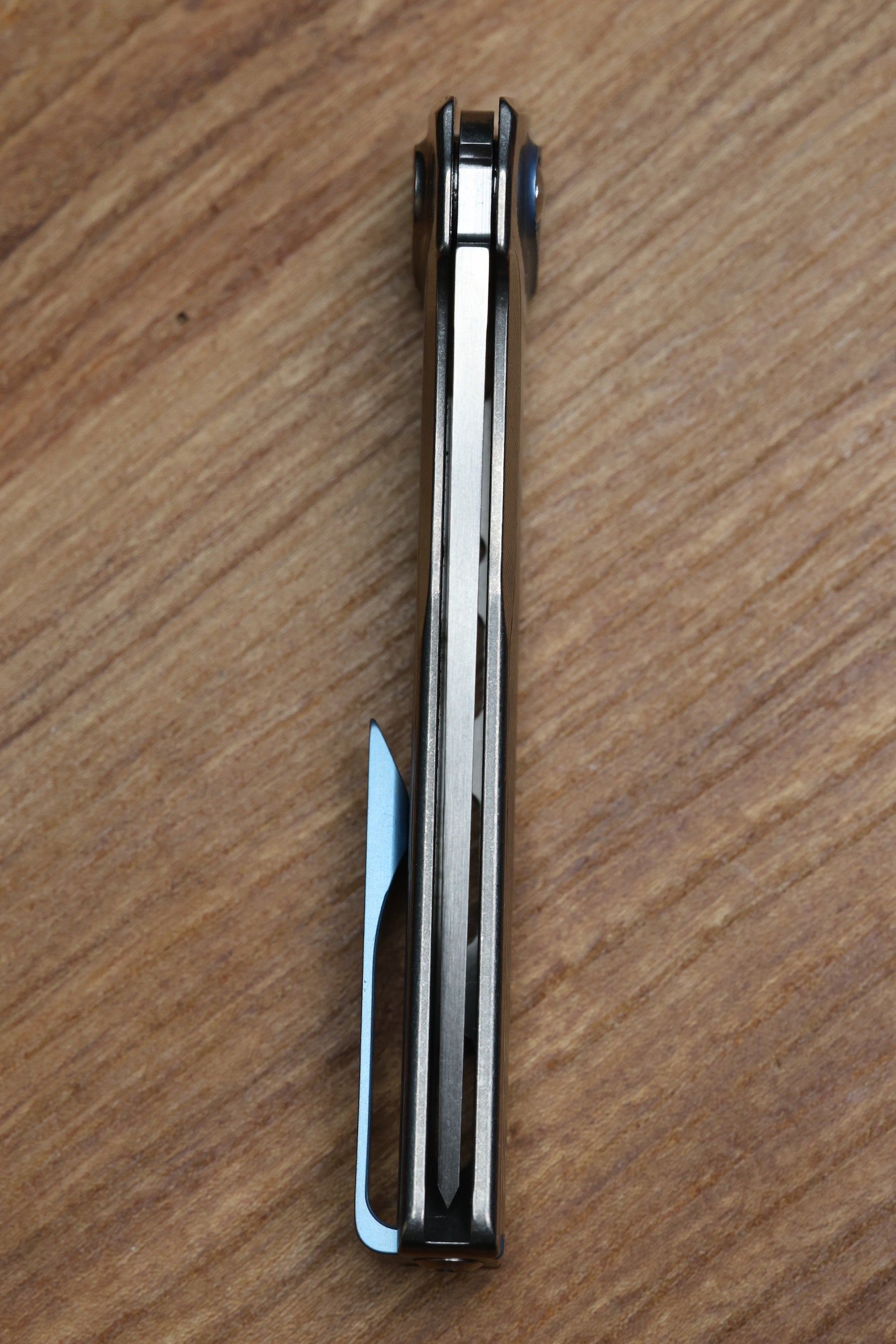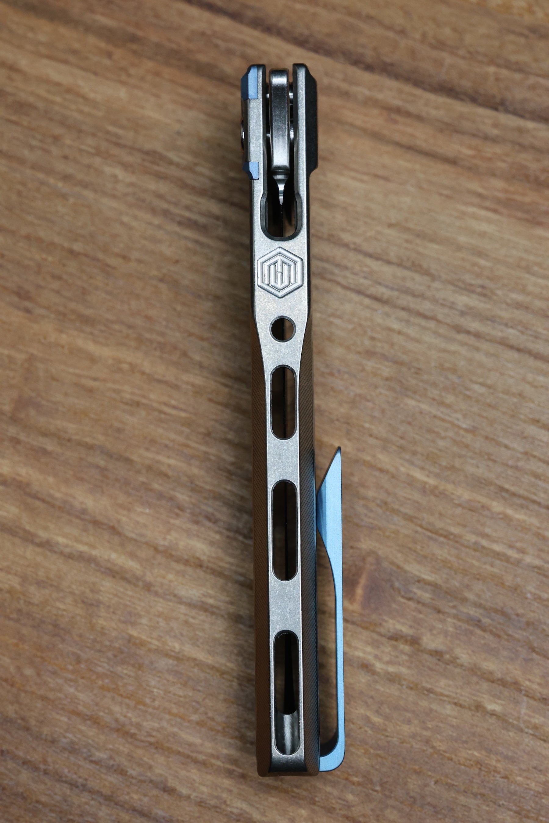 - Satin finish Titanium hardware and pivot screws with Powder Blue finish Titanium pivot collar on presentation side