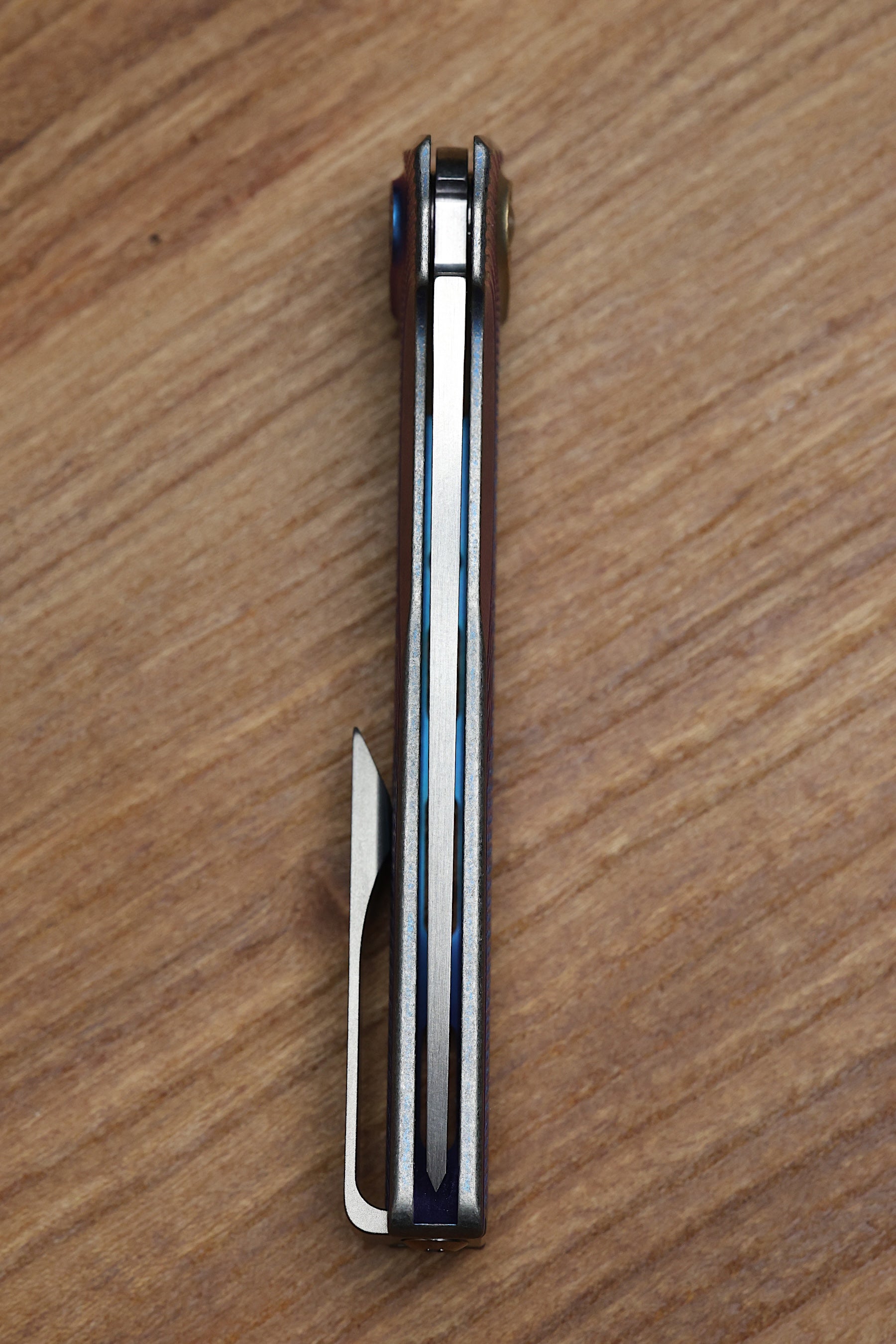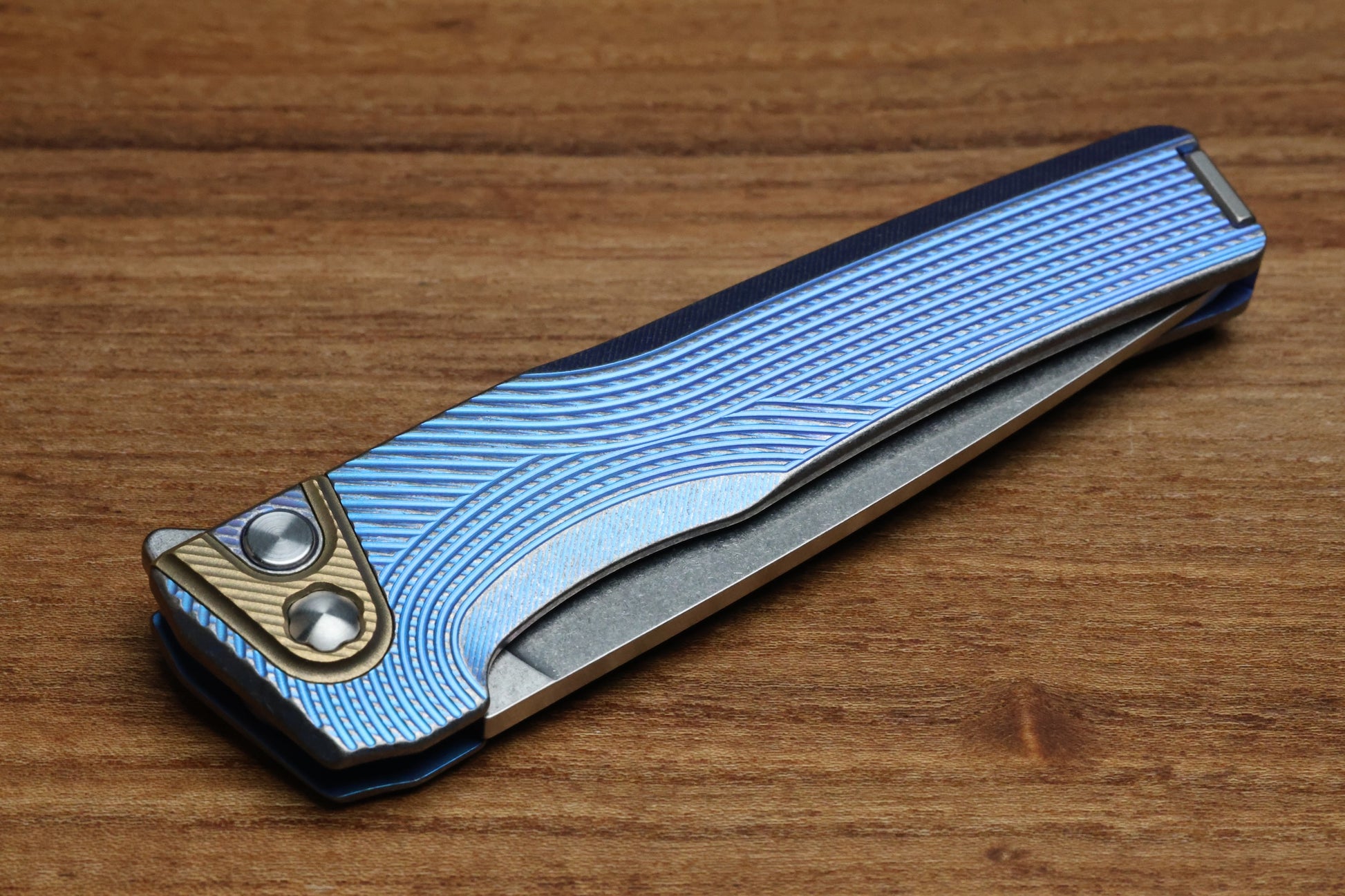 - E-Blue w/ Distressed finish Titanium integral handle scales with "Streamline" milling pattern