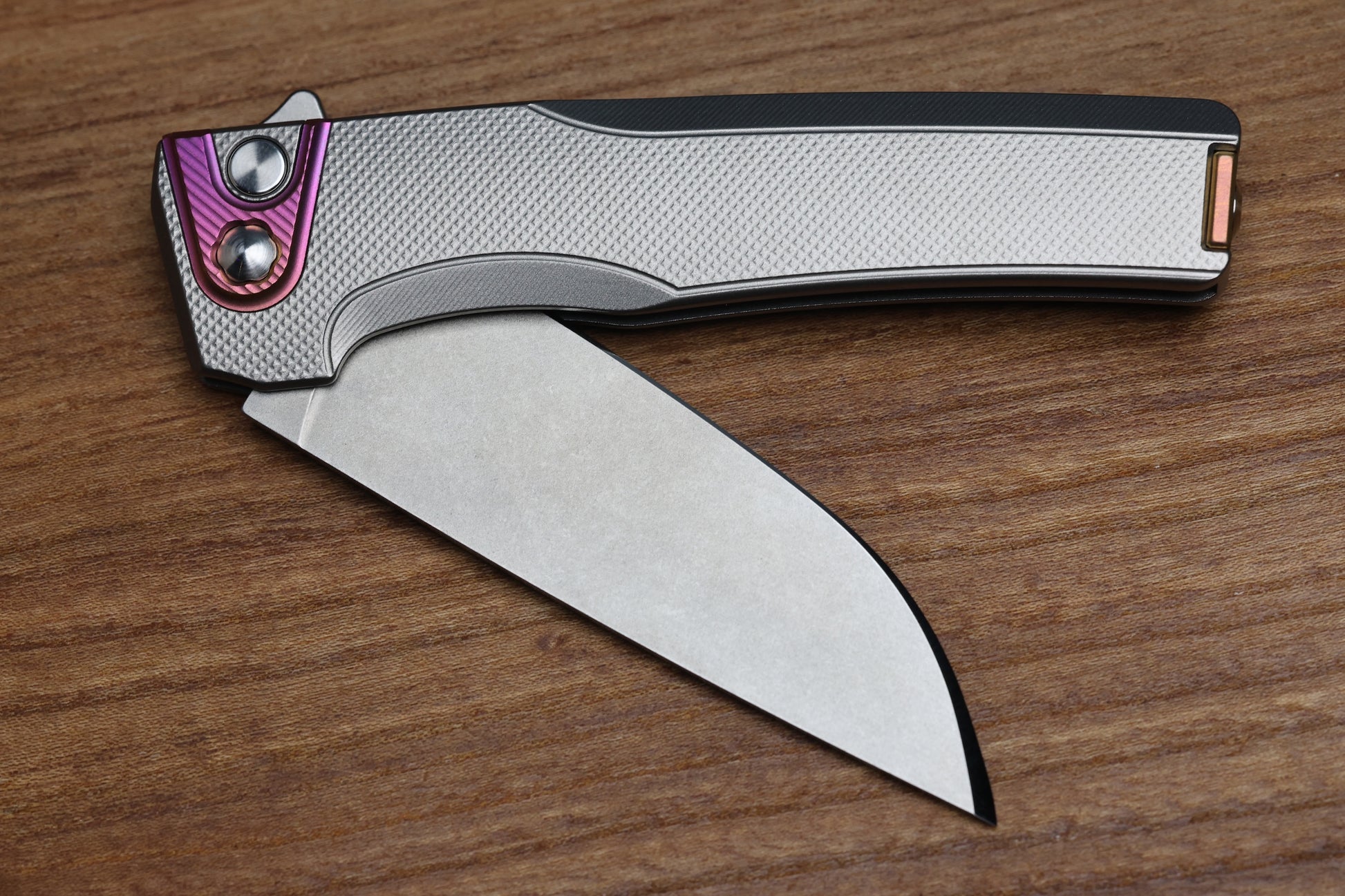 - Satin finish Titanium hardware and pivot screws with Sunset finish Titanium pivot collar on presentation side