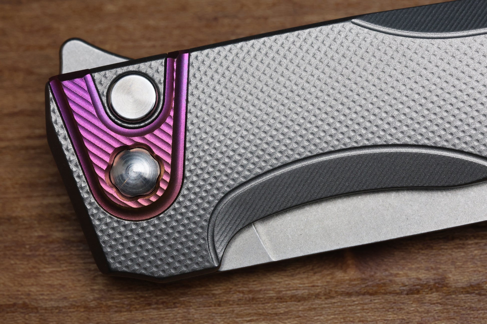 - Raw finish Titanium integral handle scales with "Diamonds" textured milling pattern