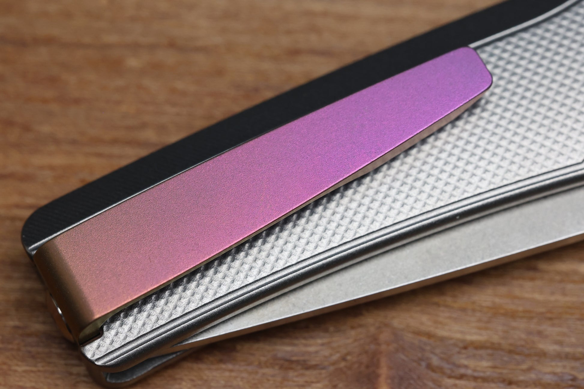 - Tip up Sunset finish Titanium reversible pocket clip