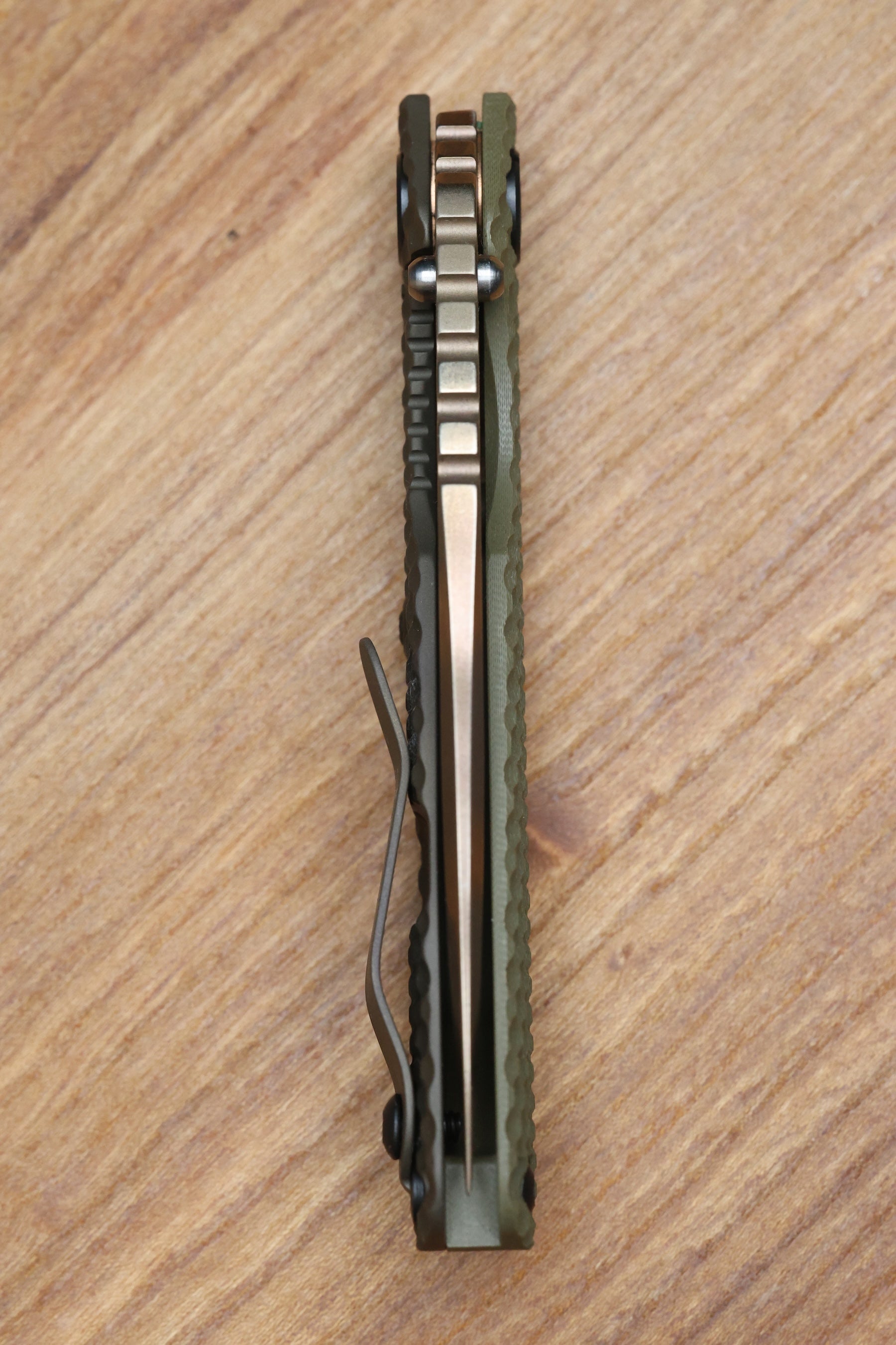 MICK STRIDER SNG OD GREEN DGG DOUBLE GUNNER GRIP & ANTIQUE BRONZE W/ GHOSTSTRIPE S30V