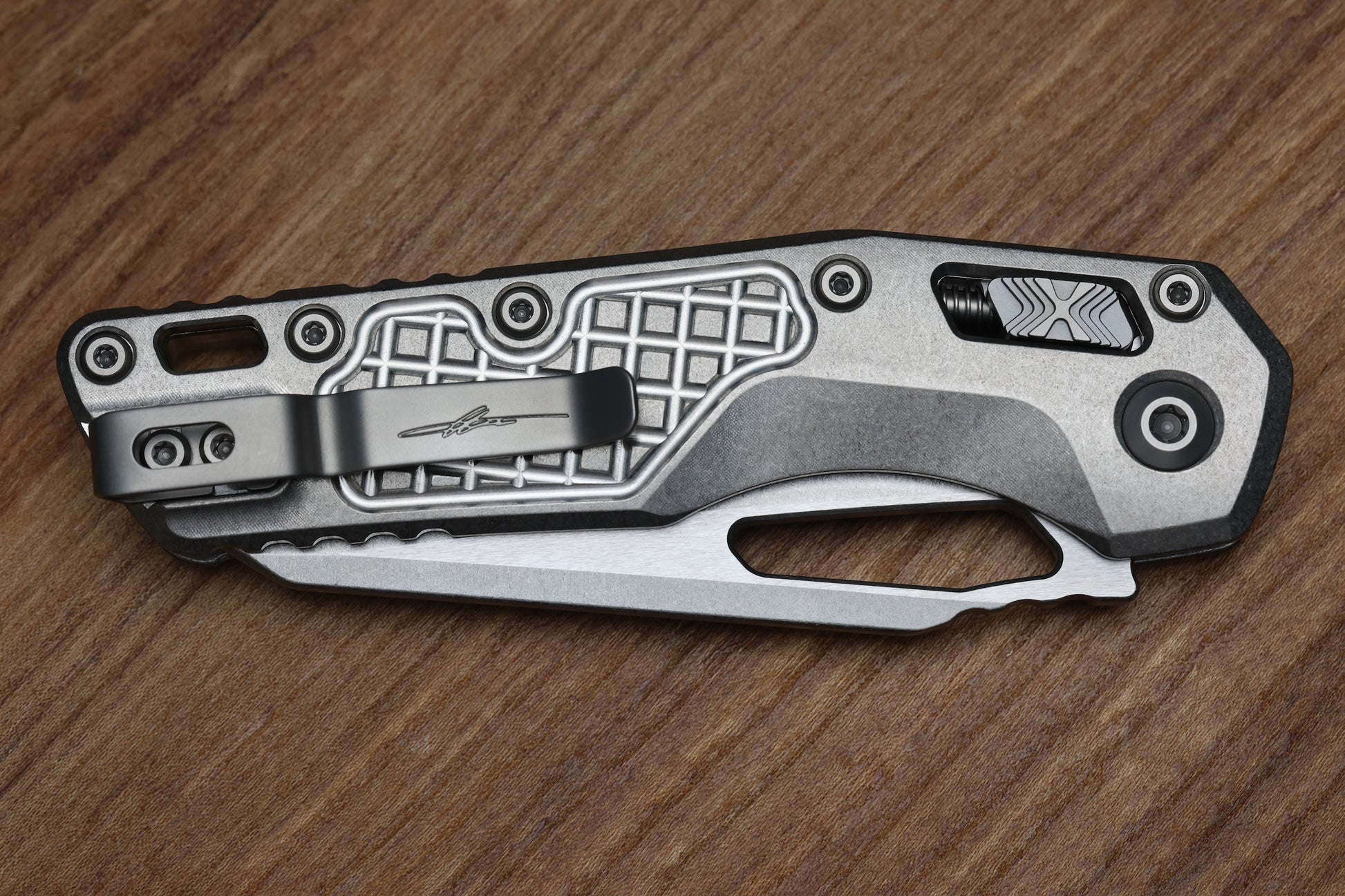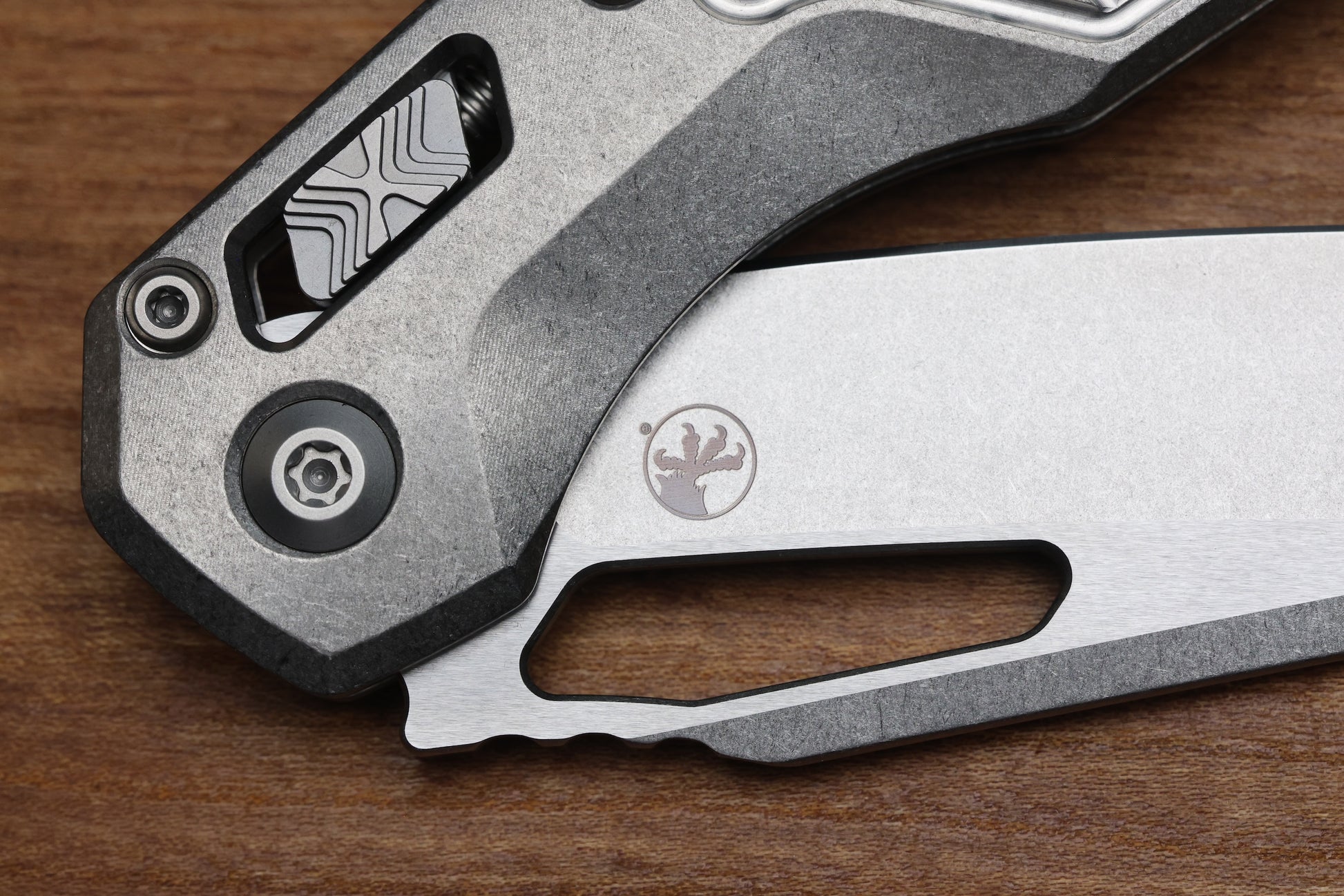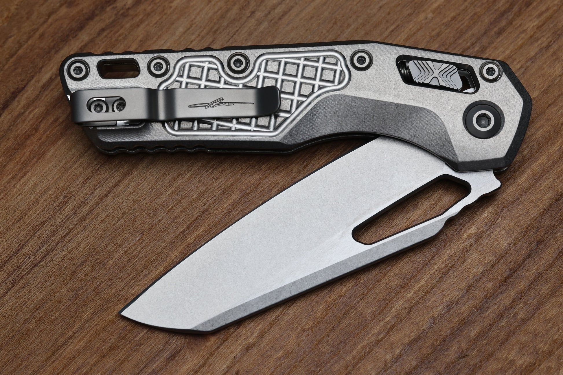 - 4.00" stonewashed M390MK blade with jimping on spine