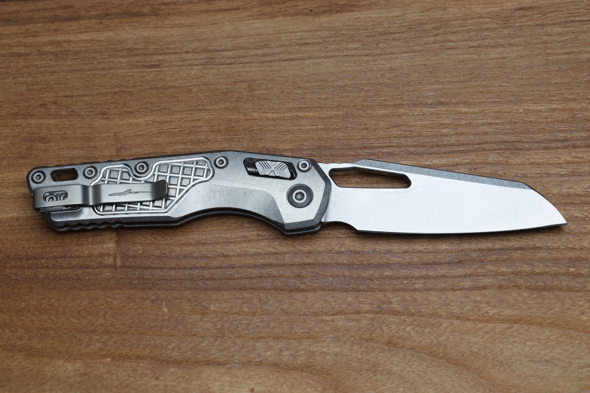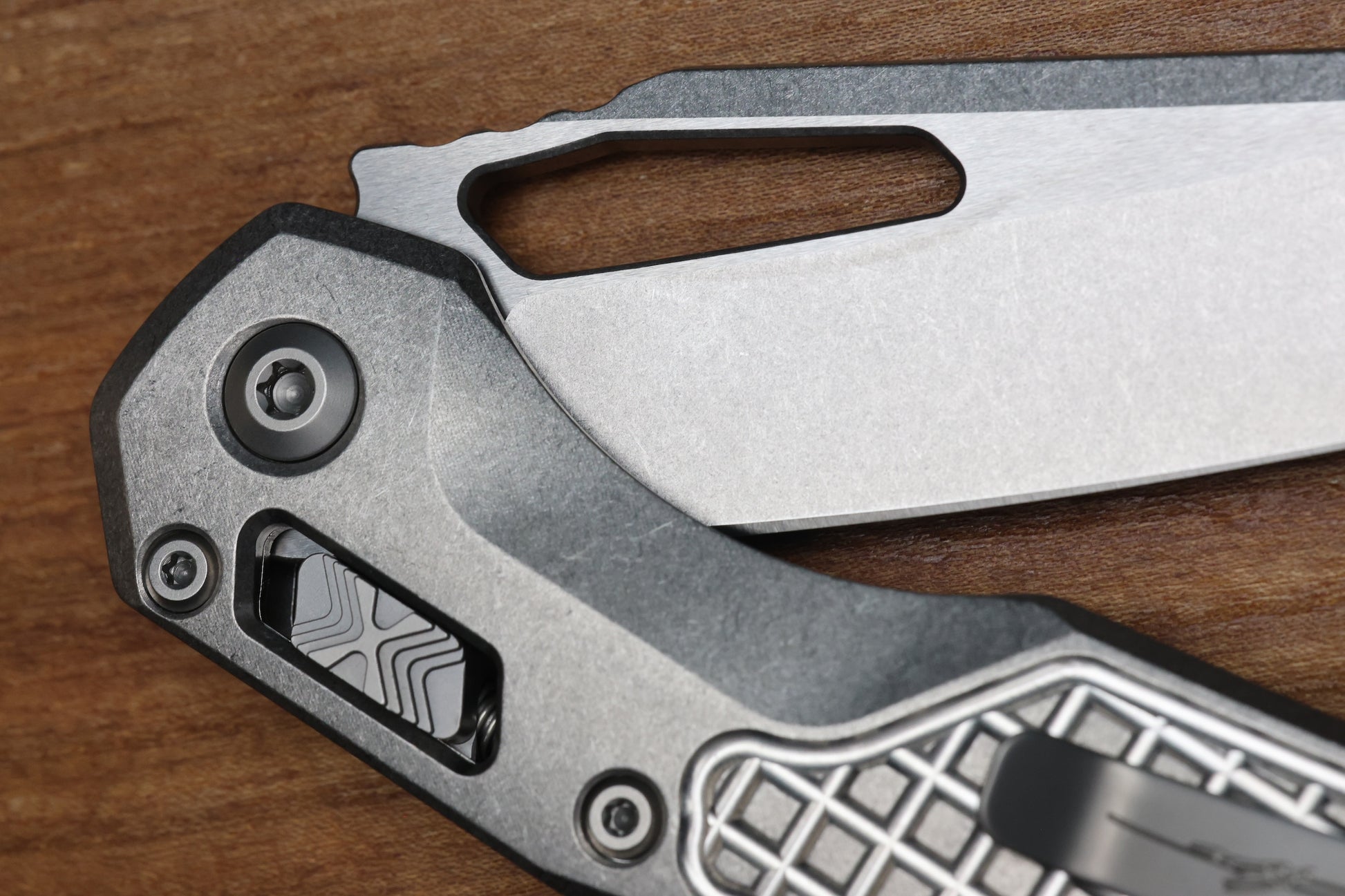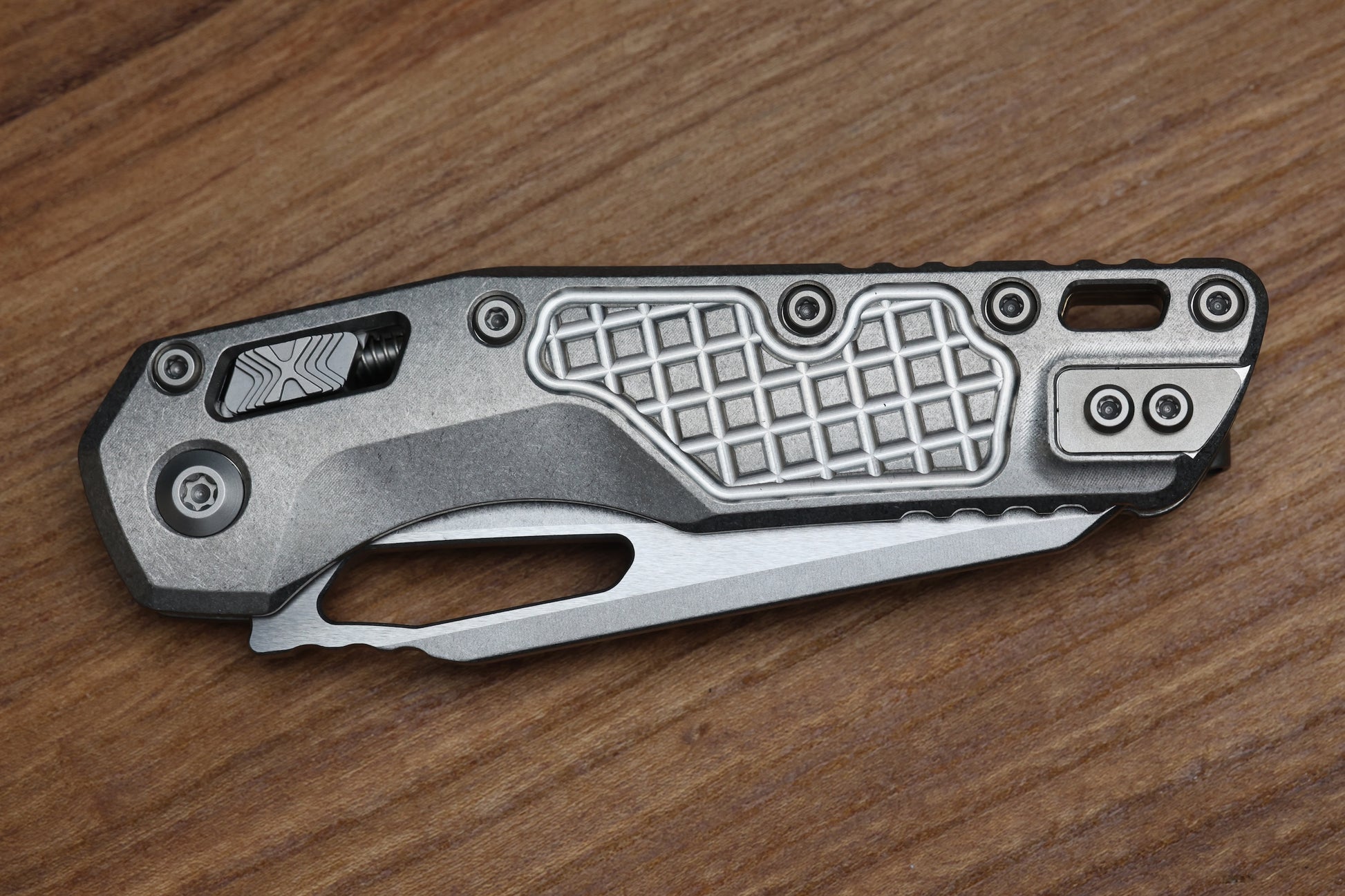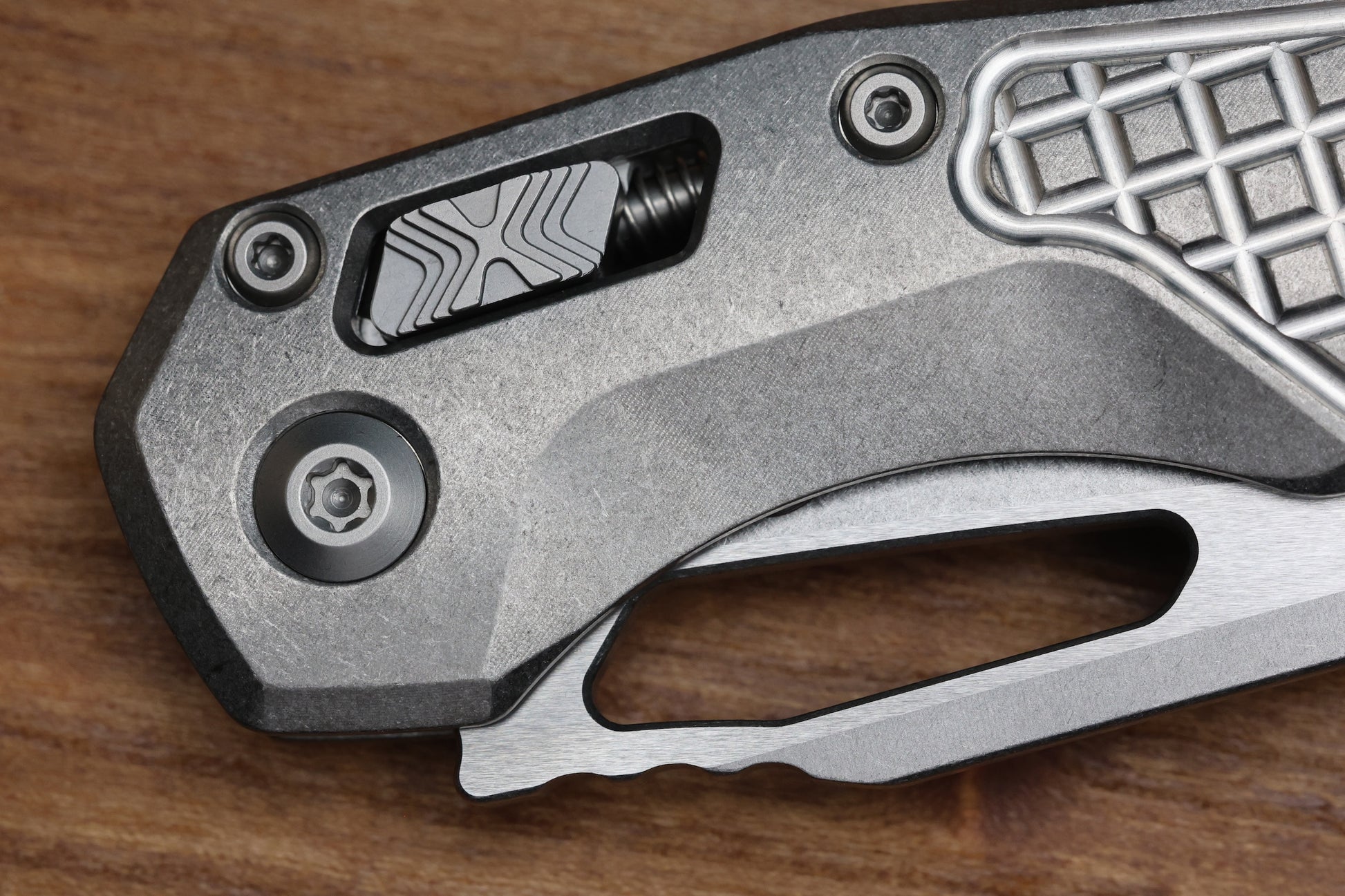 - 4.00" stonewashed M390MK blade with jimping on spine