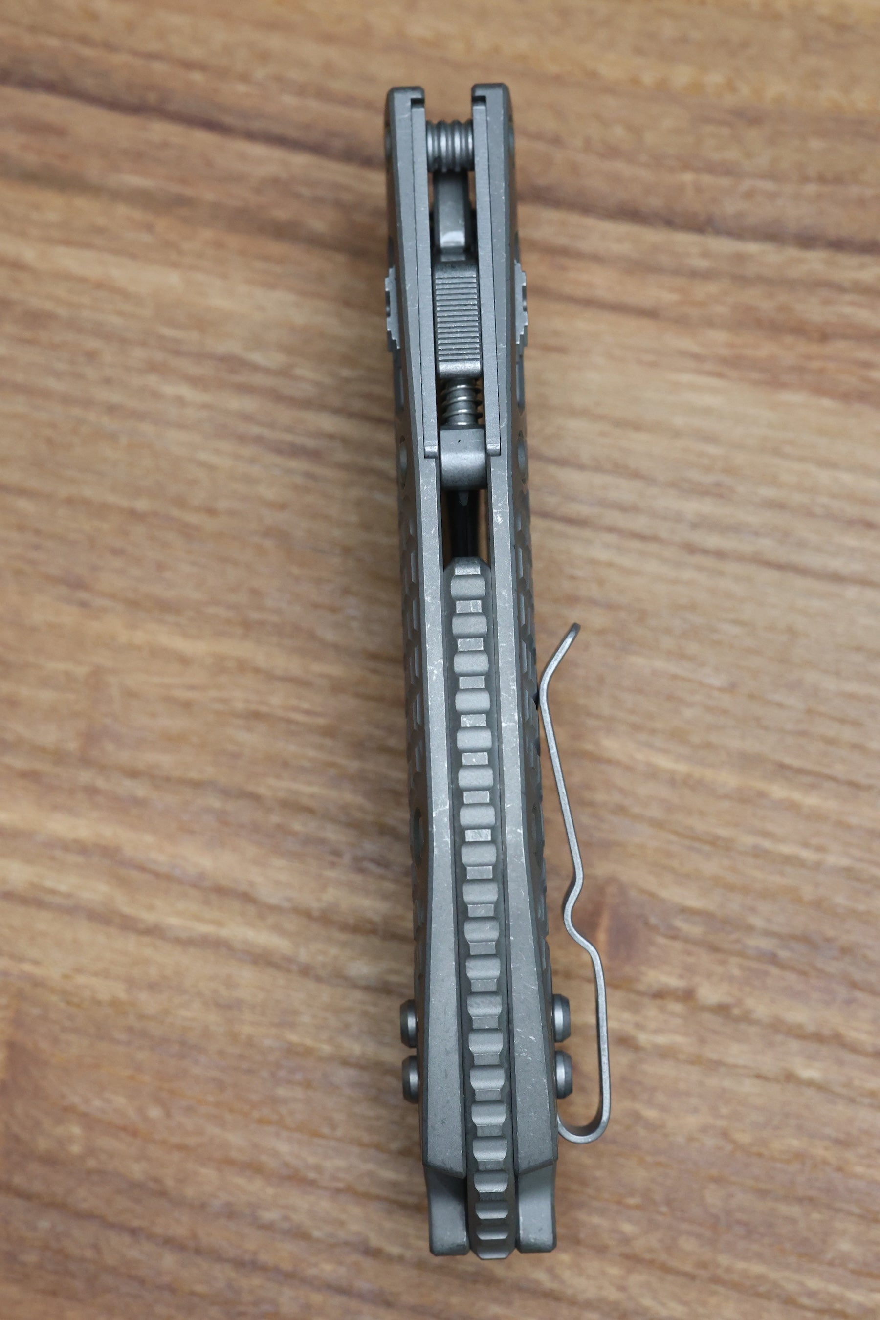 - Apocalyptic finish Titanium handle scales with Frag pattern
