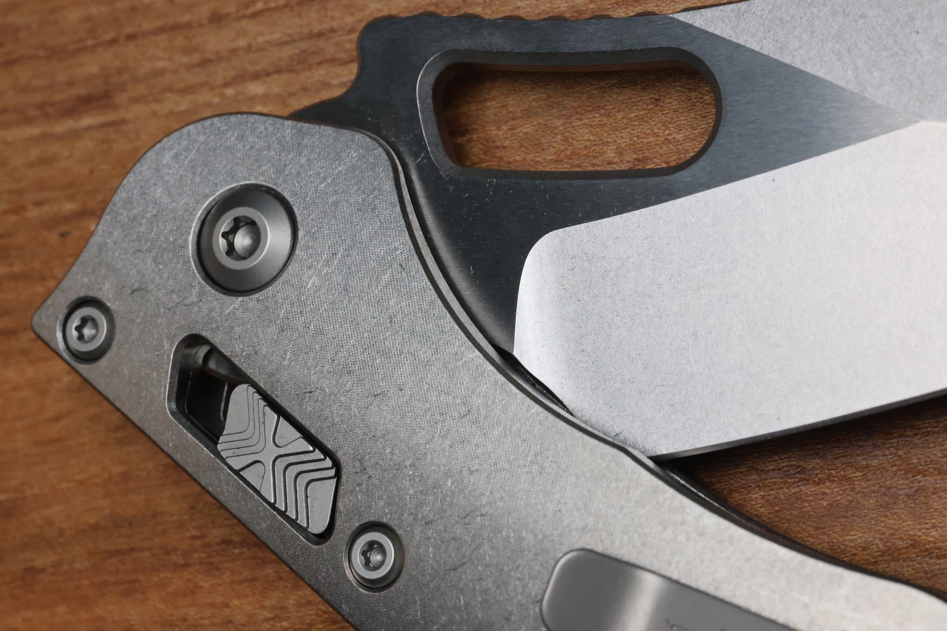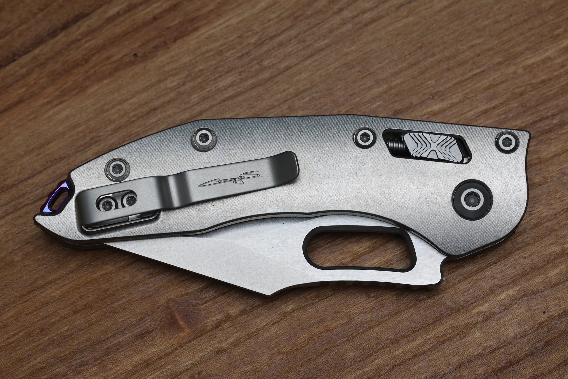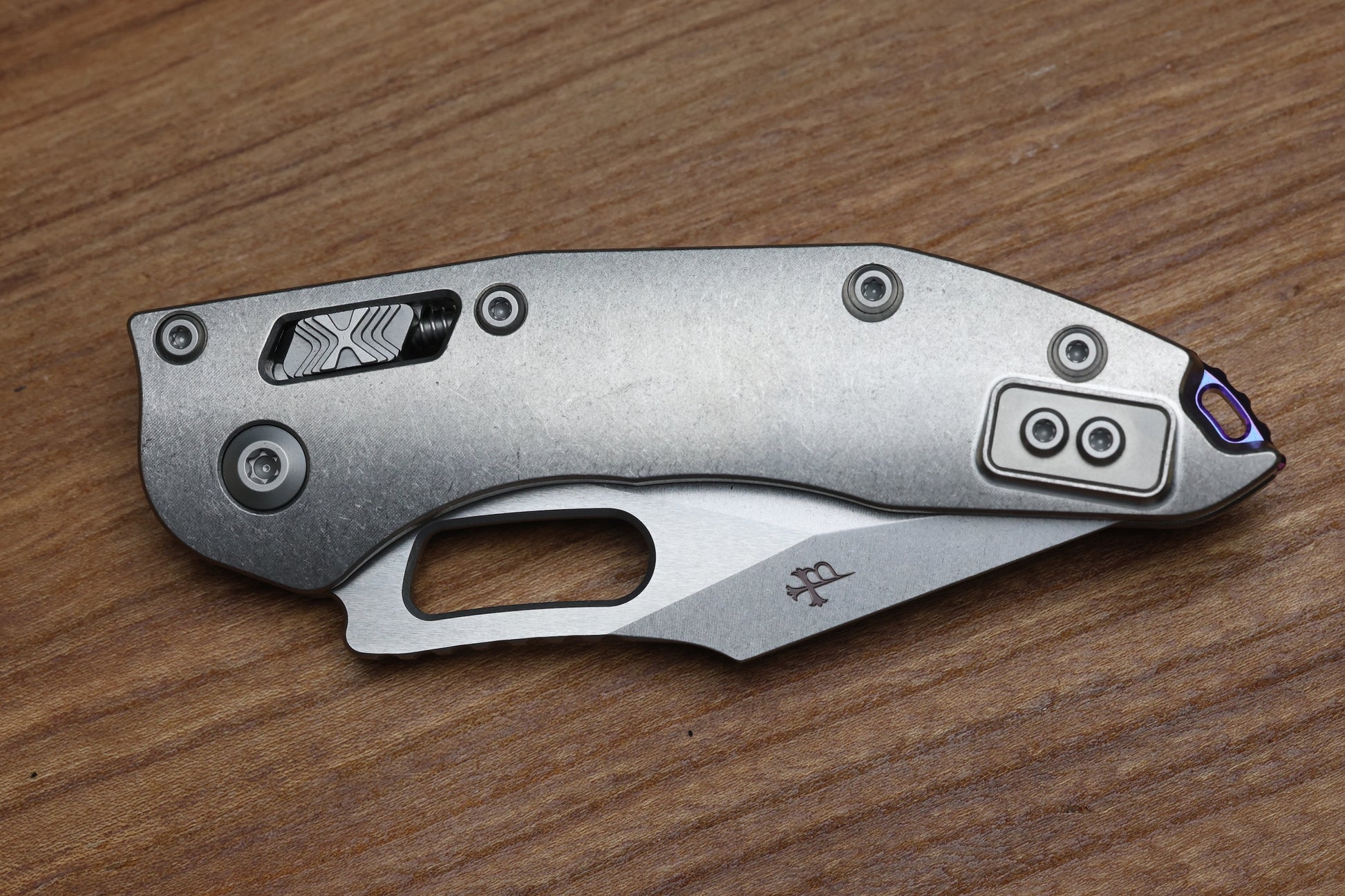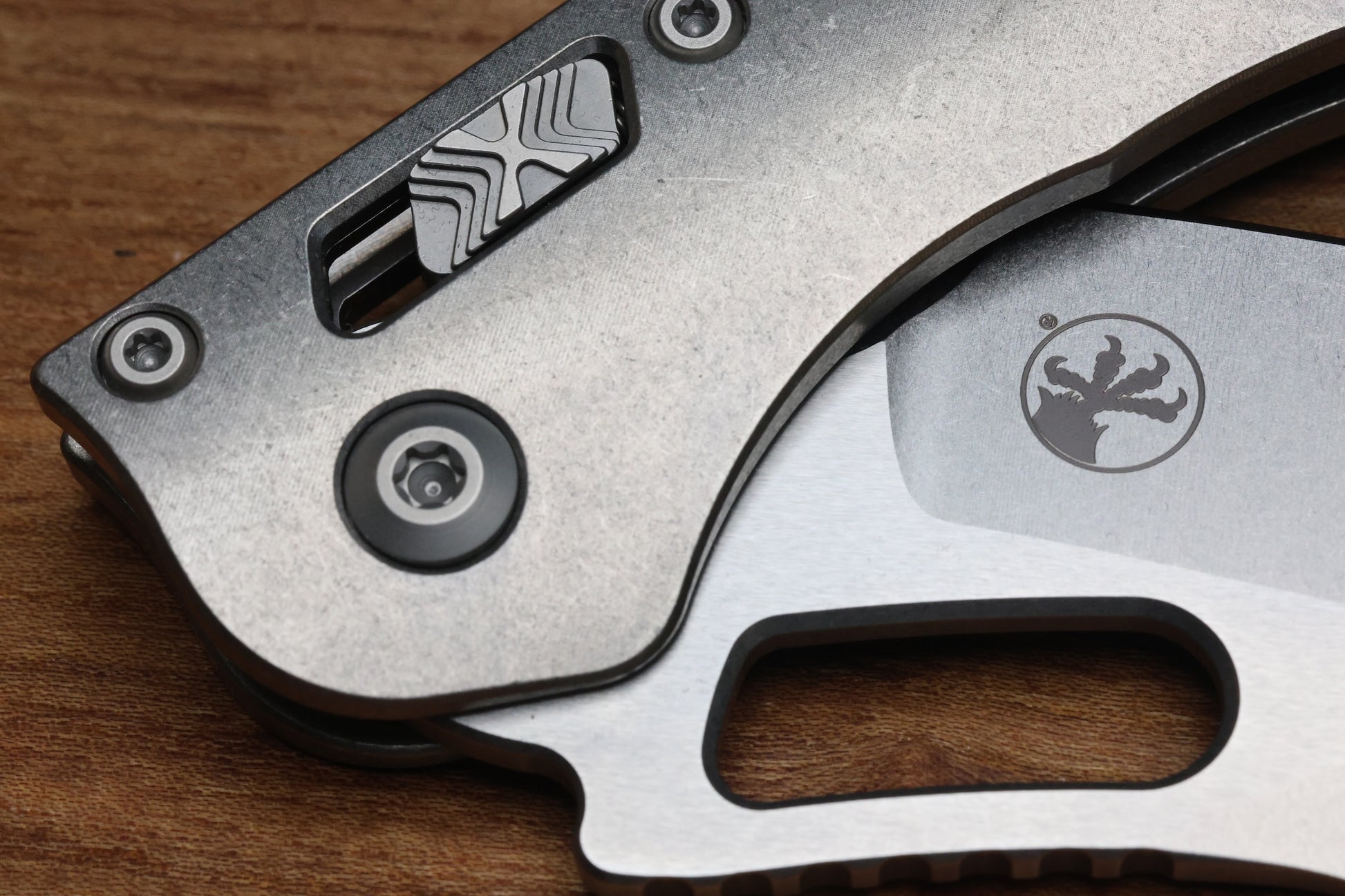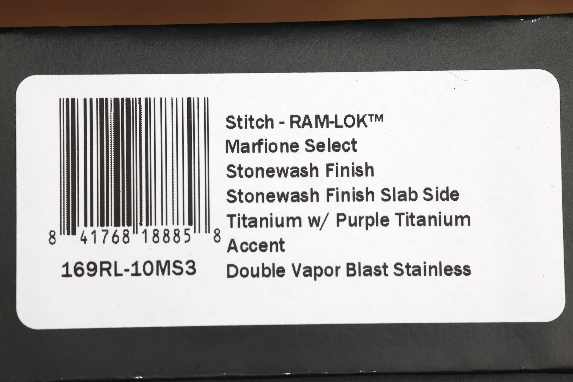 MICROTECH MARFIONE SELECT MANUAL STITCH RAM LOK TITANIUM HANDLES & STONEWASH M390MK W/ DOUBLE VAPOR BLAST & PURPLE ACCENTS 169RL-10MS3