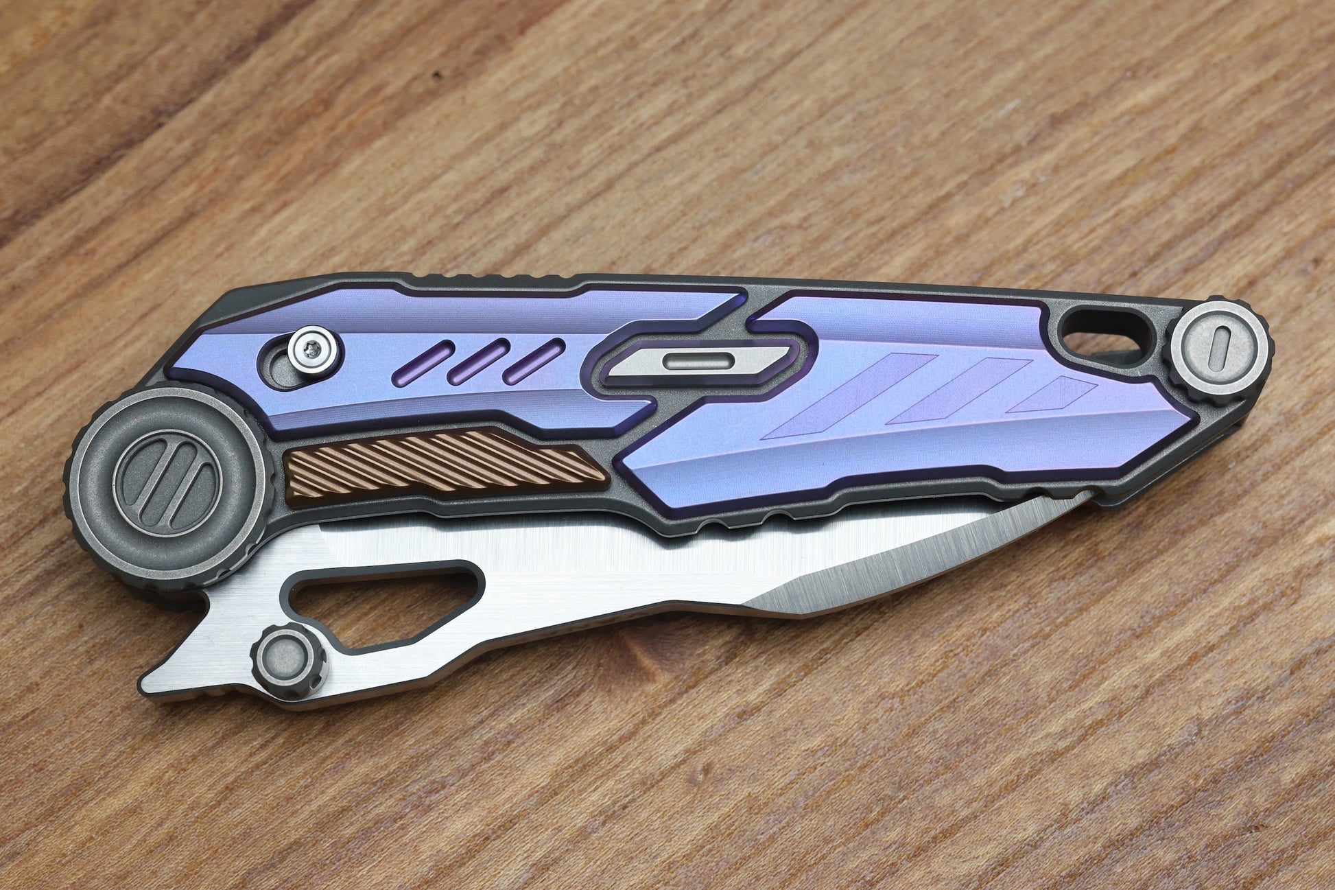 - Stonewashed Titanium frame lock handle scales with Purple and Bronze anodized Titanium overlays