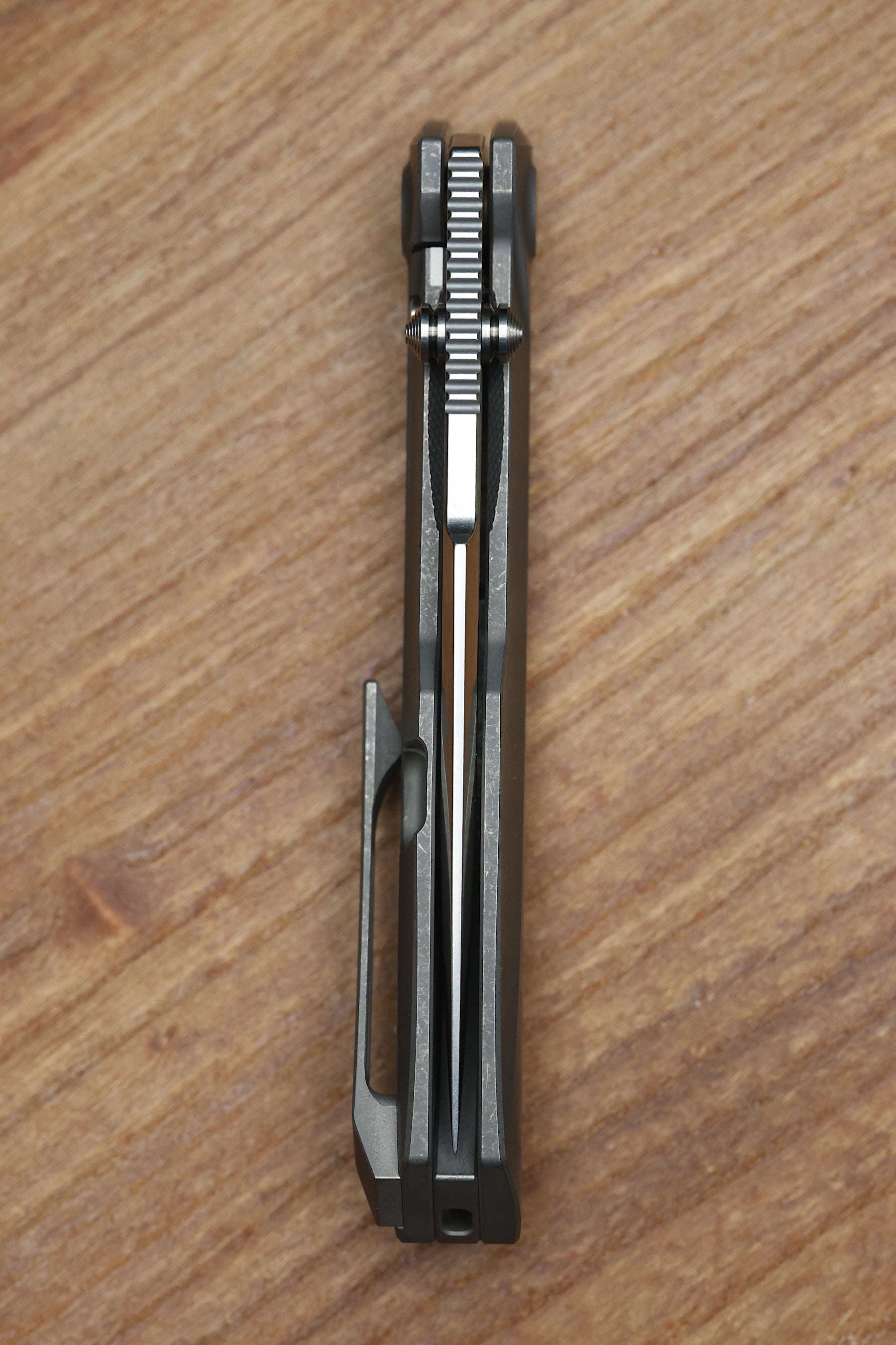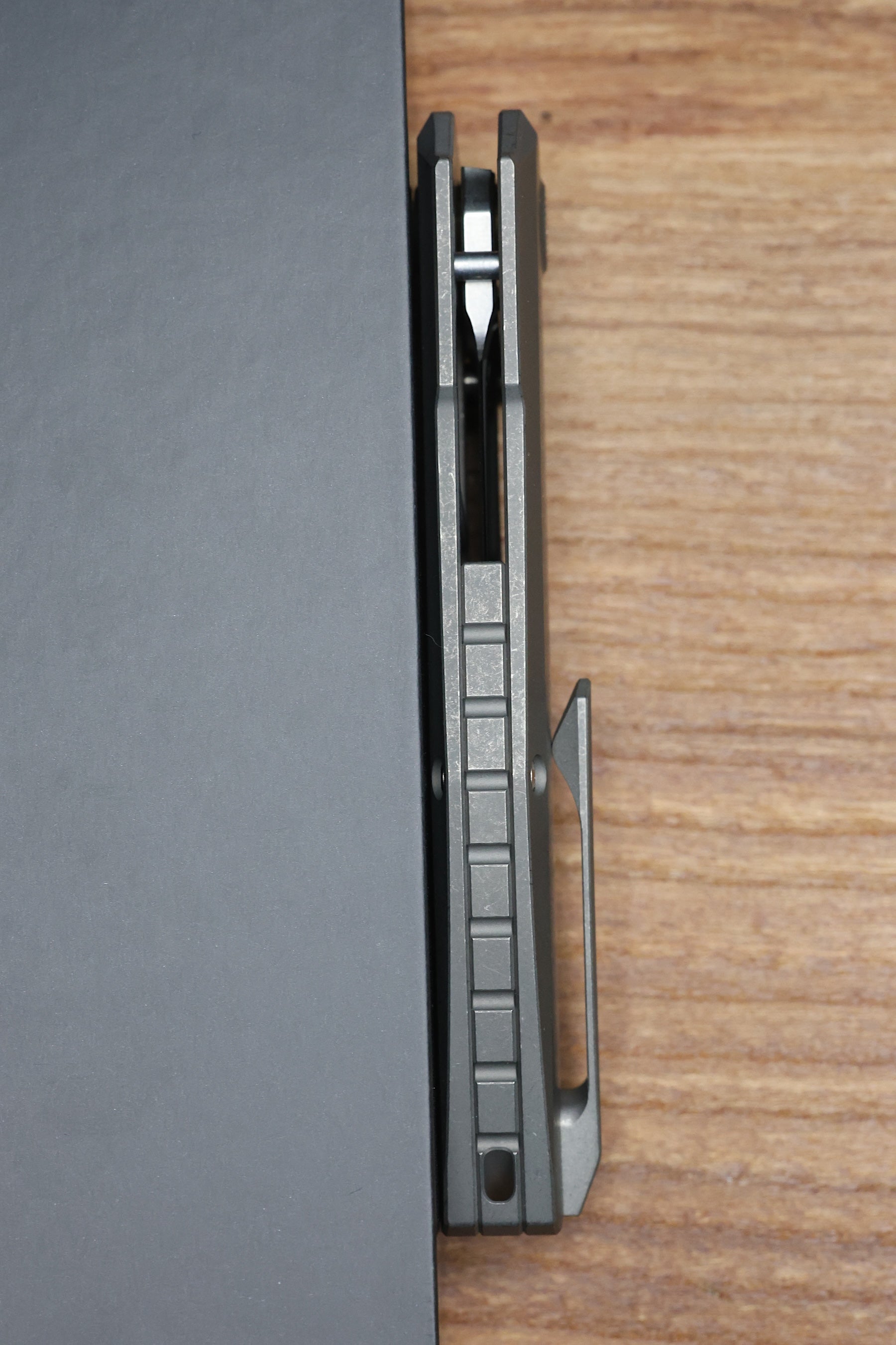 - Tip up dark stonewashed Titanium pocket clip with hidden screw