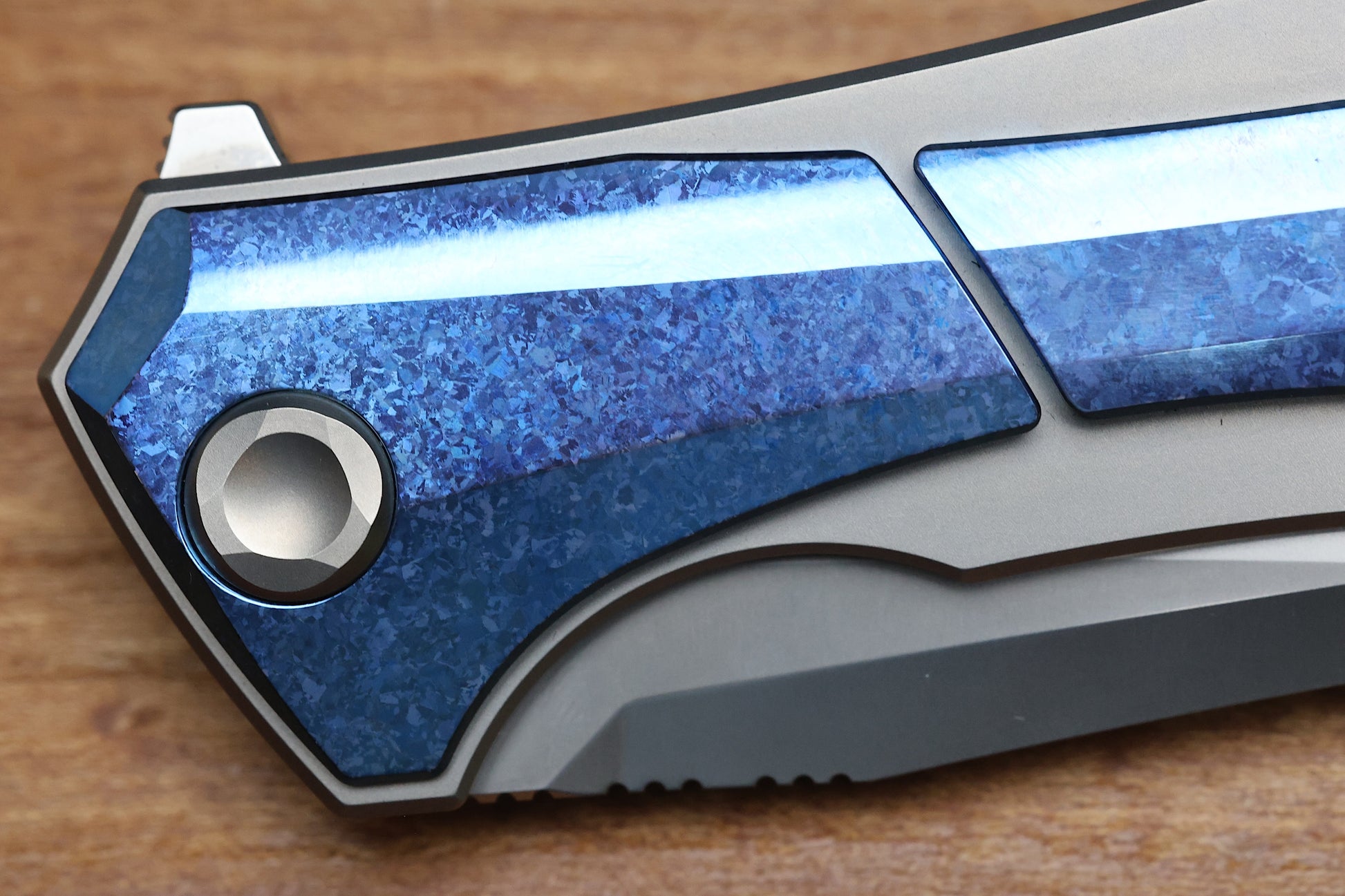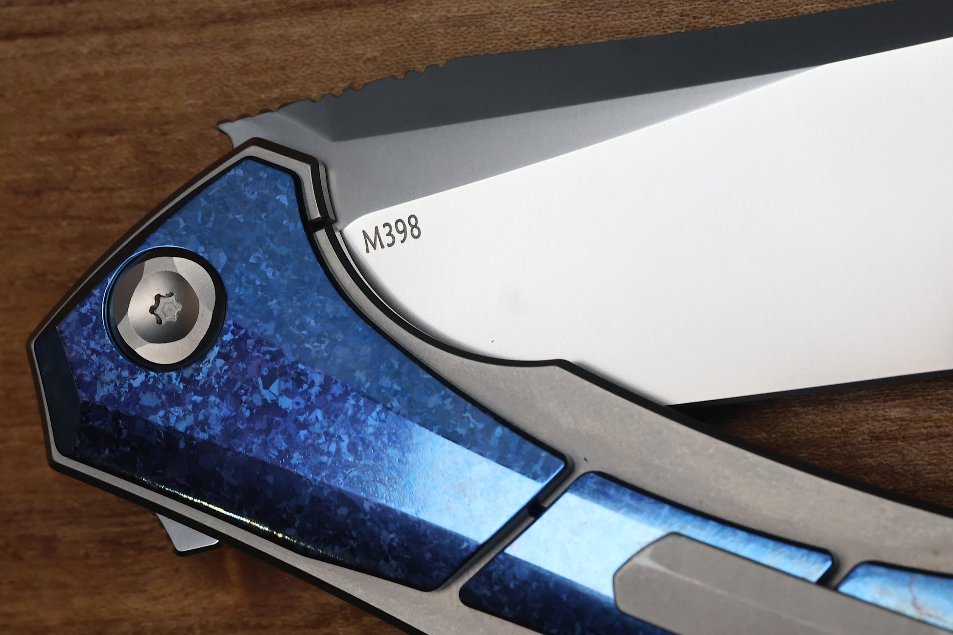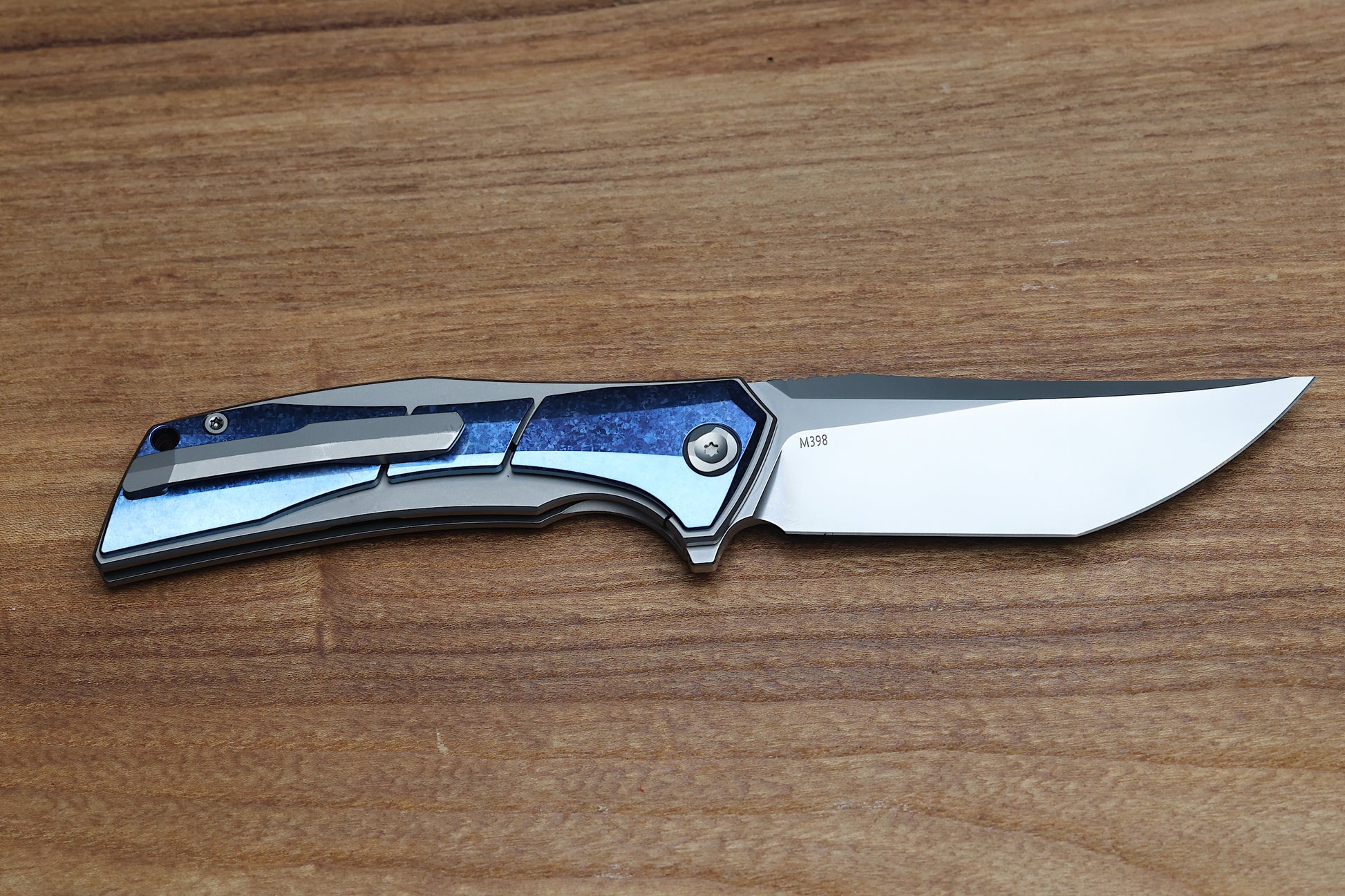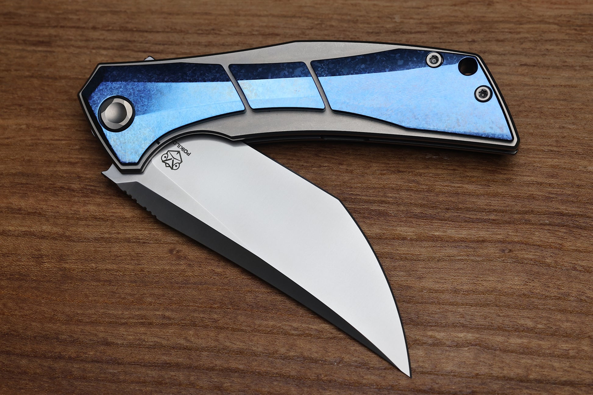 POIKILO BLADE ANOLIS S1 W/ BLUE CRYSTAL TI HANDLES & PEARLESCENT STONEWASH M398