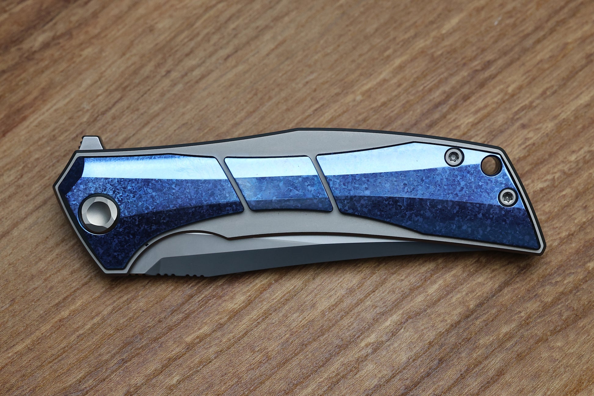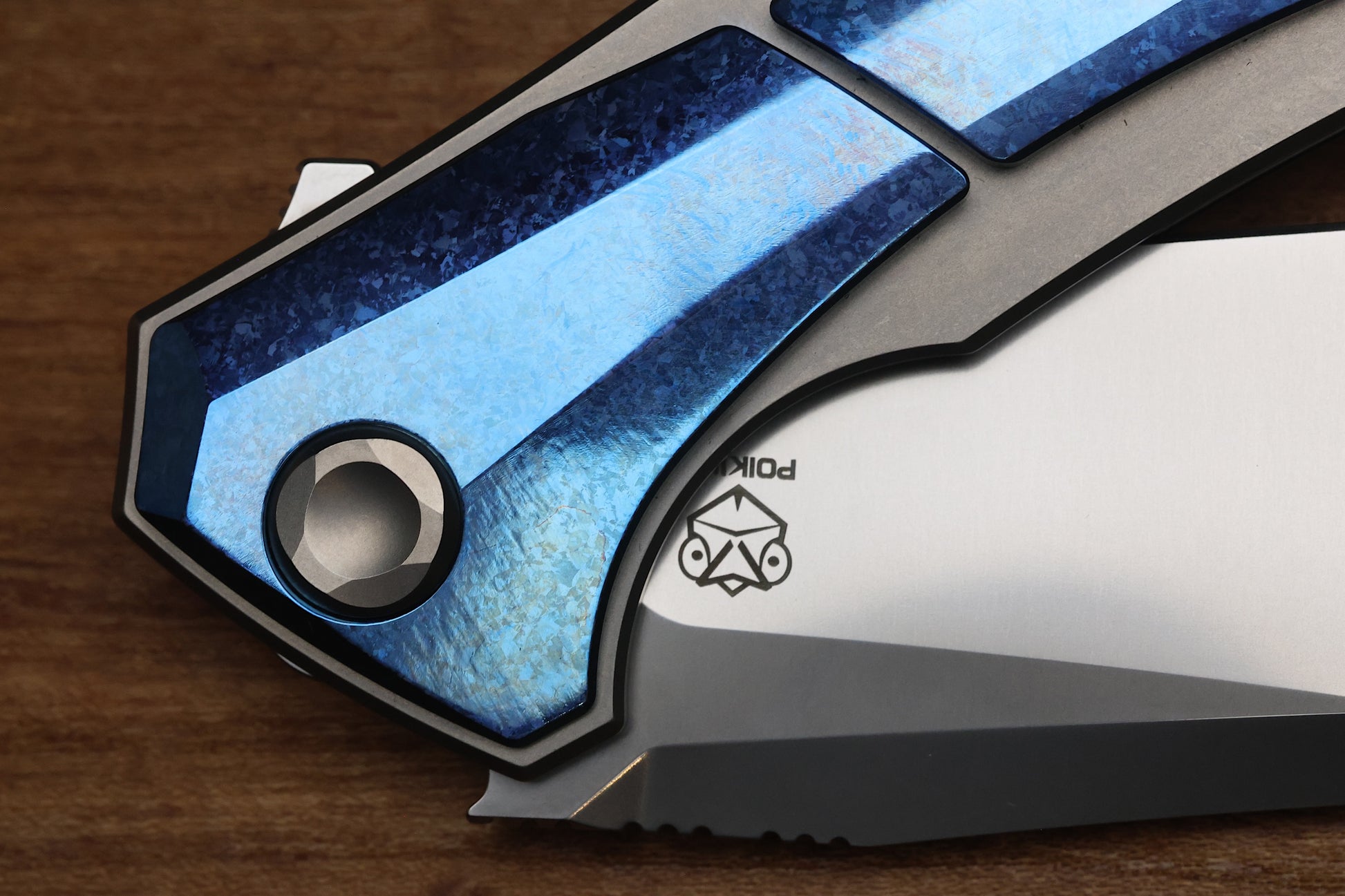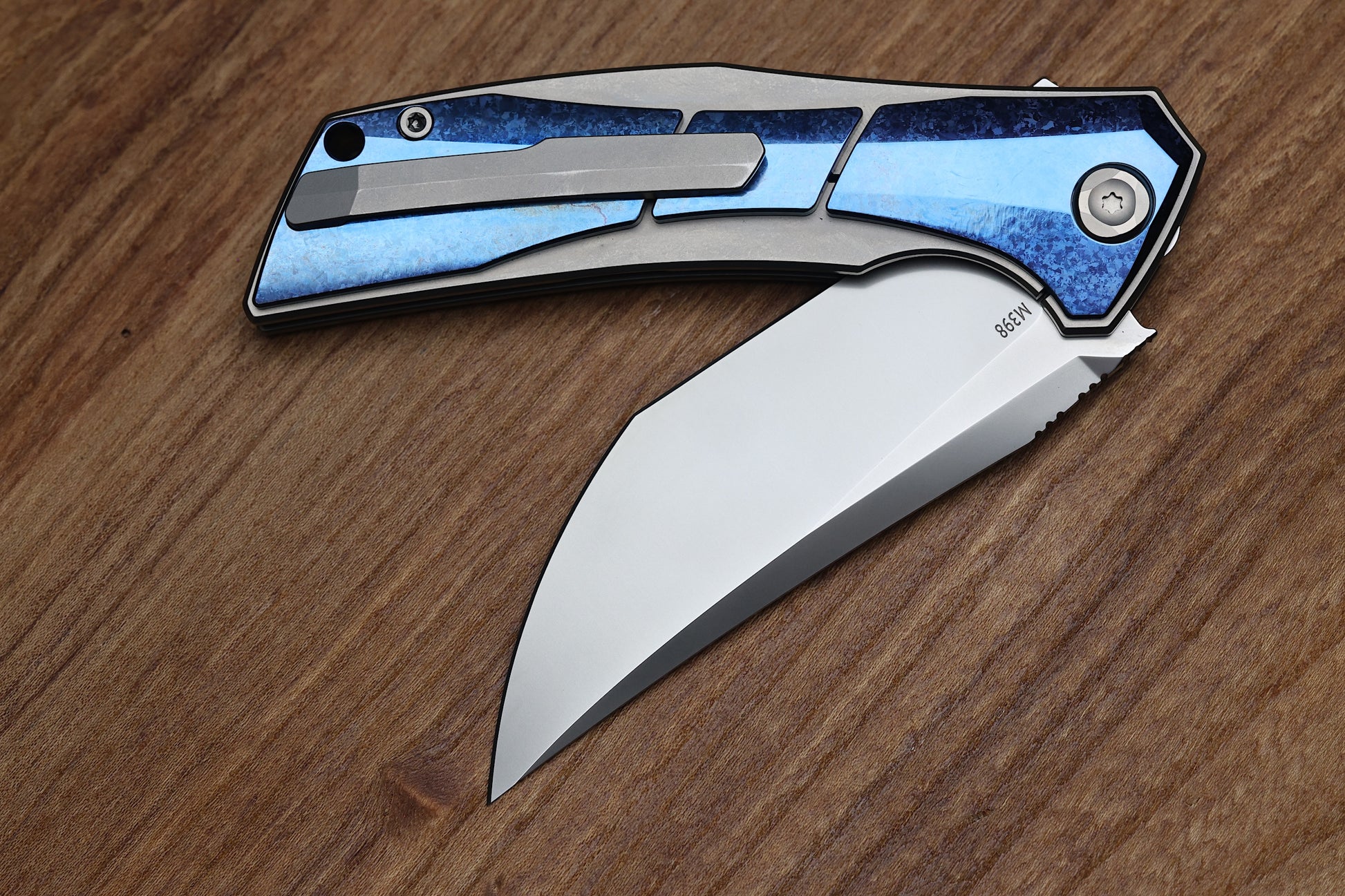 POIKILO BLADE ANOLIS S1 W/ BLUE CRYSTAL TI HANDLES & PEARLESCENT STONEWASH M398