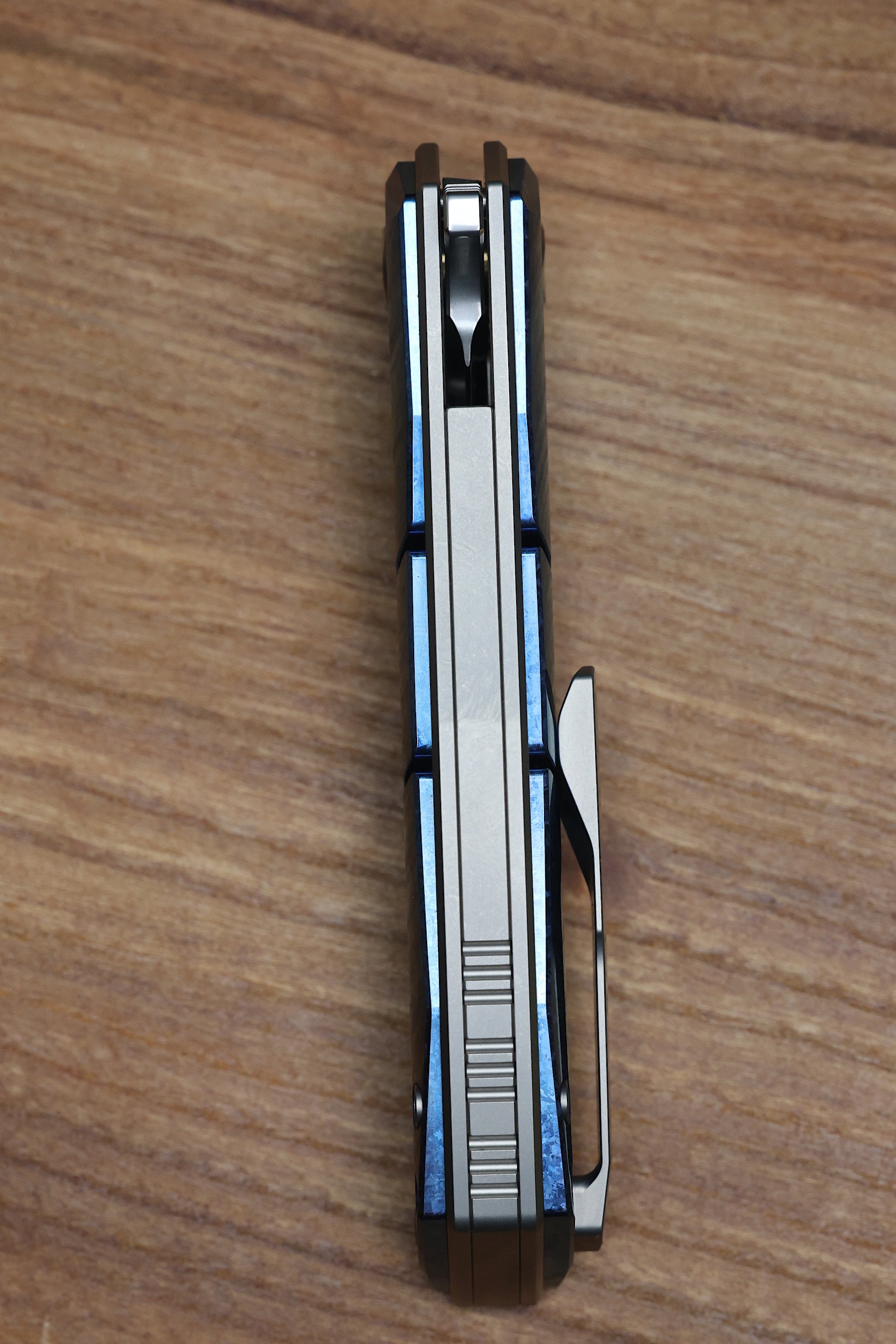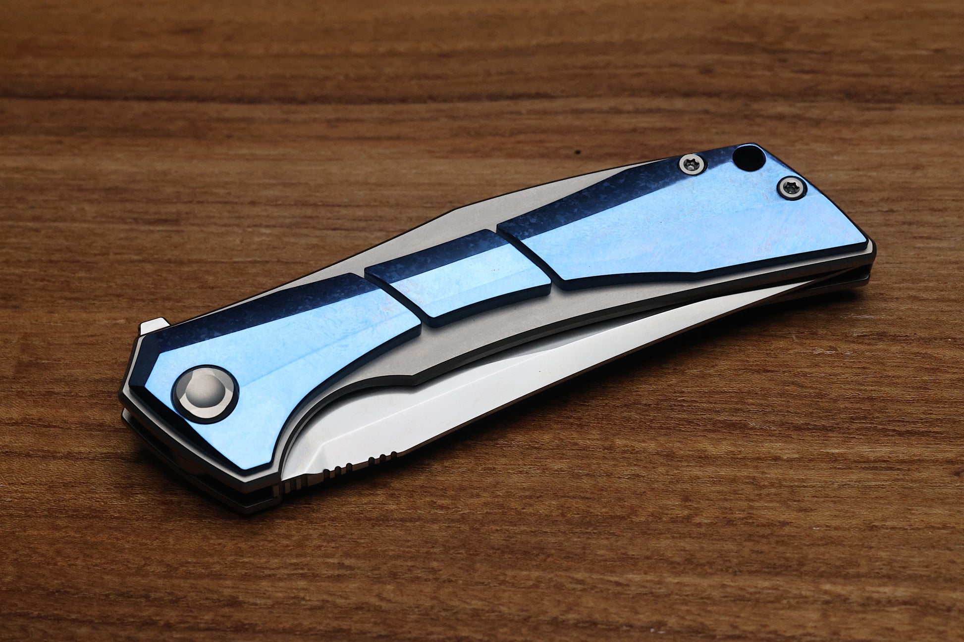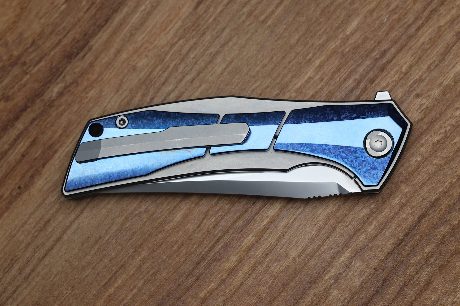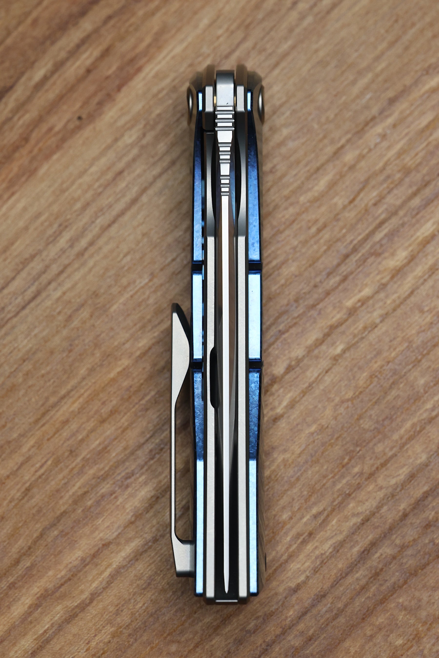 POIKILO BLADE ANOLIS S1 W/ BLUE CRYSTAL TI HANDLES & PEARLESCENT STONEWASH M398
