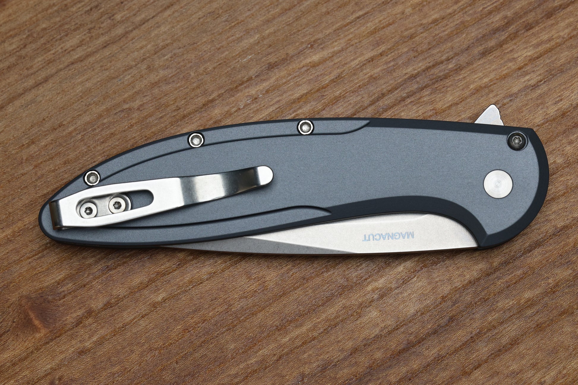 - Grey finish Aluminum handle scales with Purple TechnoCarbo inlay on presentation scale