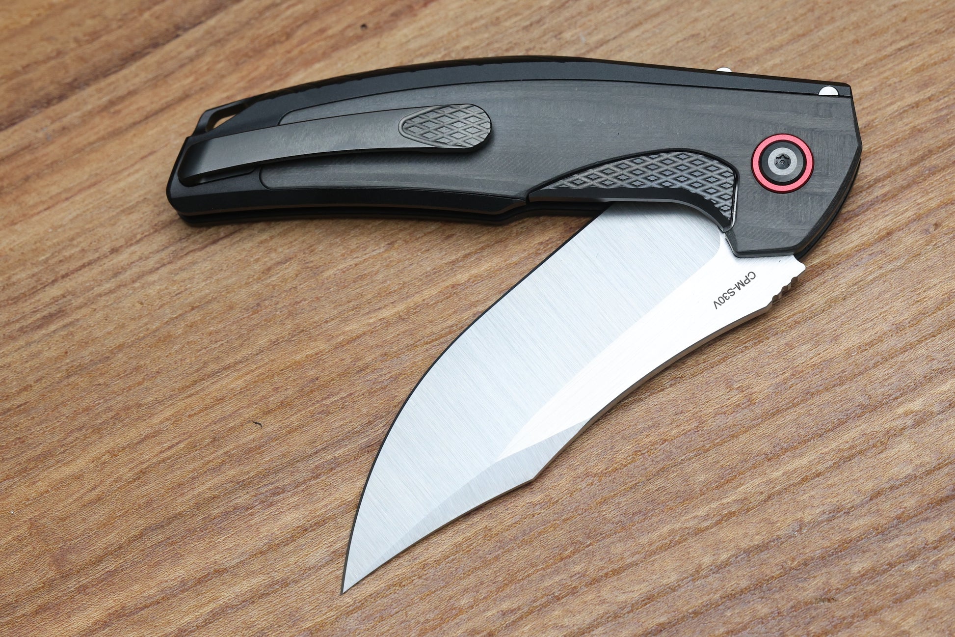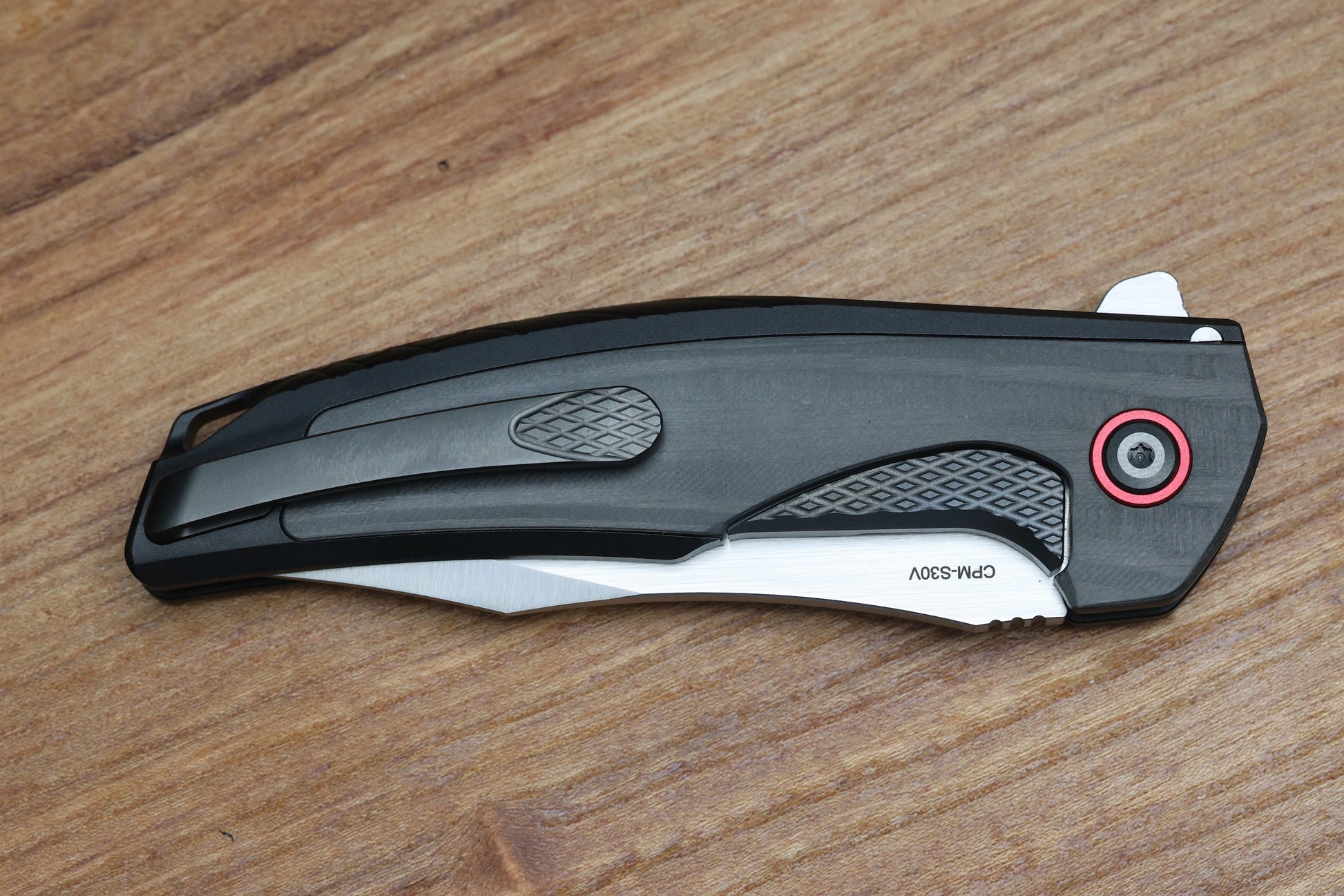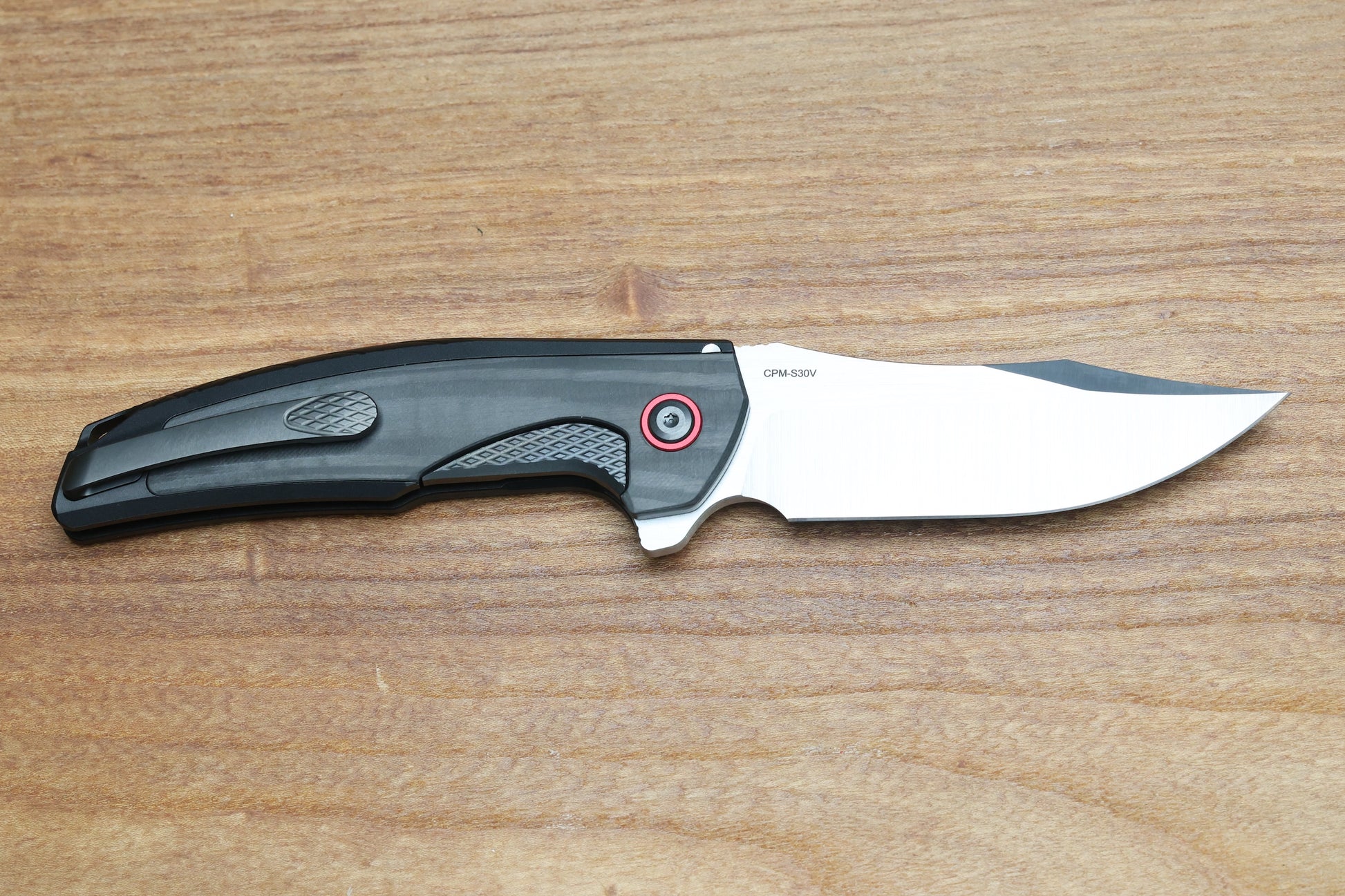 REATE KNIVES JACK JR. BLACK ALUMINUM INTEGRAL HANDLE W/ CARBON FIBER INLAY & RED PIVOT COLLAR & SATIN S30V