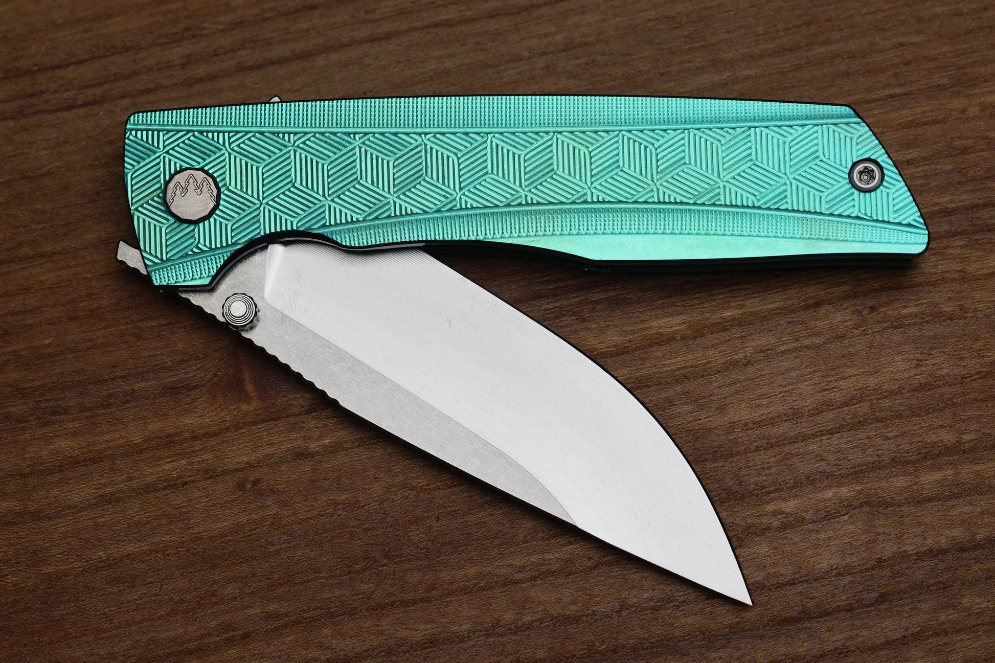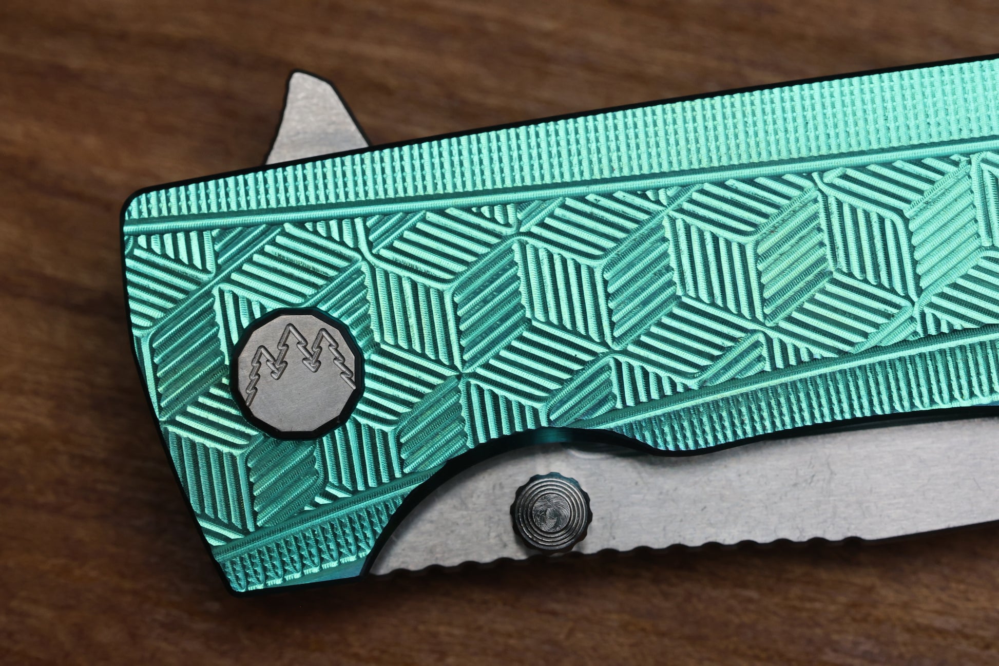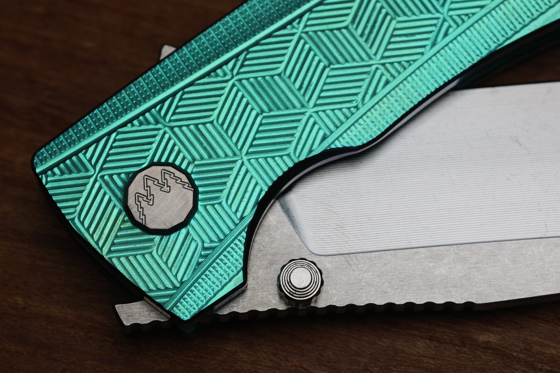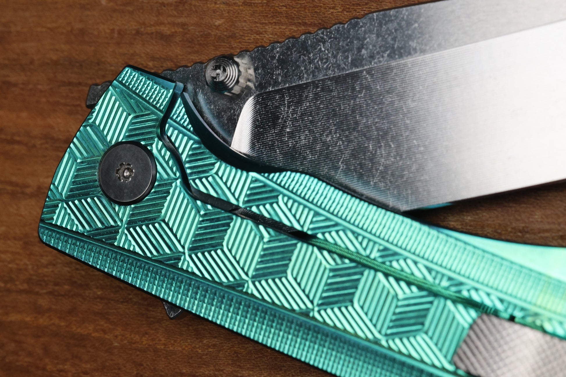 - Satin Raw finish/Green anodized Titanium frame lock handle scales with "3D Cubes" milling pattern