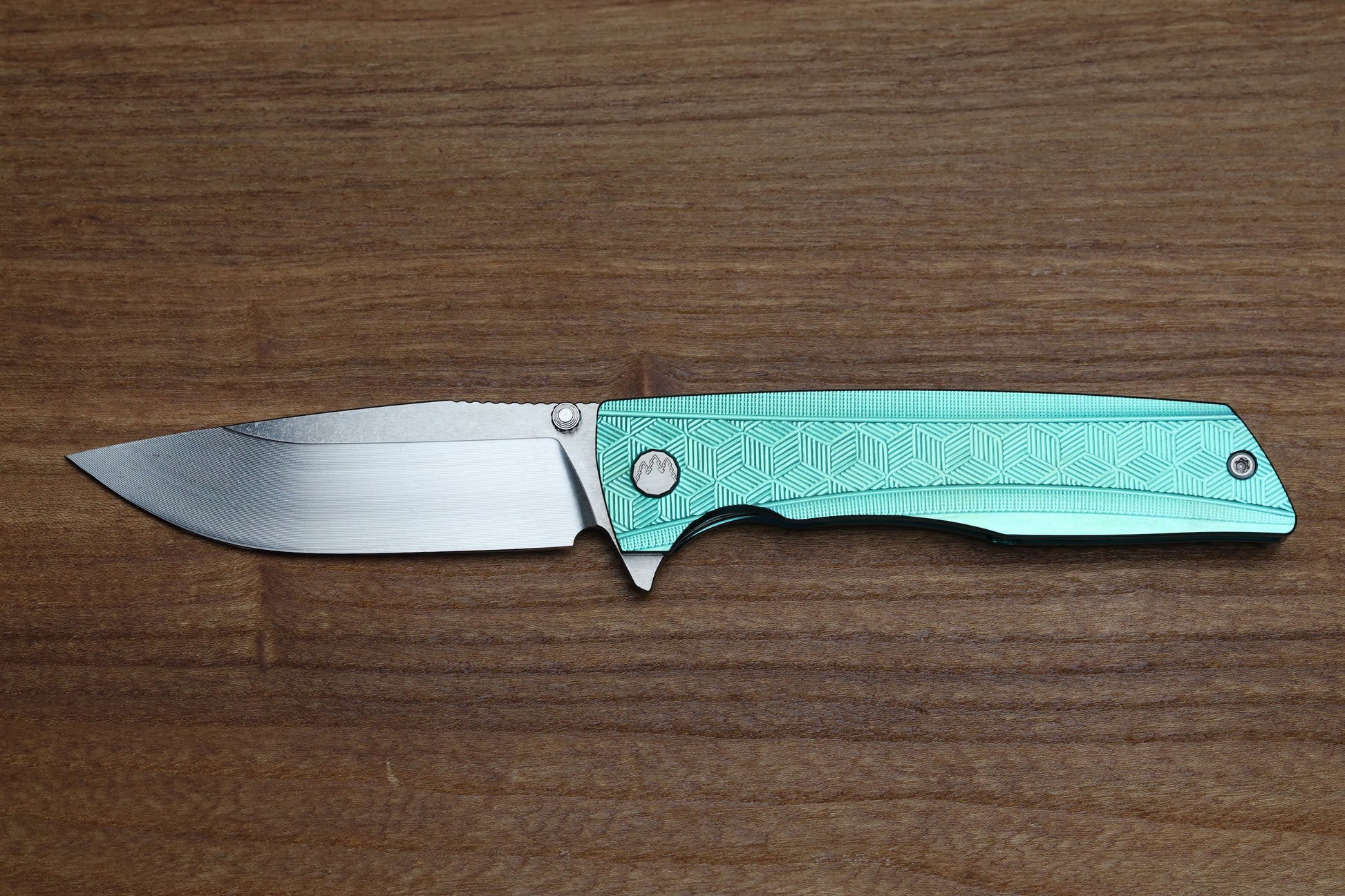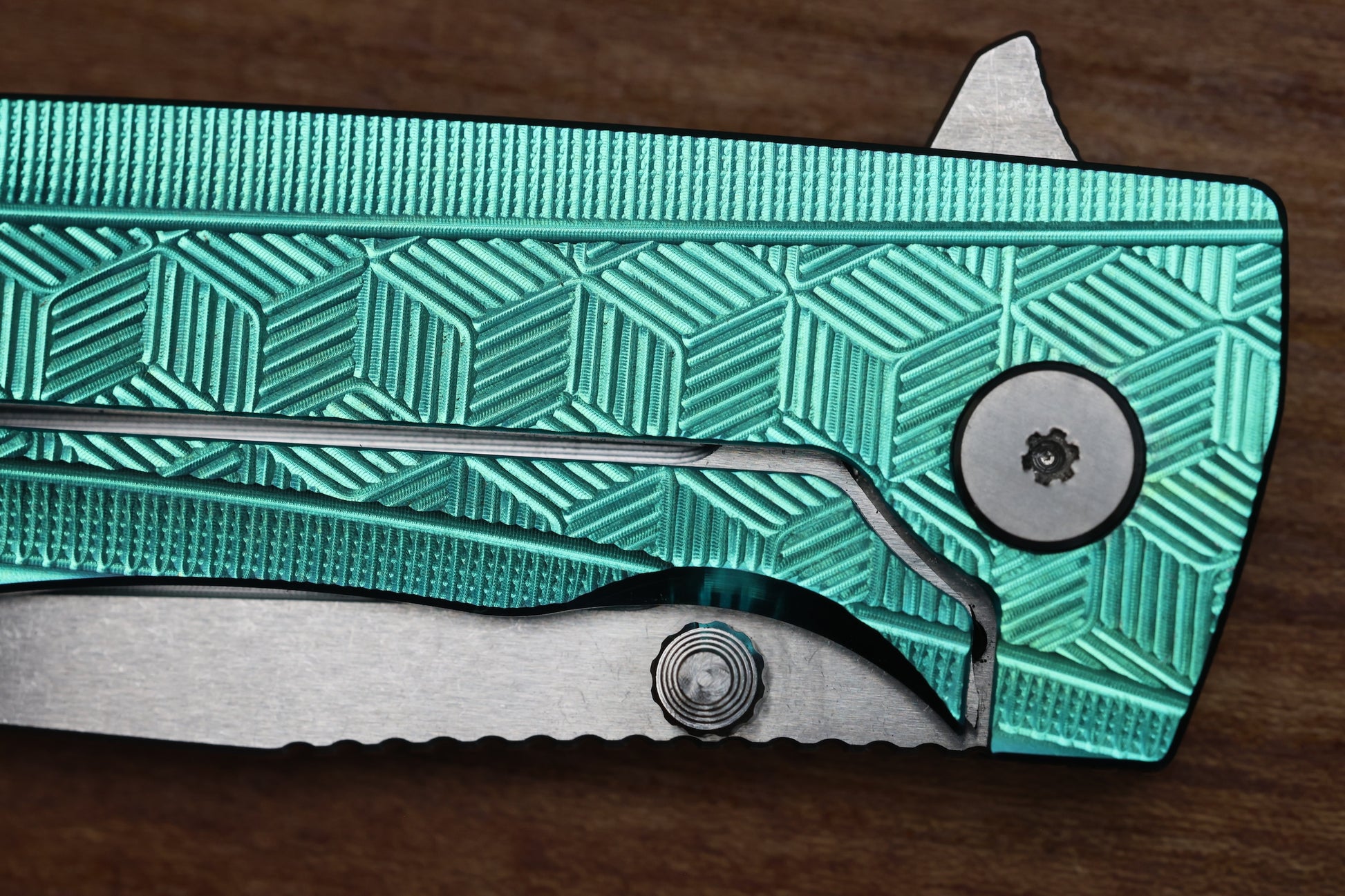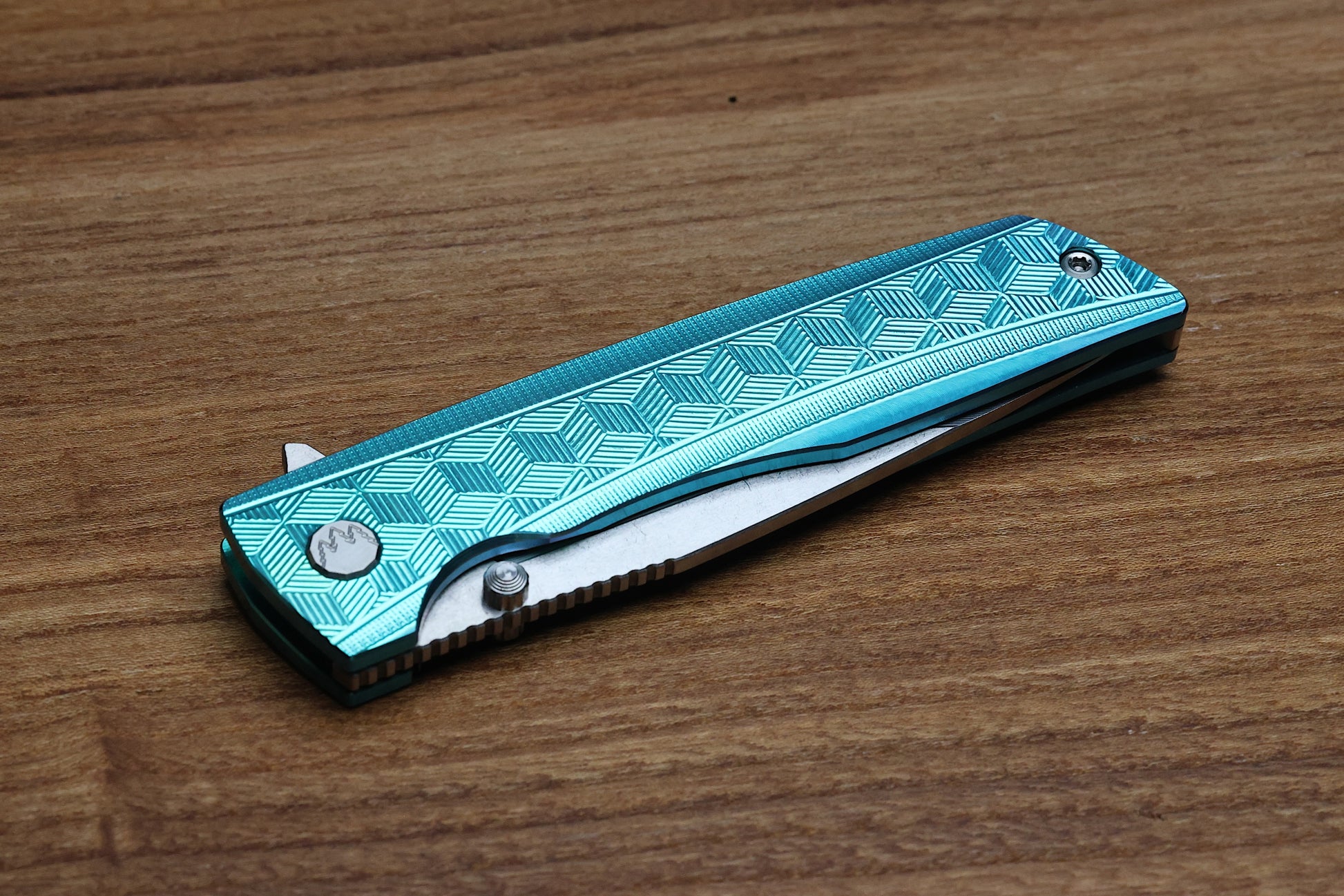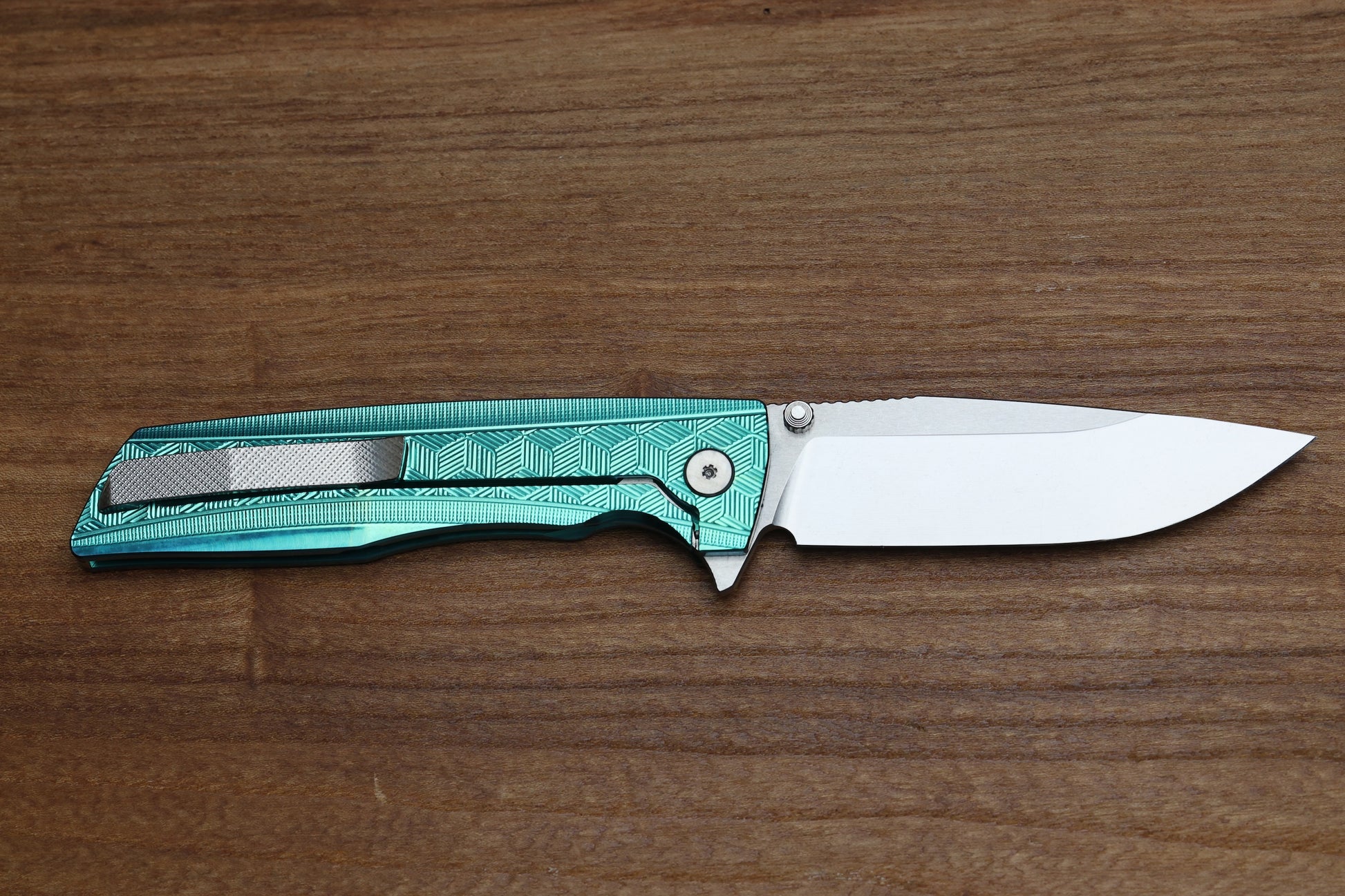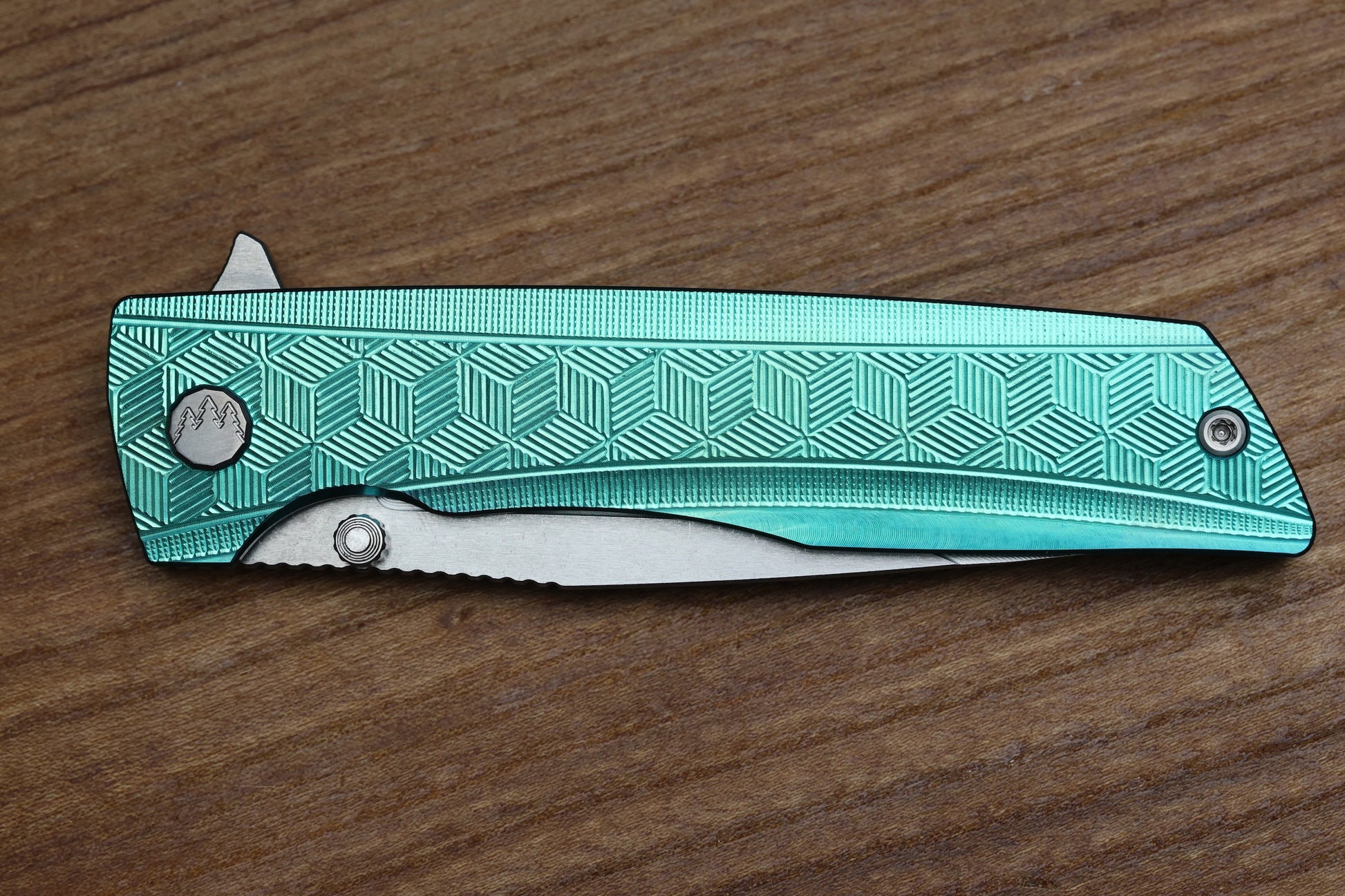 - Satin Raw finish/Green anodized Titanium frame lock handle scales with "3D Cubes" milling pattern
