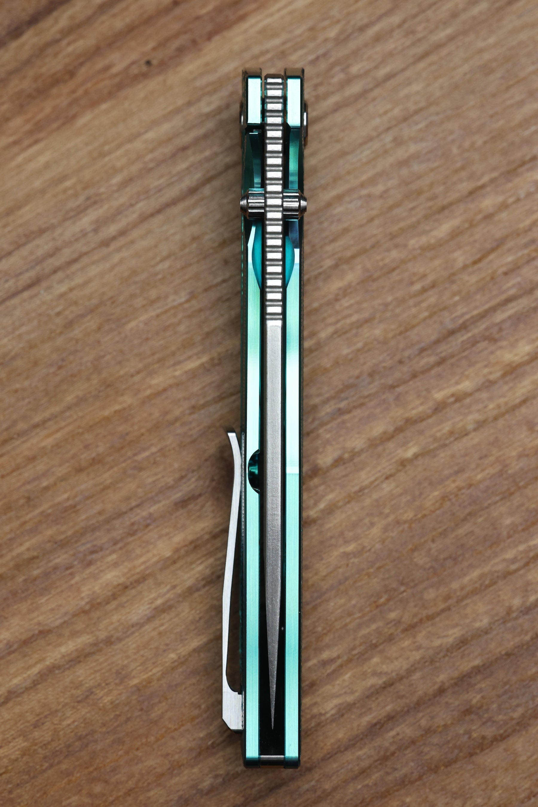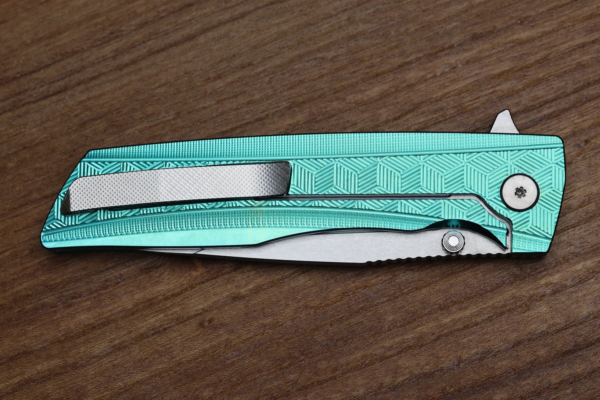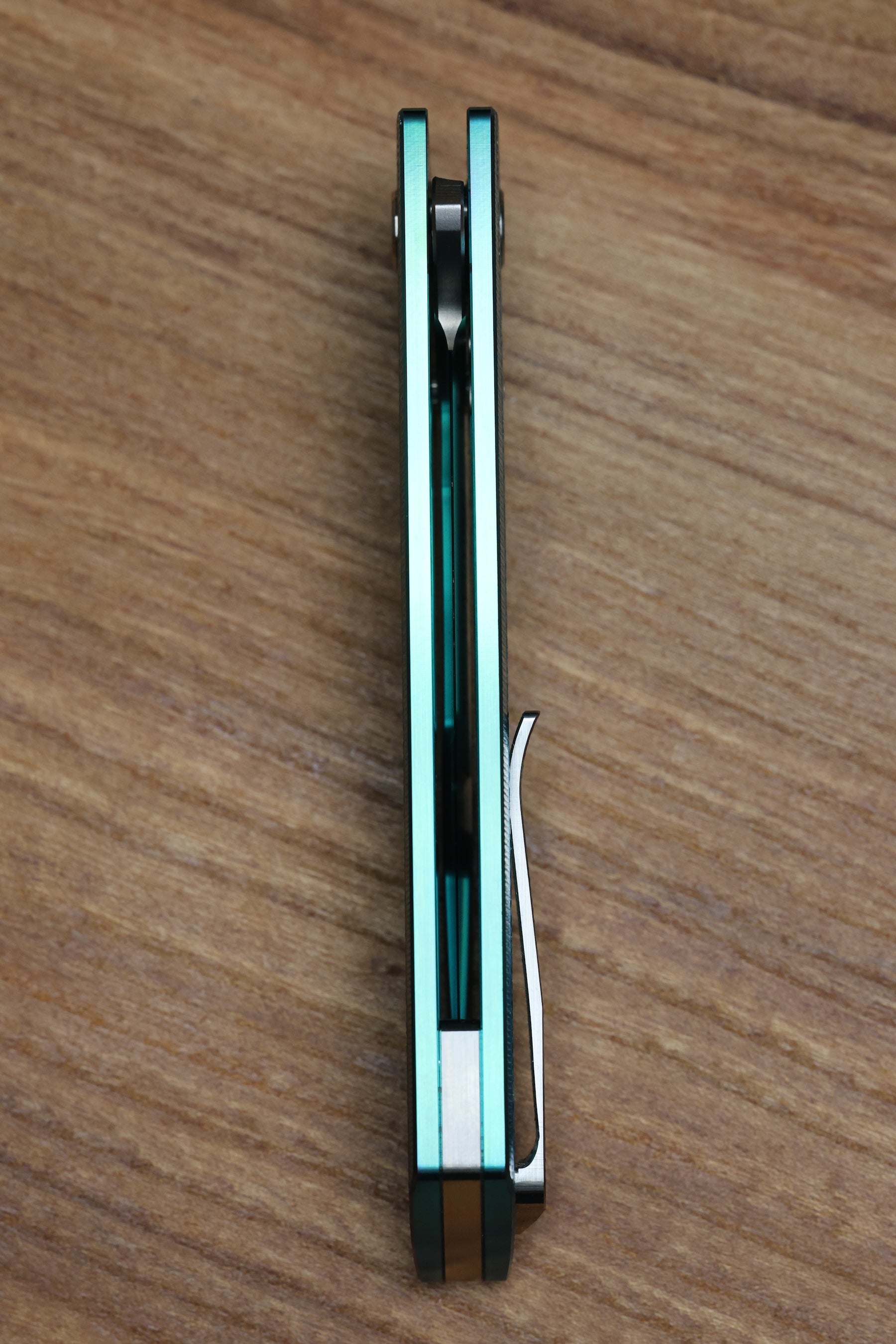 - Tip up satin finish Titanium pocket clip with hidden screw and fine textured milling pattern