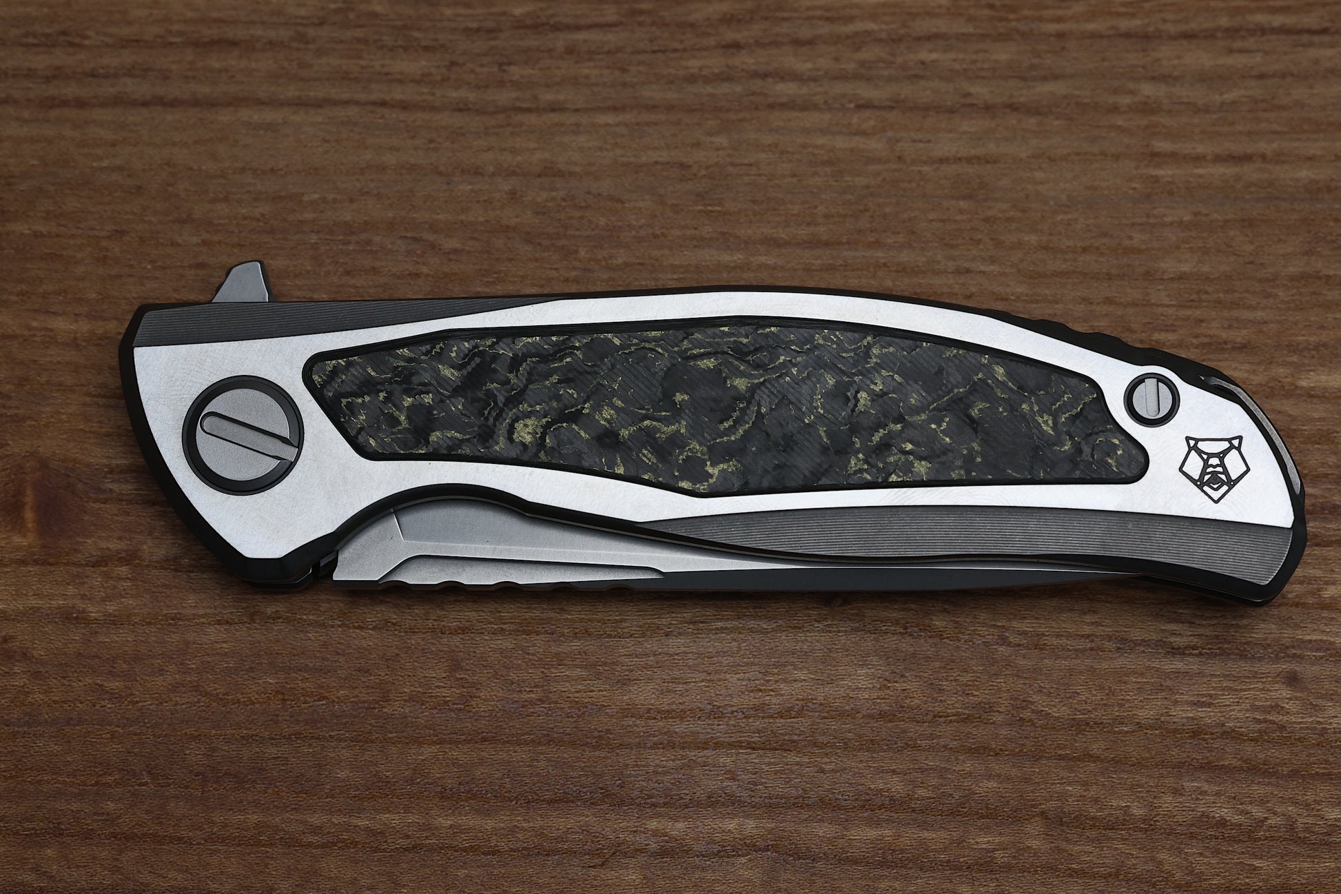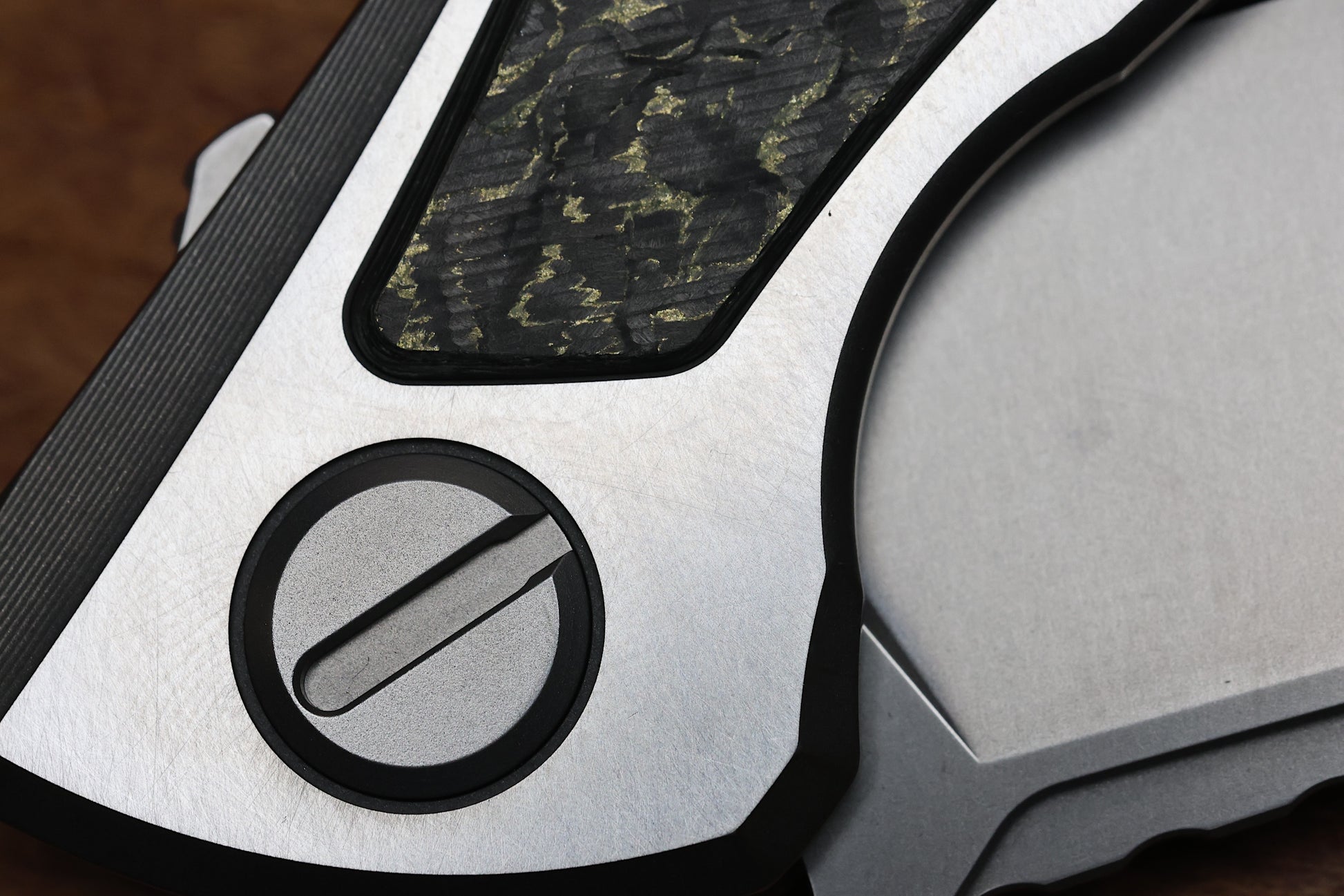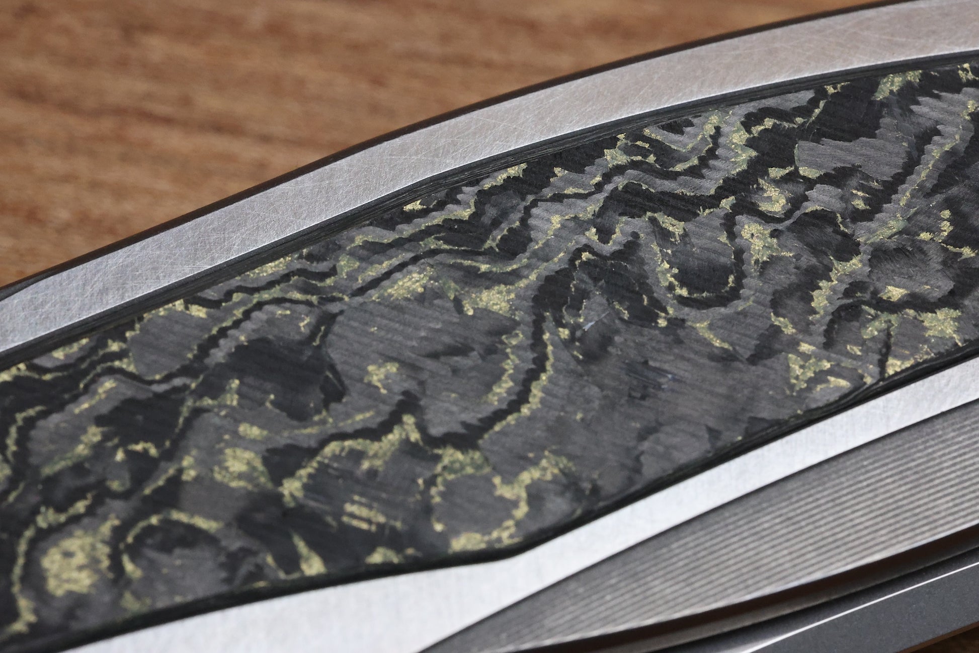 - Stonewashed Titanium frame lock handle scales with Olive TechnoCarbo inlays