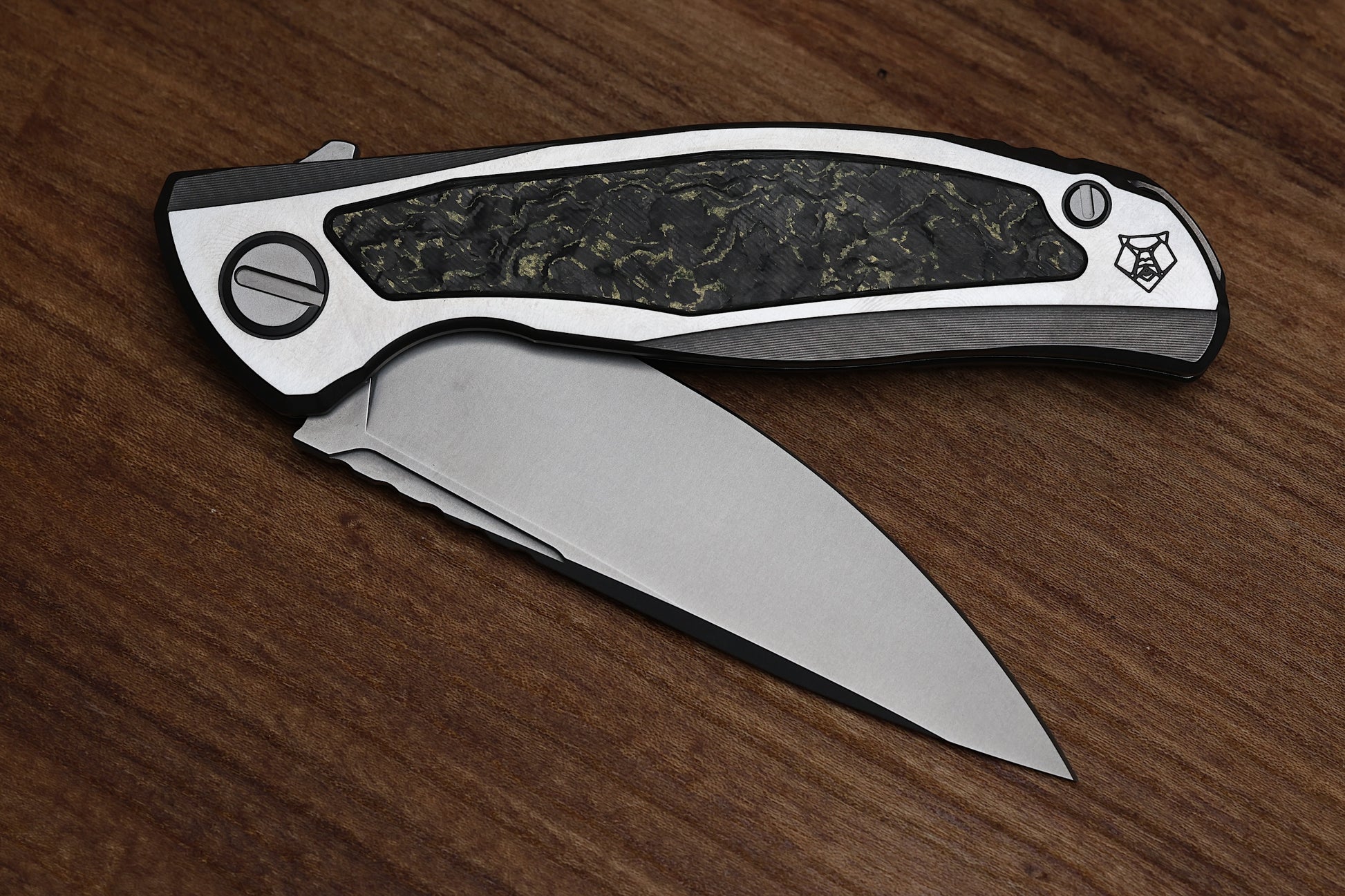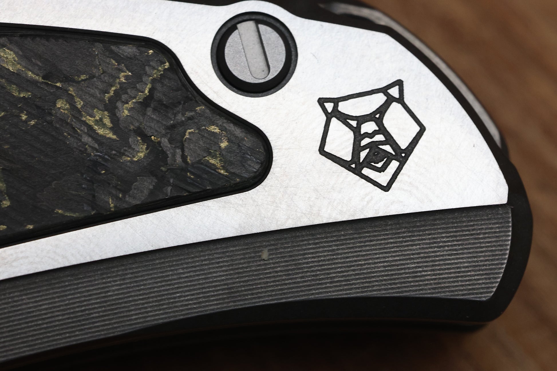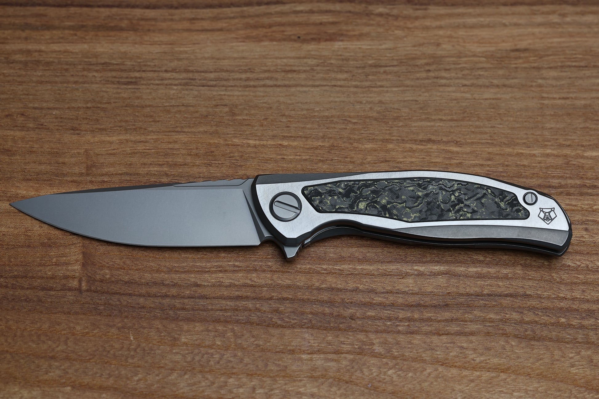 - Stonewashed Titanium frame lock handle scales with Olive TechnoCarbo inlays