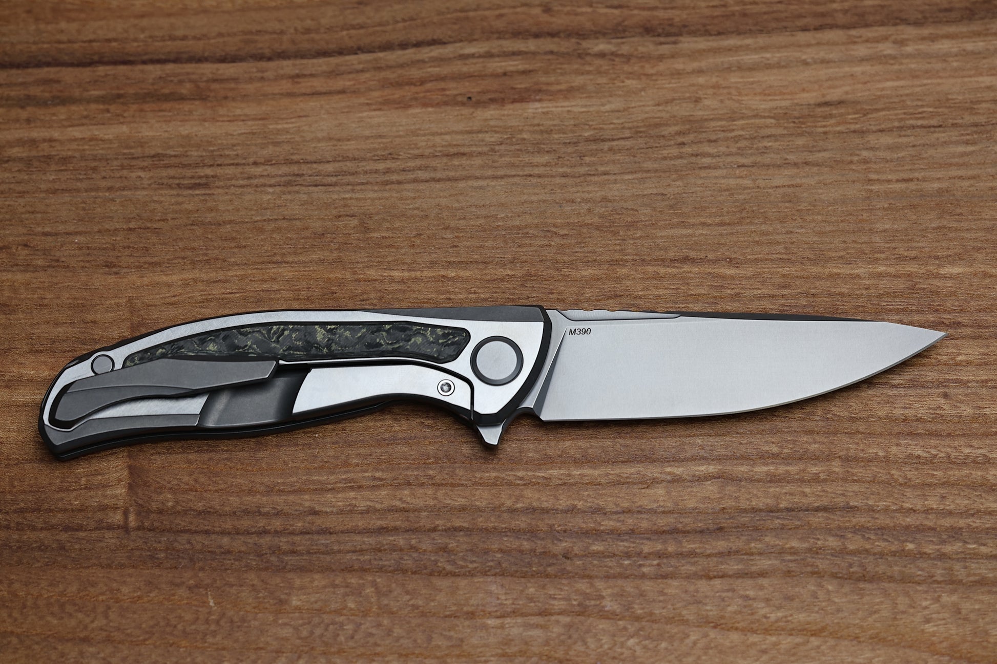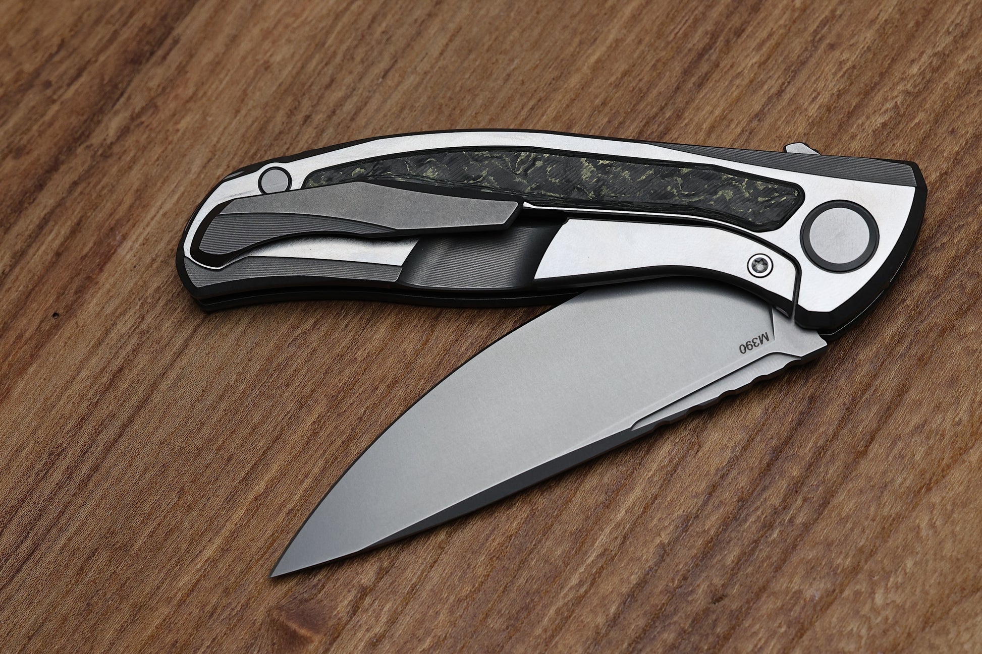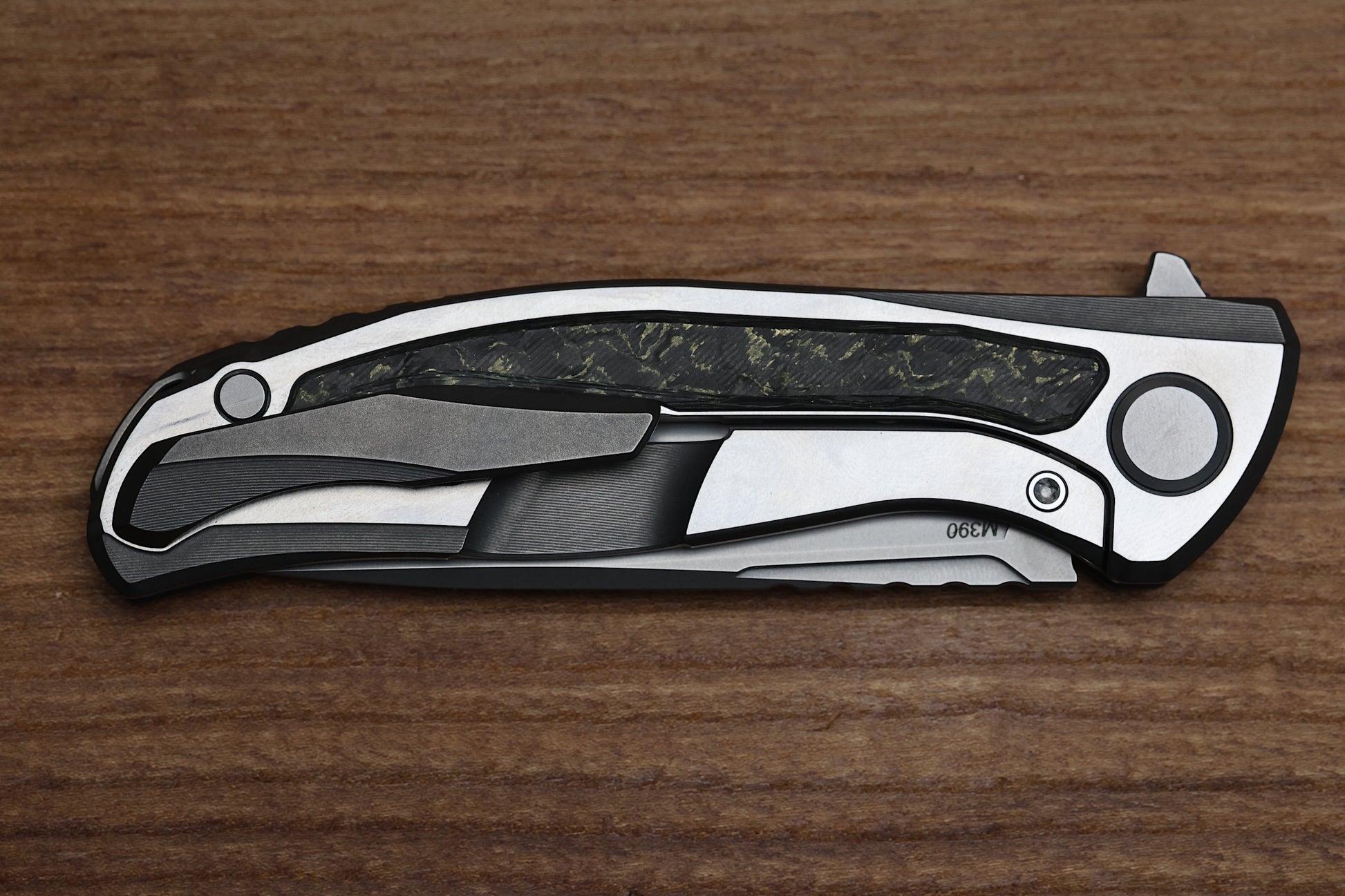 3.75" Stonewashed M390 blade with jimping on the spine and 4.00" cutting edge