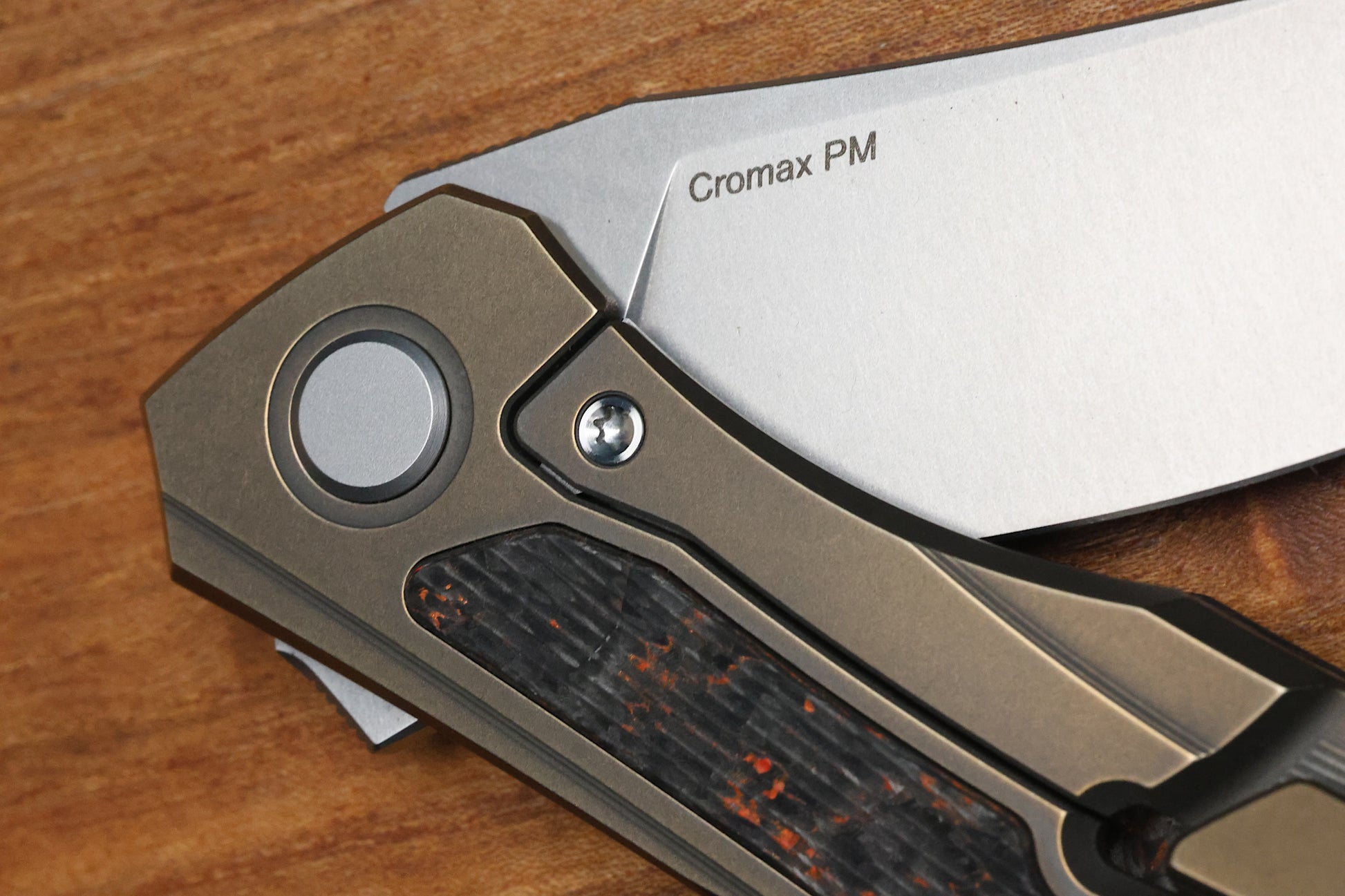 - 3.74" stonewashed Cromax PM blade with jimping on spine and 4.175" cutting edge