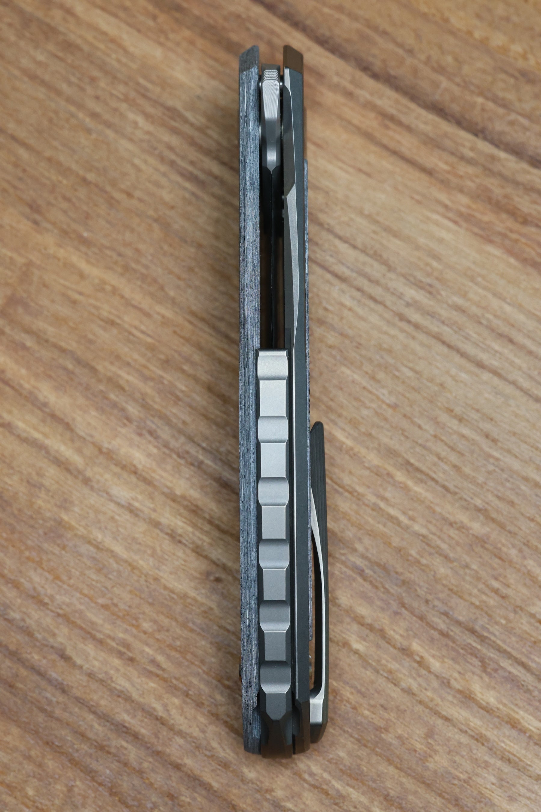 - Tip up stonewashed Titanium pocket clip with hidden screw