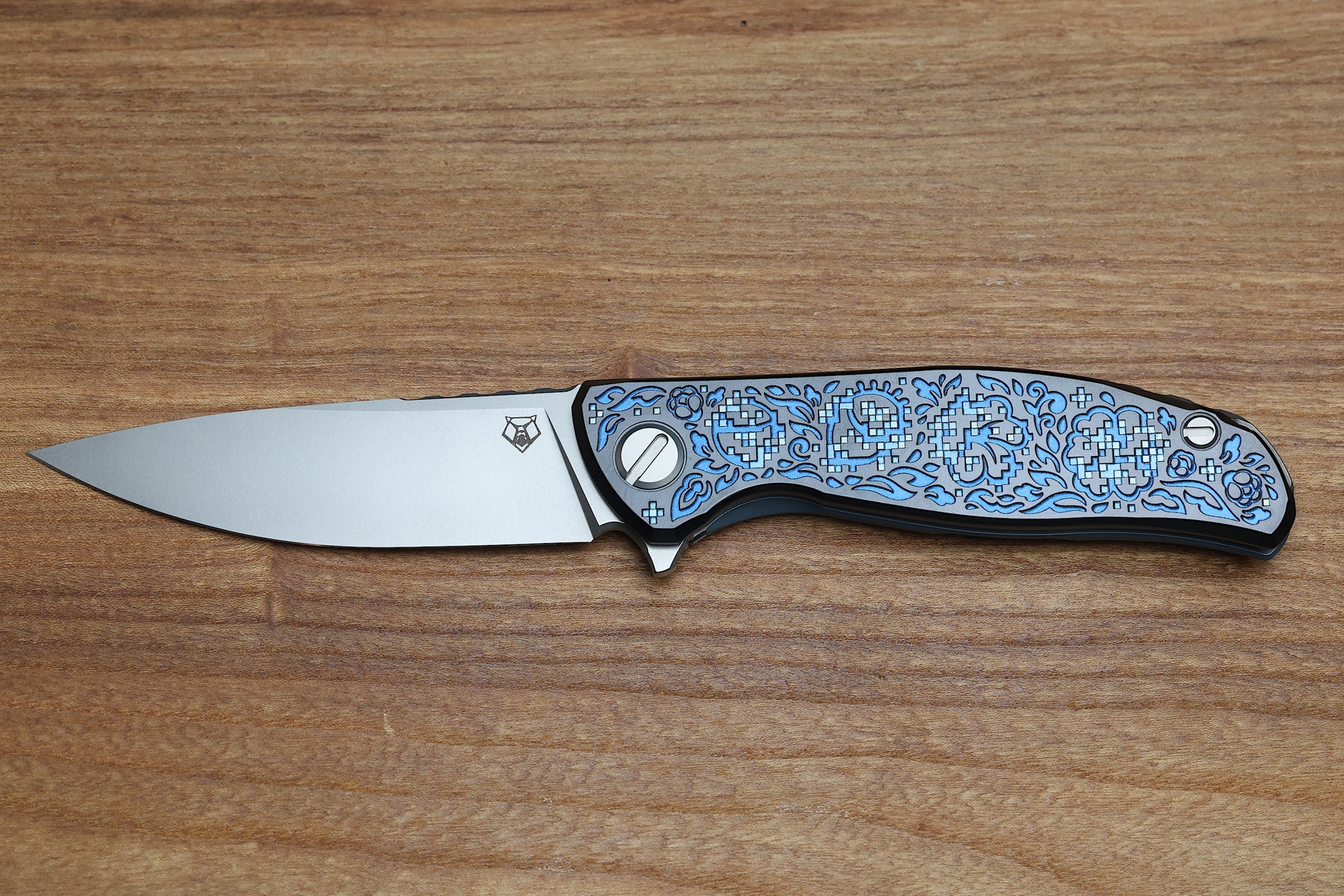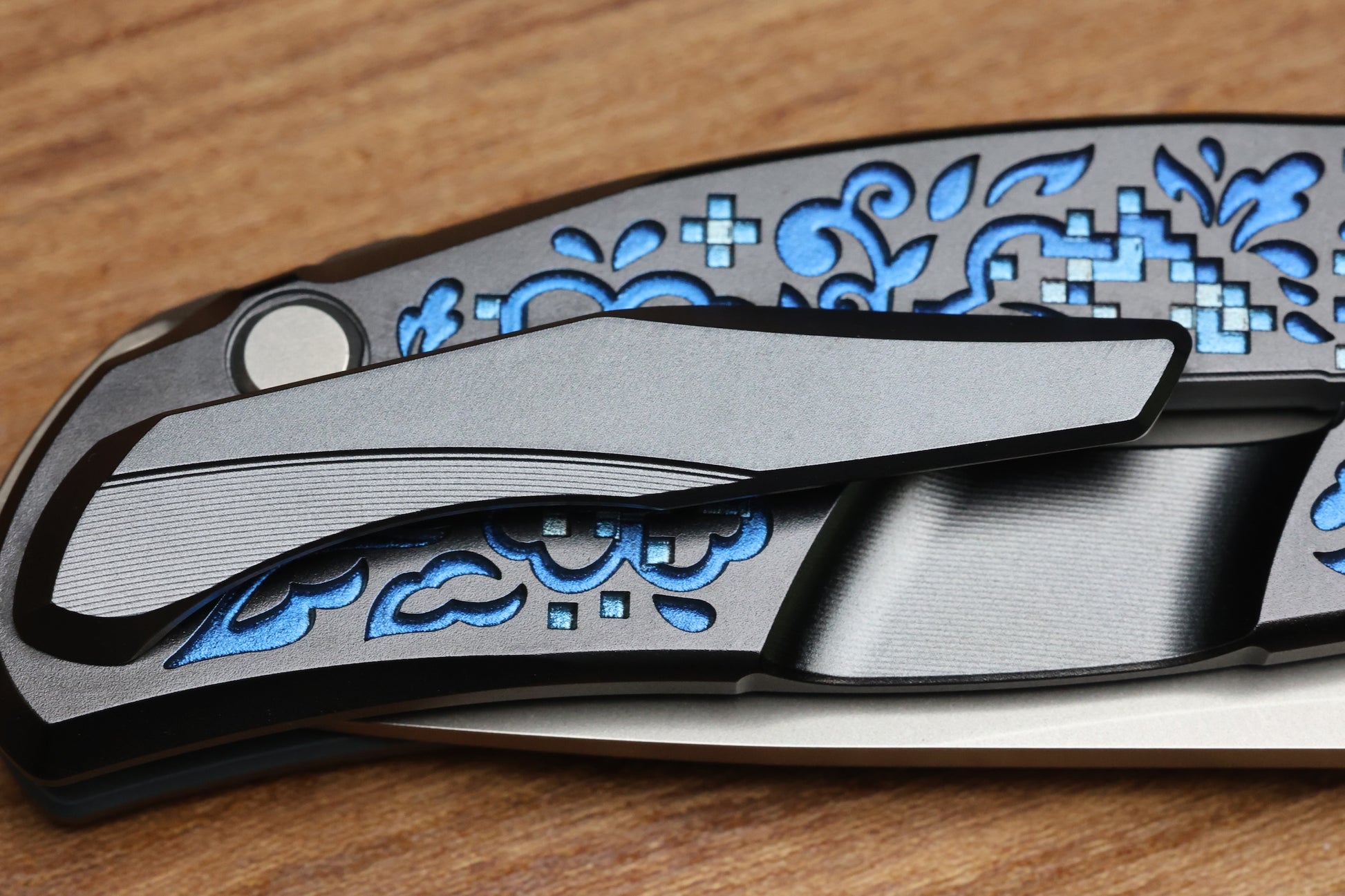 - Titanium frame-lock handle scales with Blue Lazano/Black Hula finish and unique "Pixelated Flower" artwork done by Mike Bond (Ti2 Design)