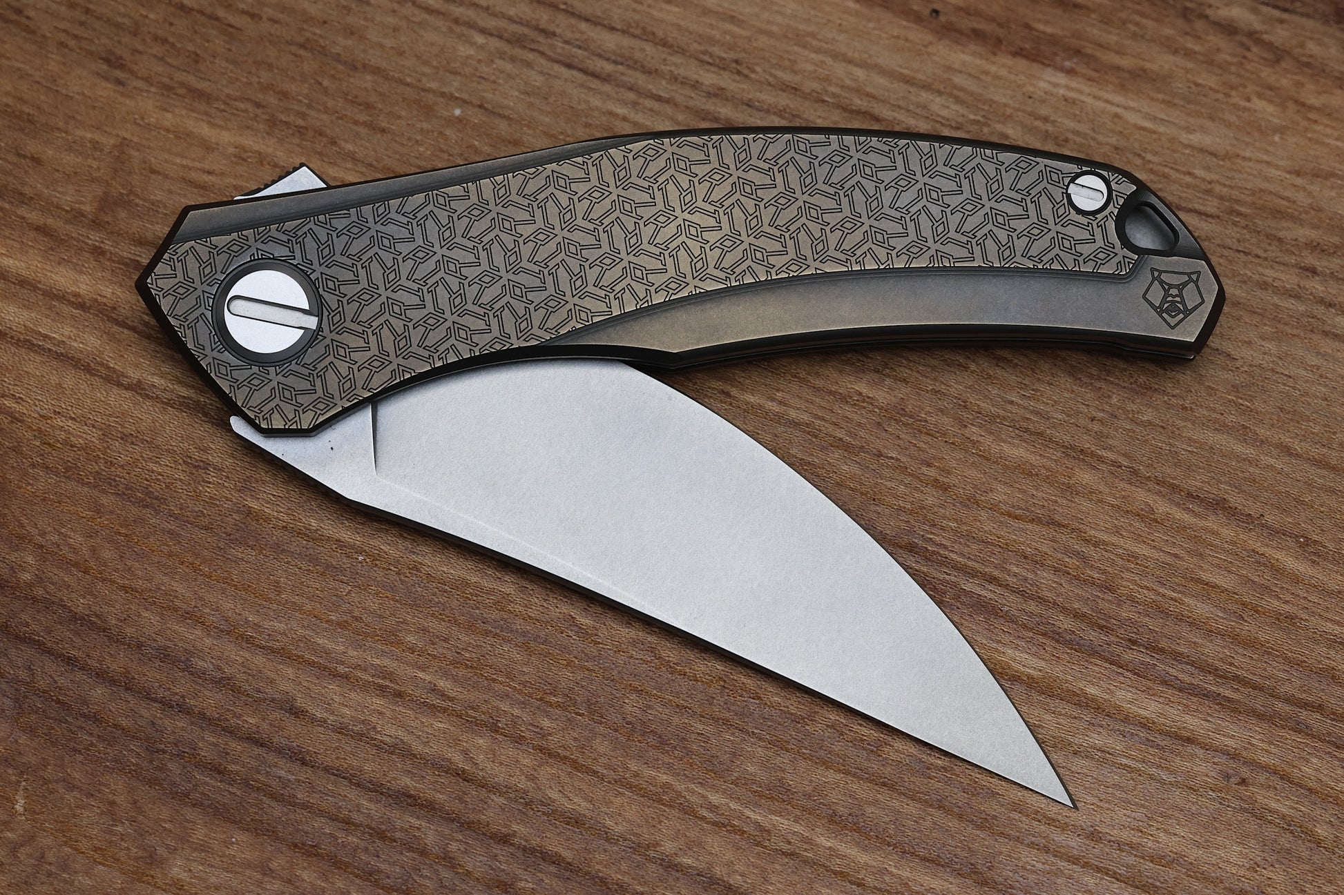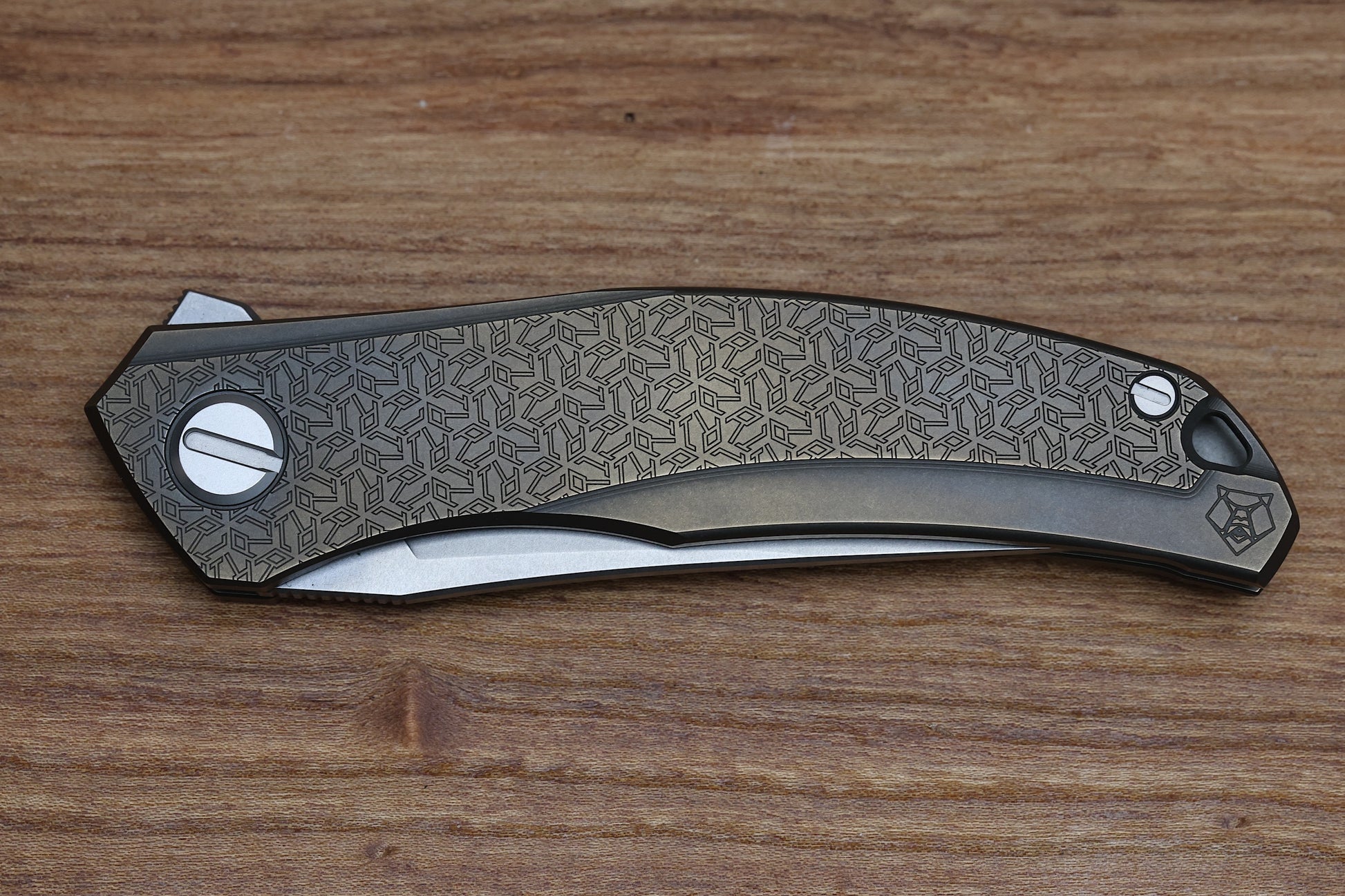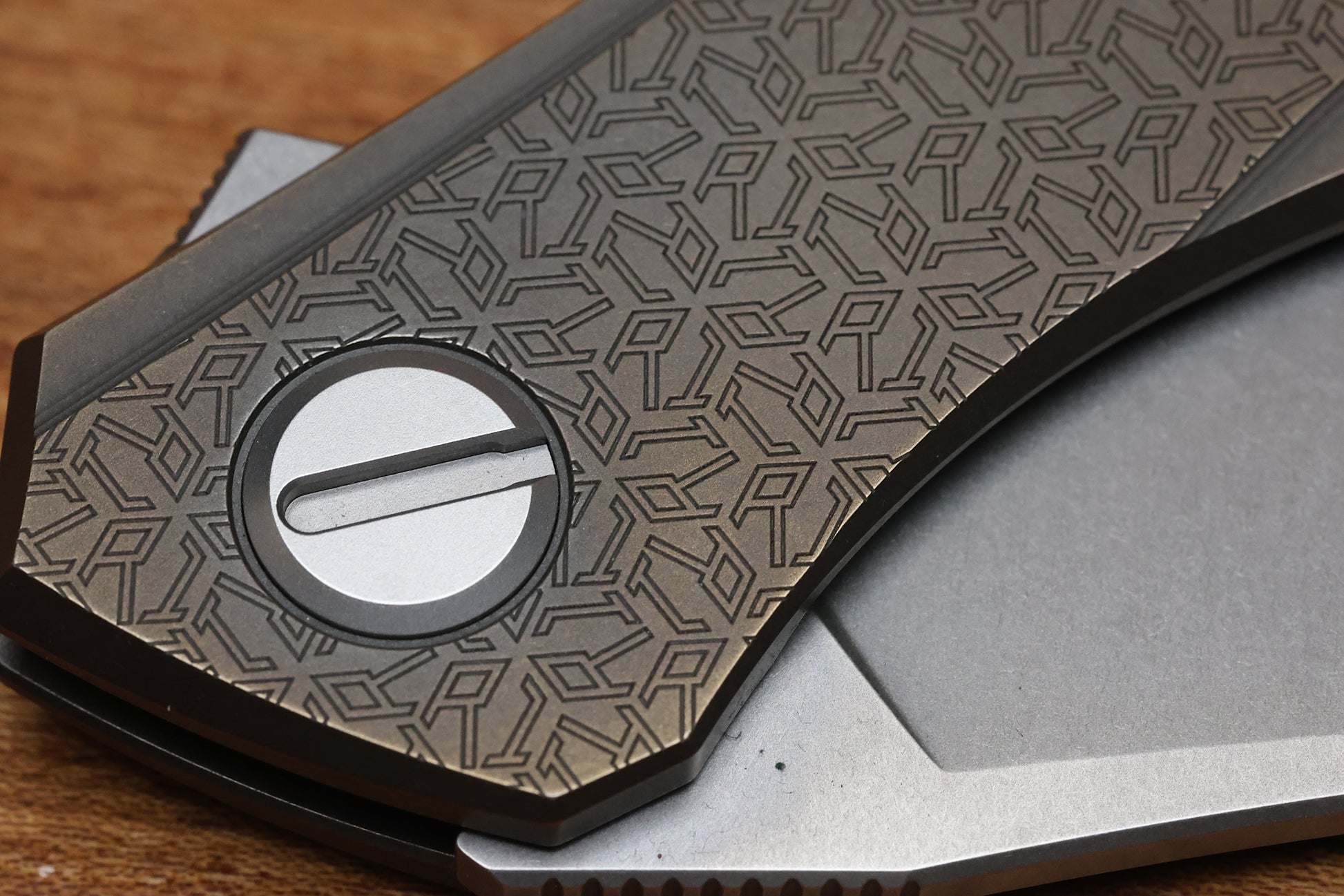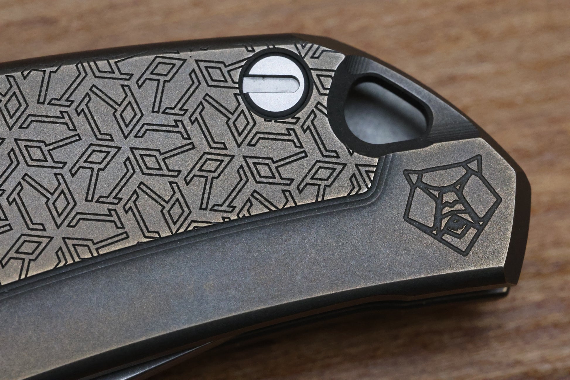 - Bronze anodized Titanium frame lock handle scales with R1 Pattern