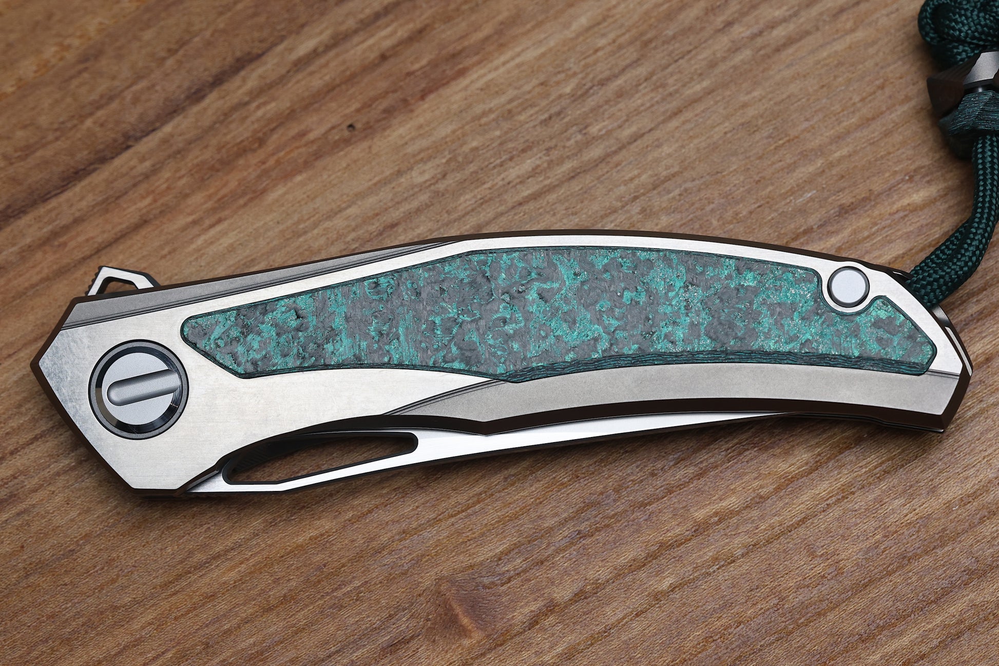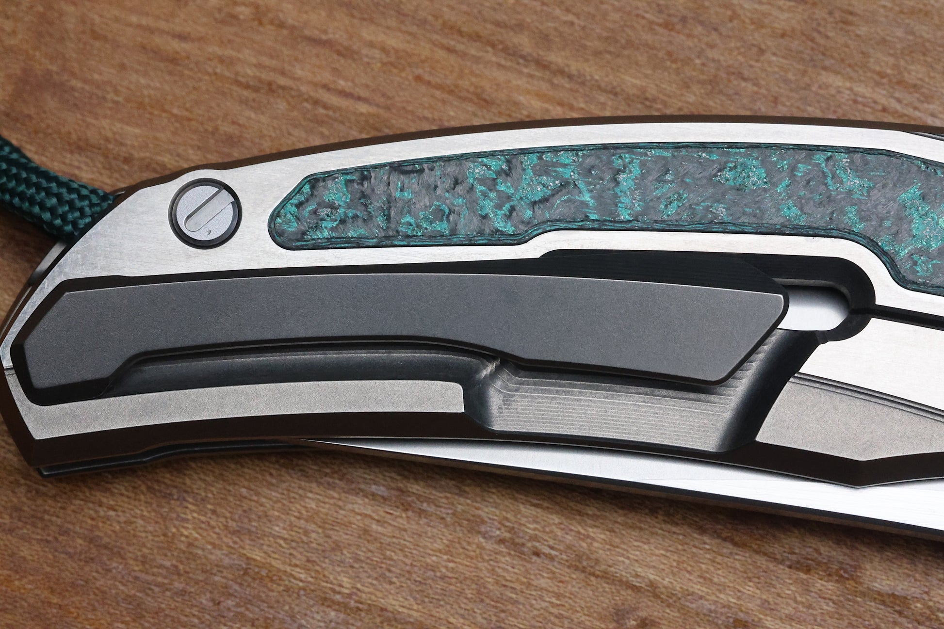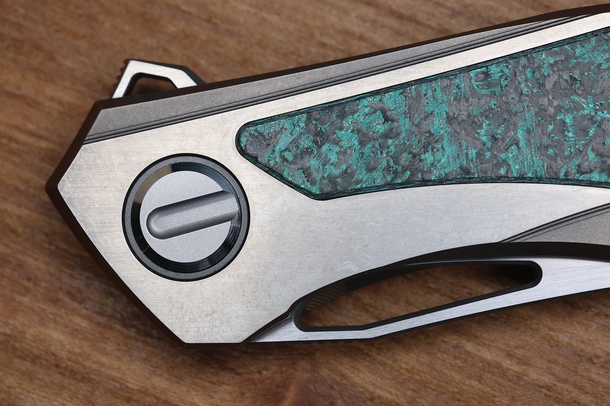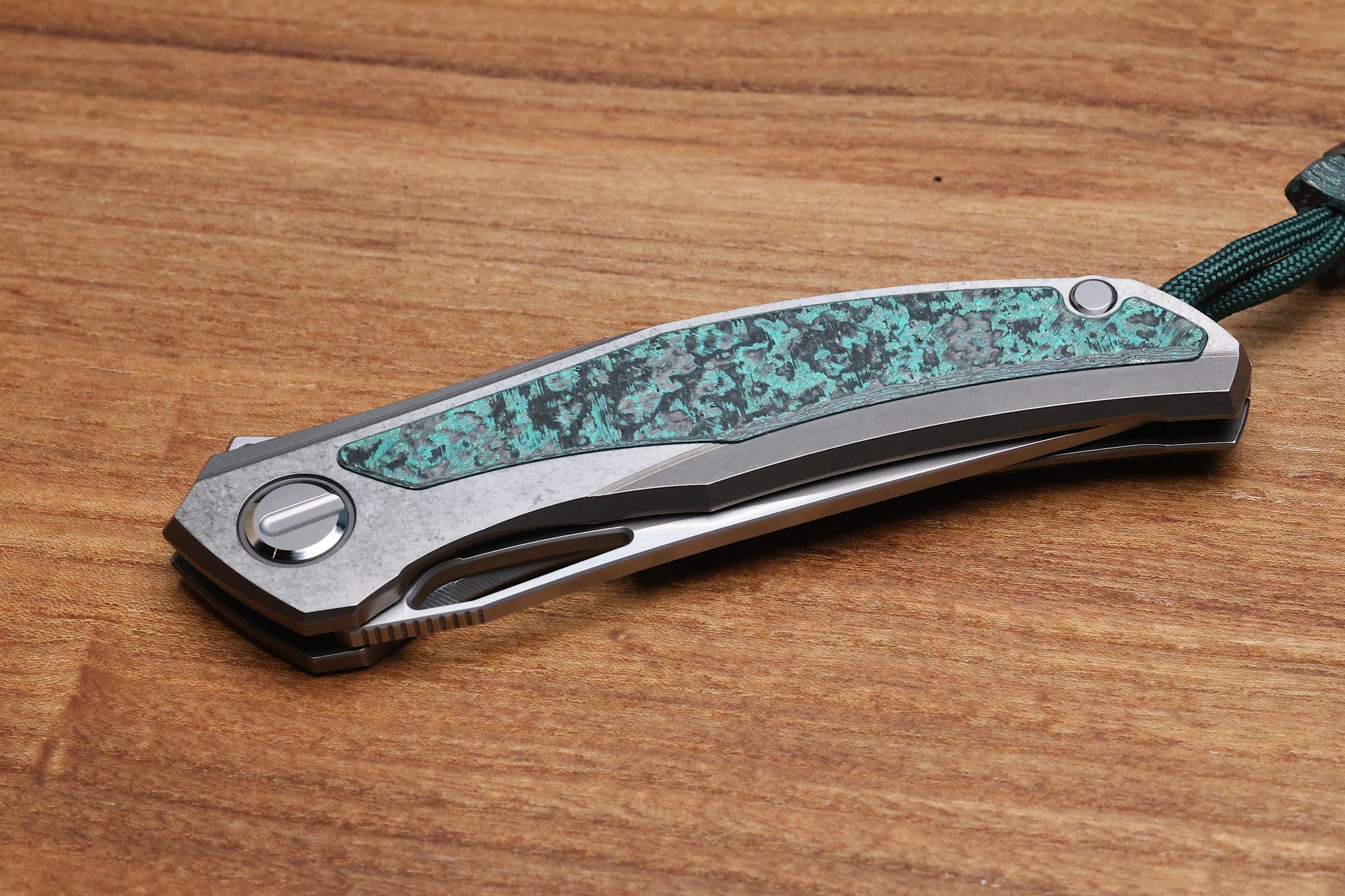 - Stonewashed/polished flats Titanium frame lock handle scales with Teal Magnetic CarboTi inlays- Pattern may vary