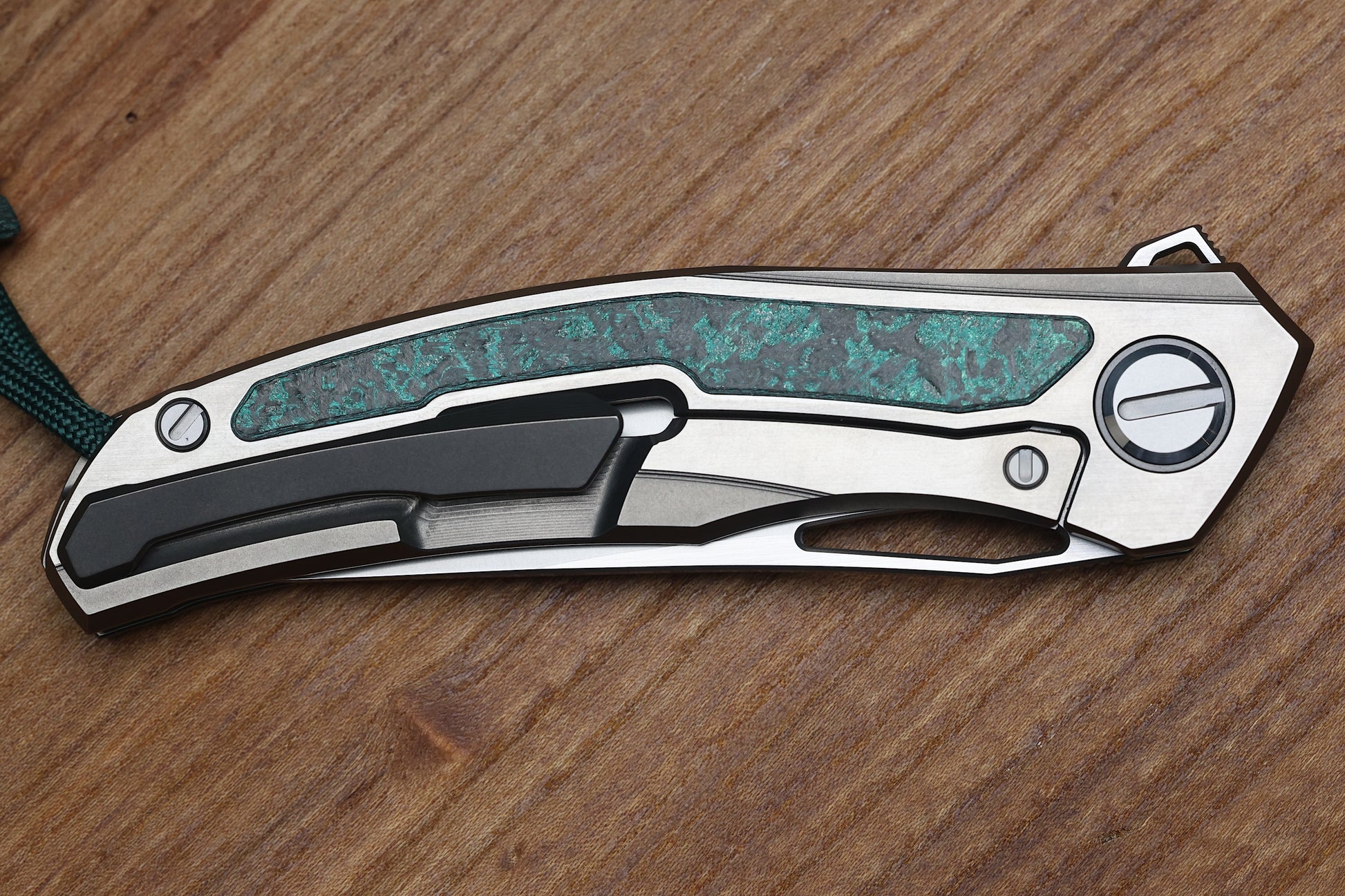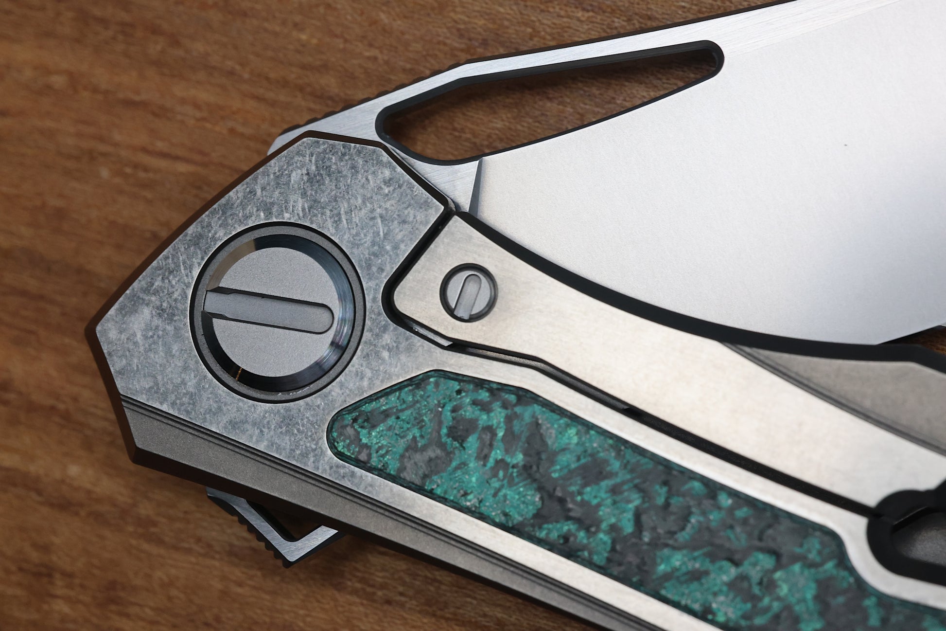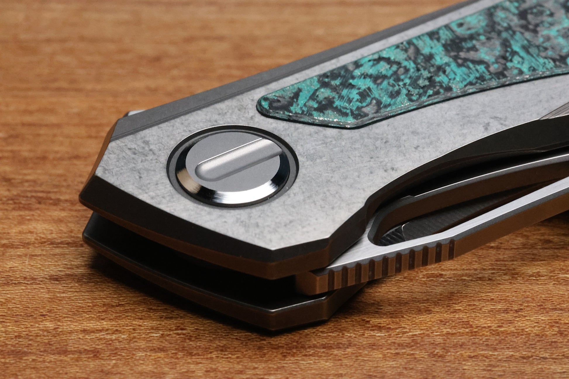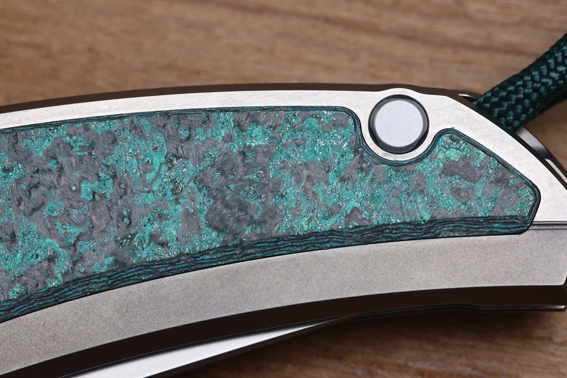- Stonewashed/polished flats Titanium frame lock handle scales with Teal Magnetic CarboTi inlays- Pattern may vary