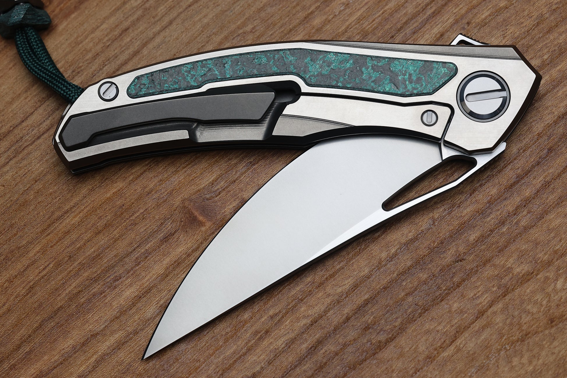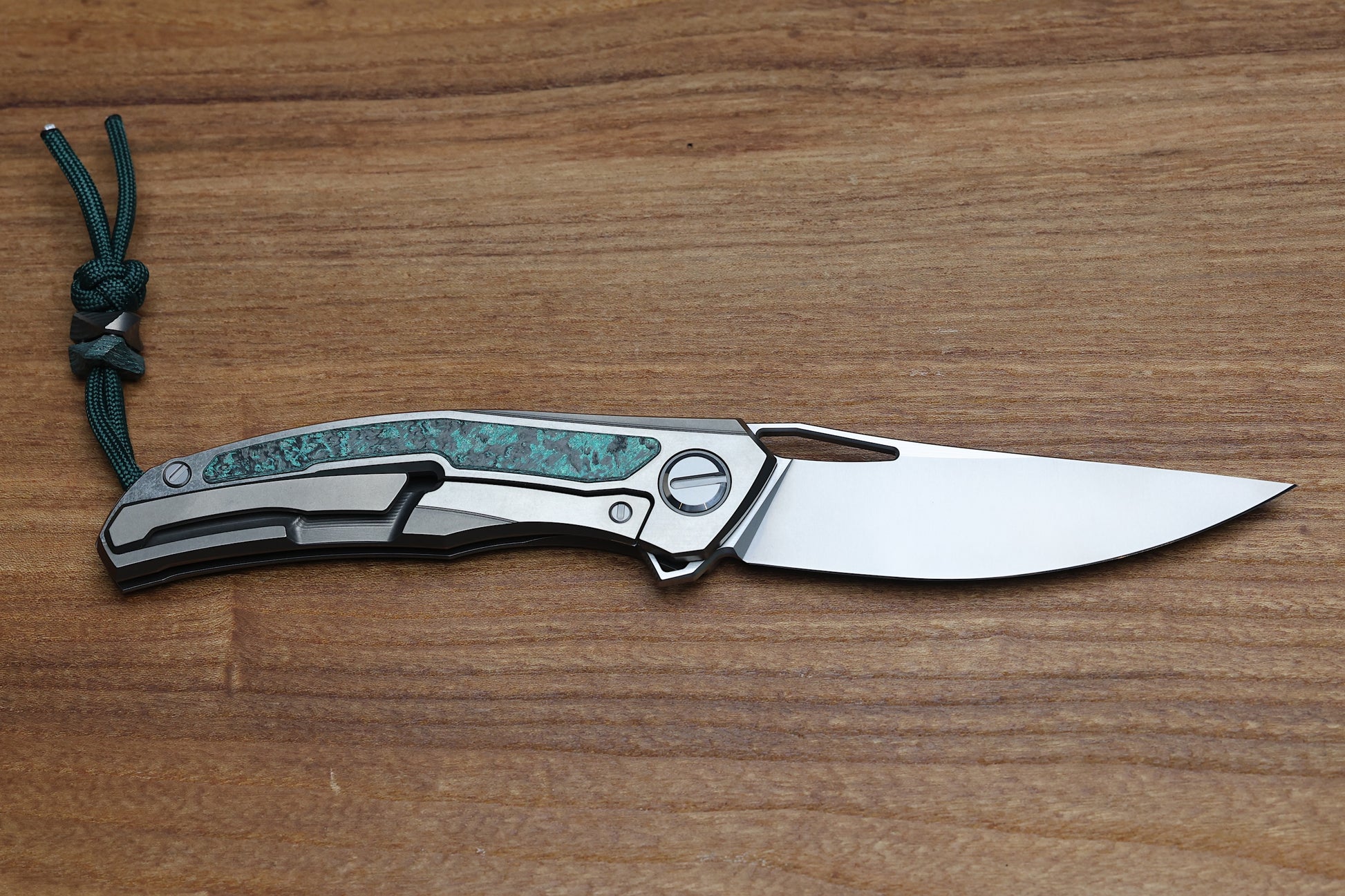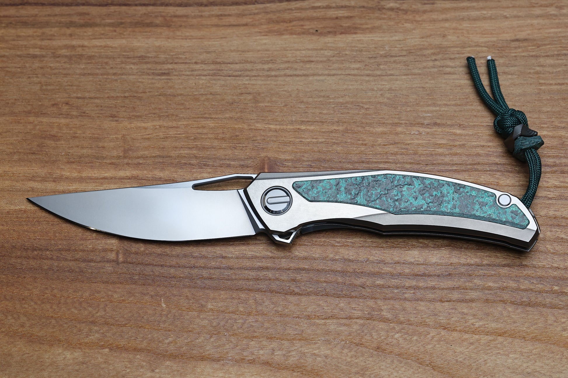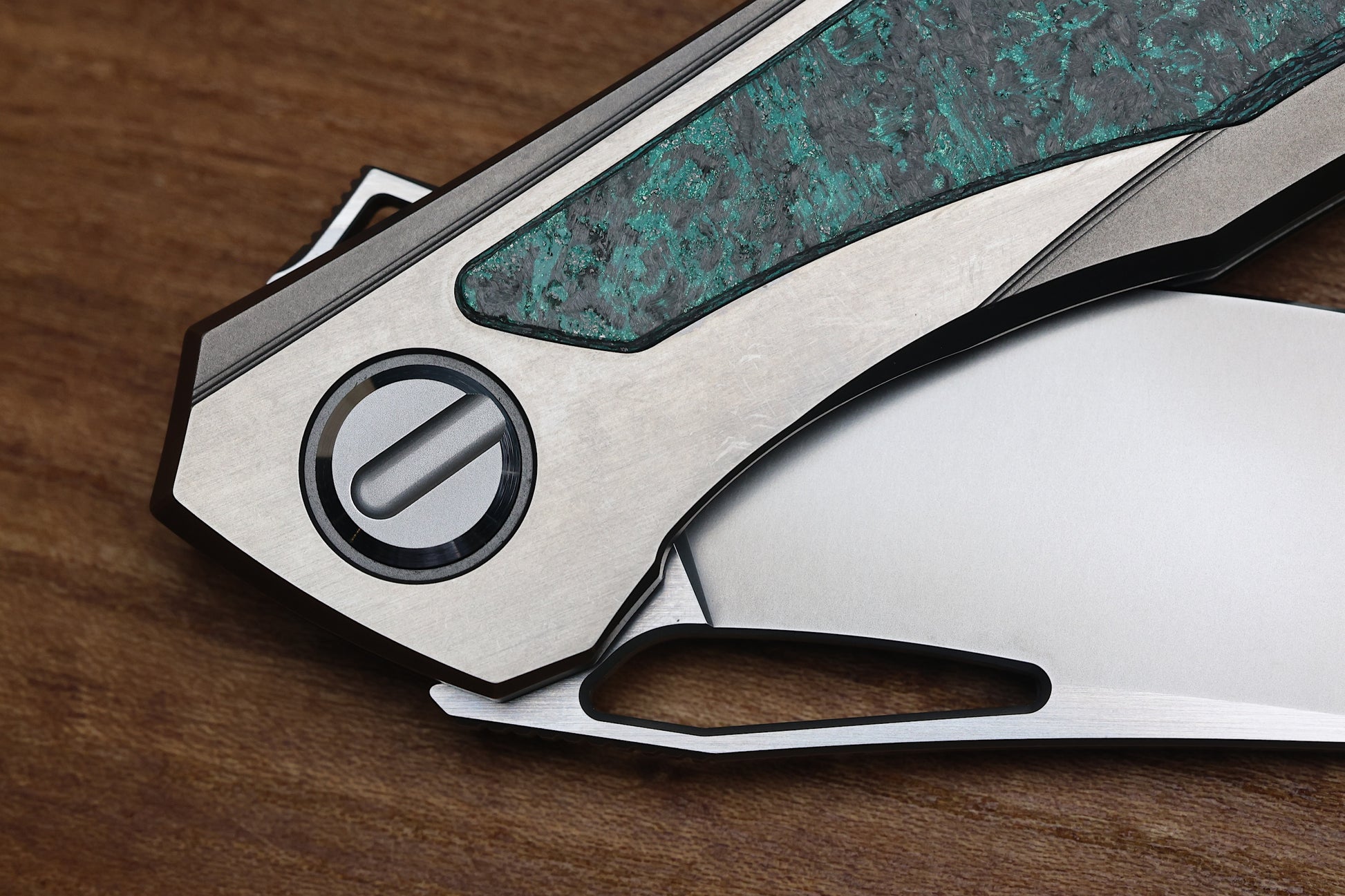 - Stonewashed/polished flats Titanium frame lock handle scales with Teal Magnetic CarboTi inlays- Pattern may vary