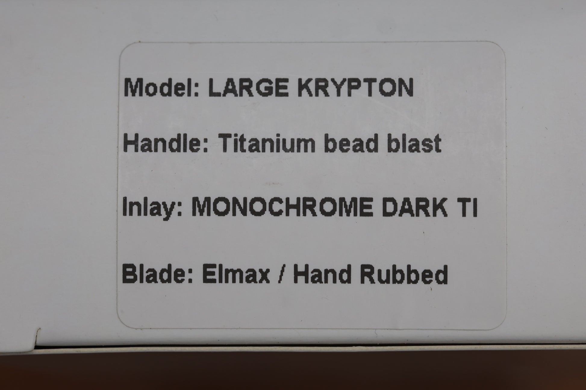 TASHI BHARUCHA LARGE KRYPTON W/ LEE WILLIAMS KICKSTOP TITANIUM HANDLE W/ MONOCHROME DARK TIMASCUS INLAYS & ELMAX